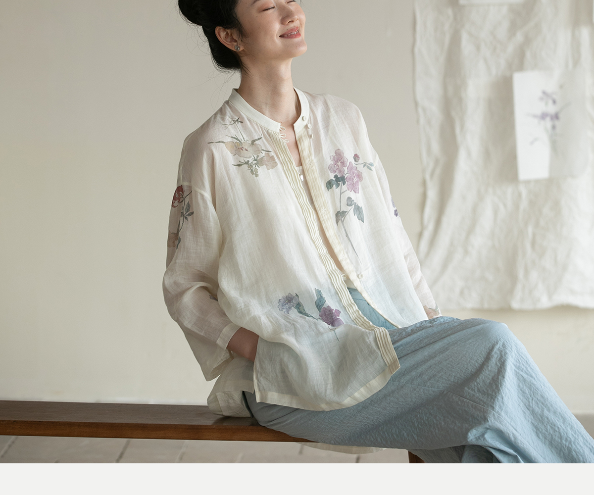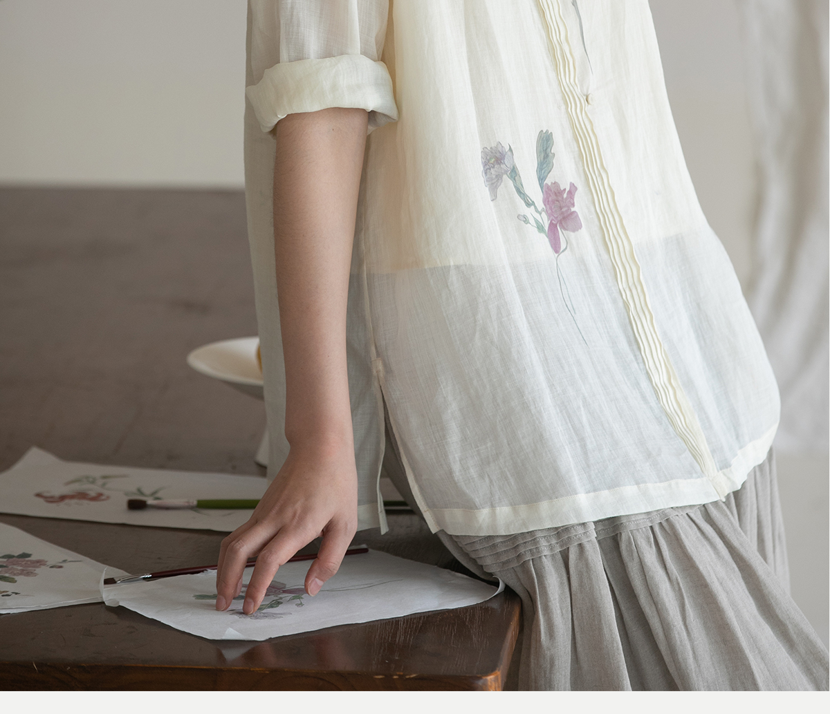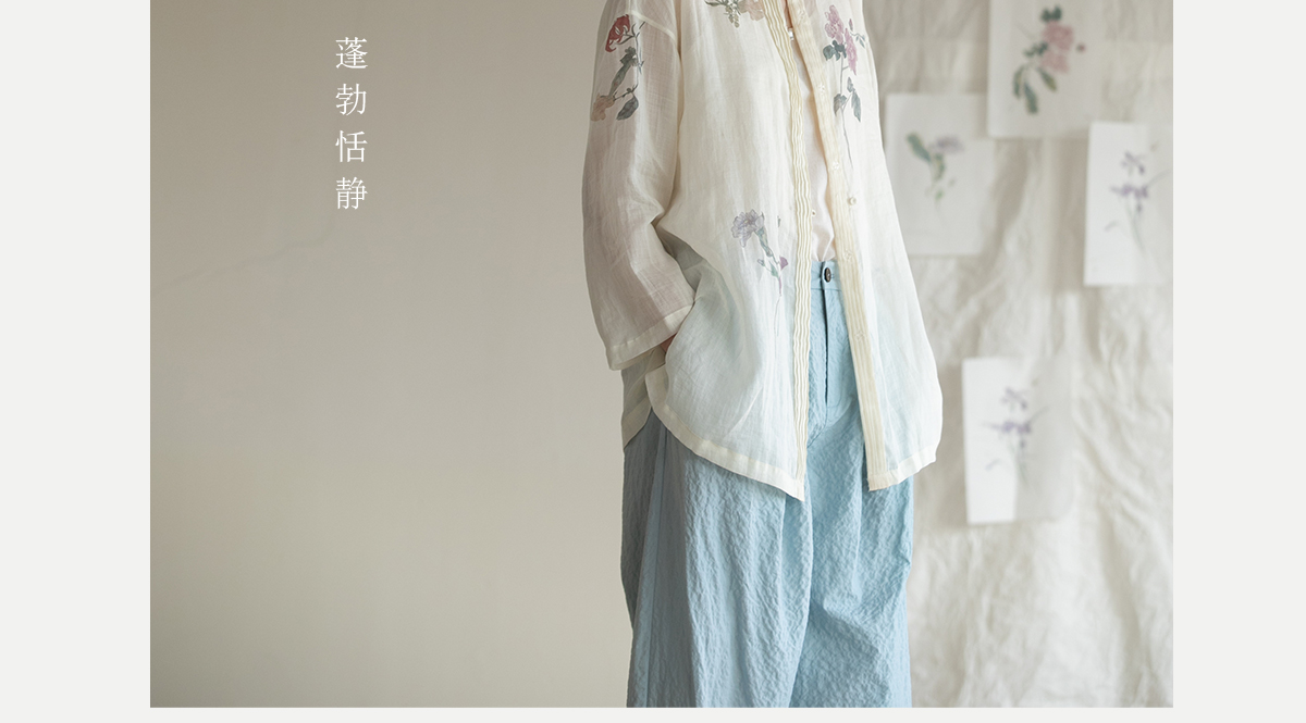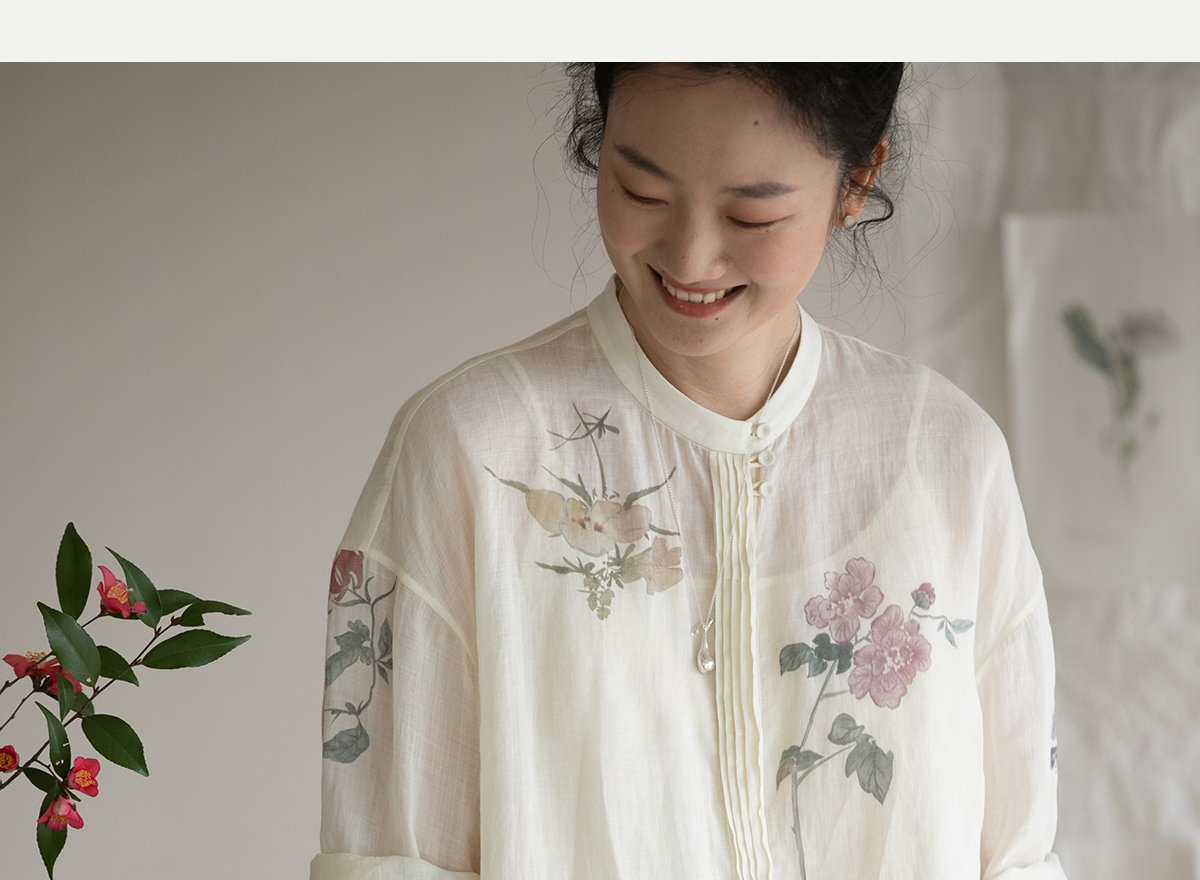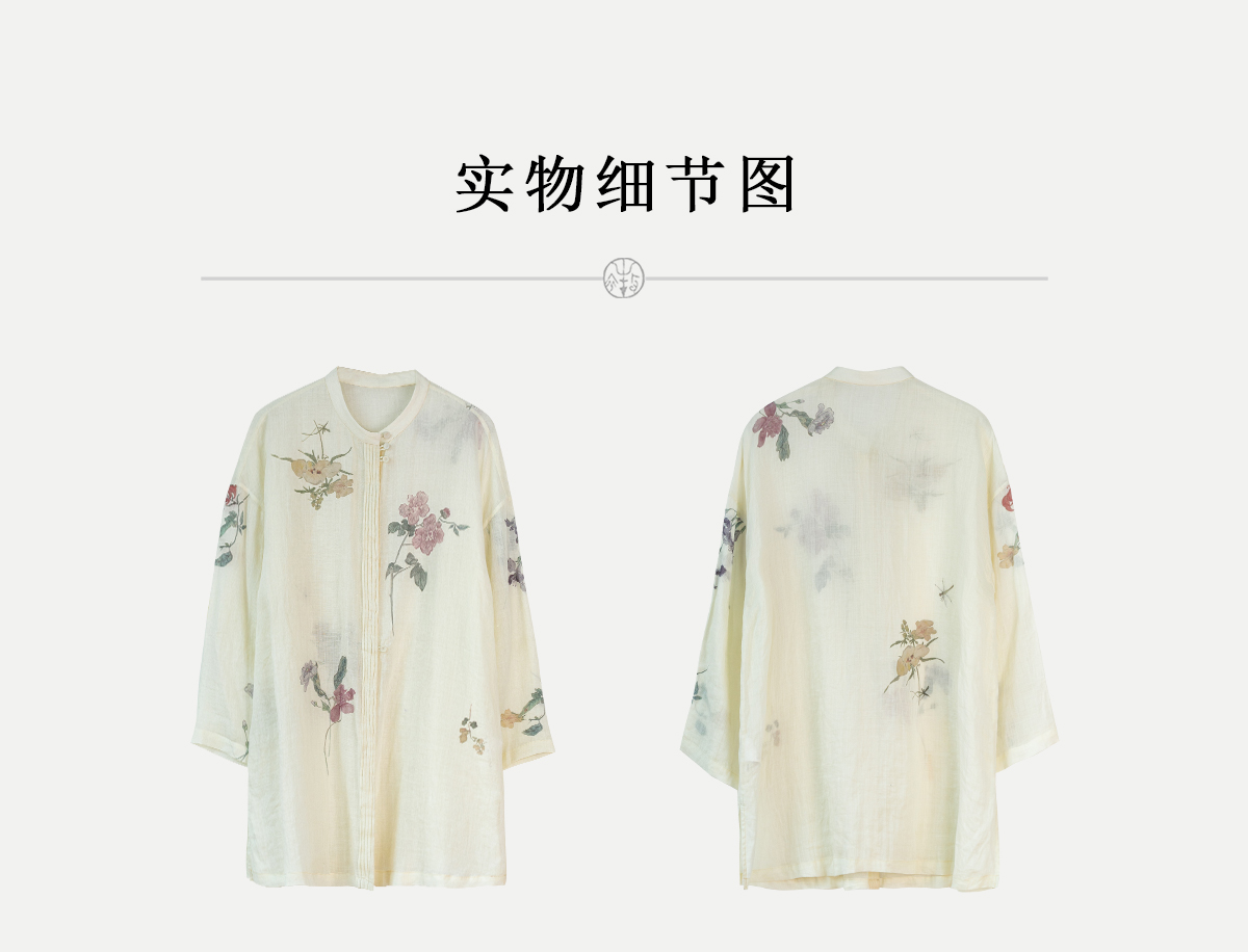 牧衣游原创 手工刺绣苎麻衬衫新款细腻轻薄百搭国画文艺衬衣 绿野