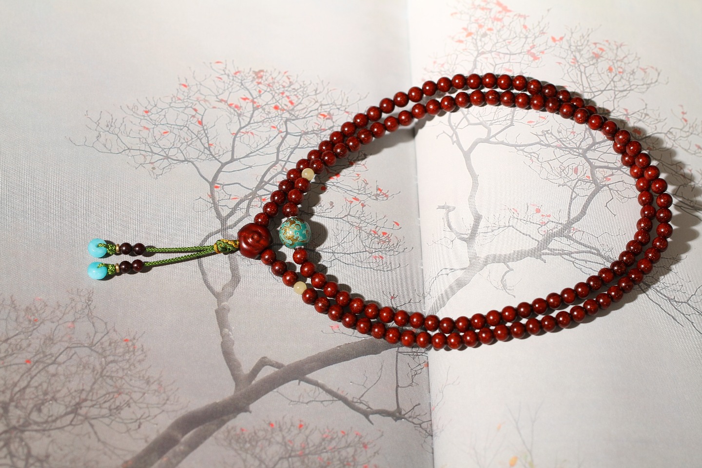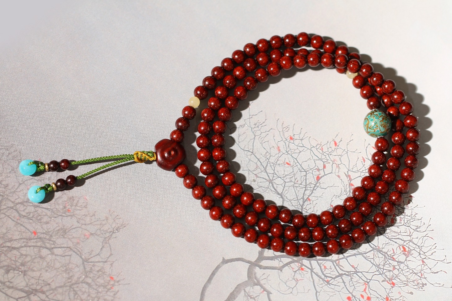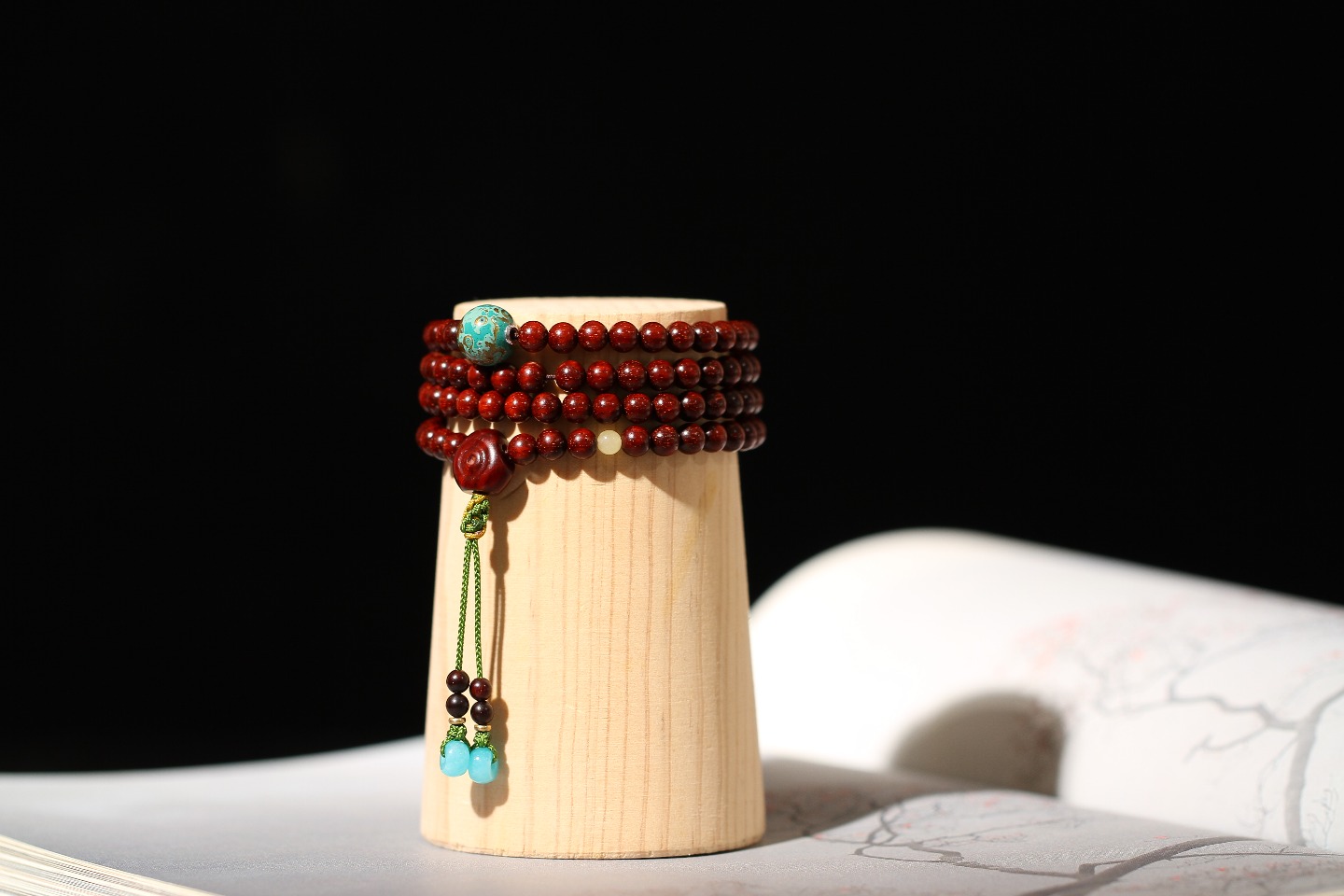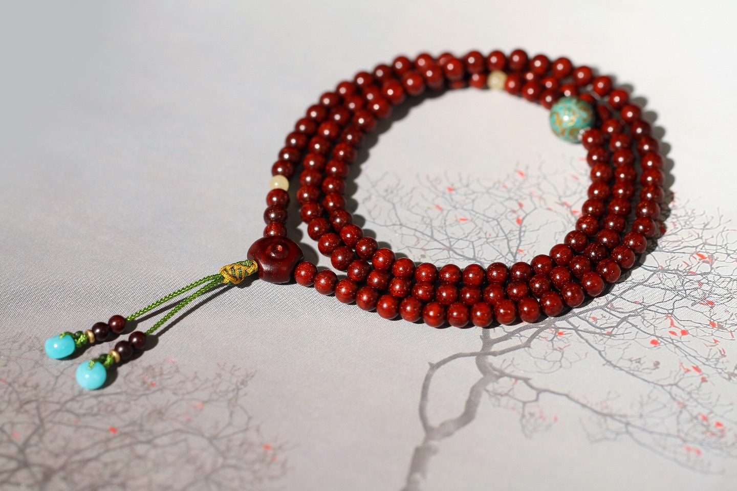 搭配:印度小叶紫檀为主,搭配大漆,蜜蜡,紫檀圆缺三通,天河石隔片。