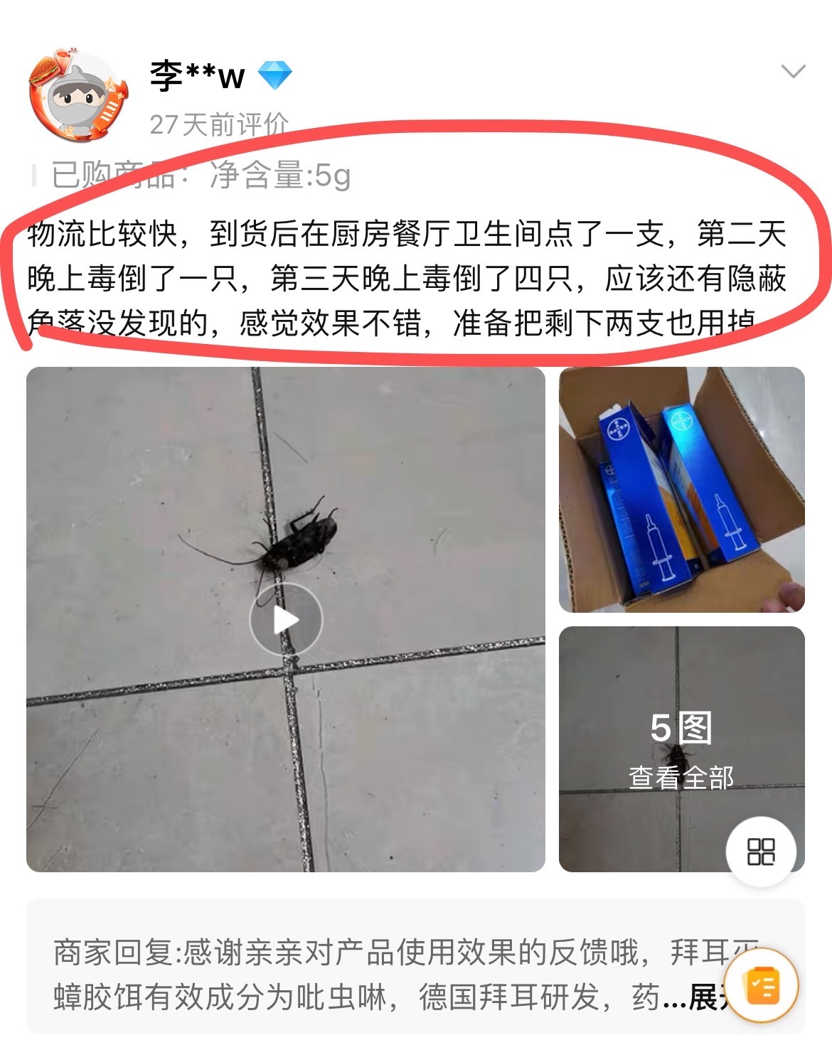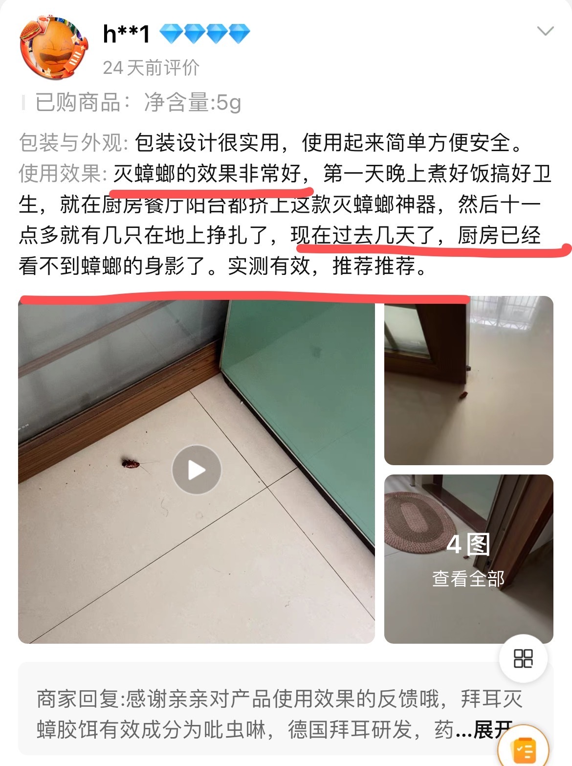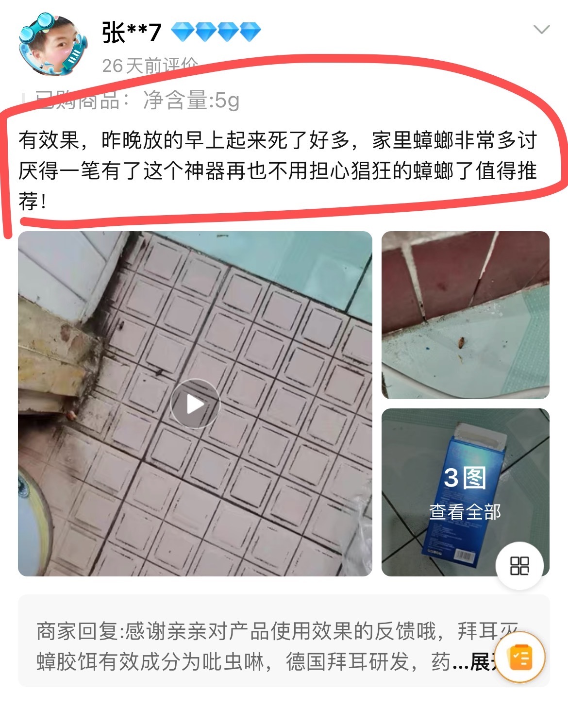 ️使用体验:白色药点,干净卫生无污染,灭蟑不留尸。