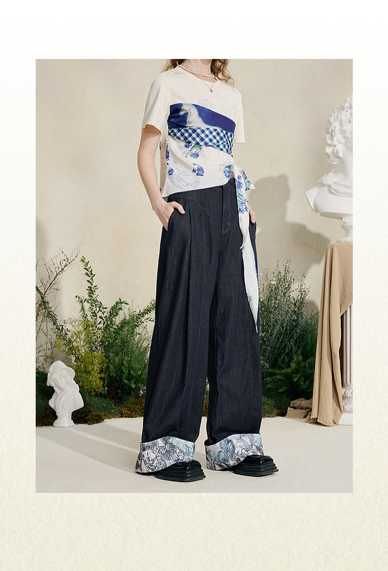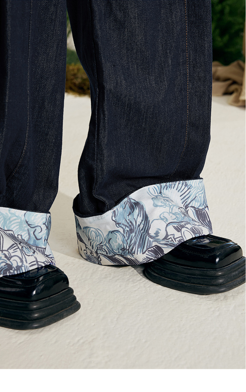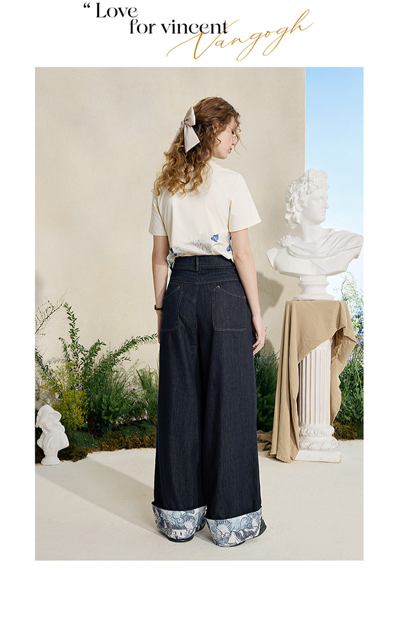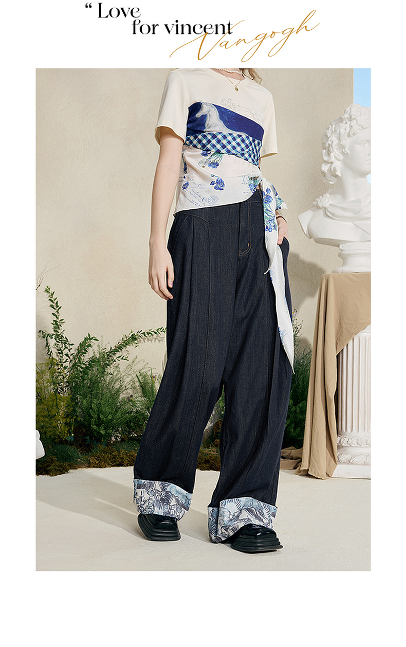 两三事梵高文艺星空夜宴2025夏新款休闲印花翻边裤脚直筒牛仔裤女