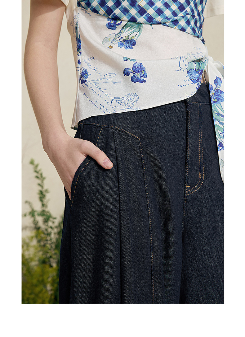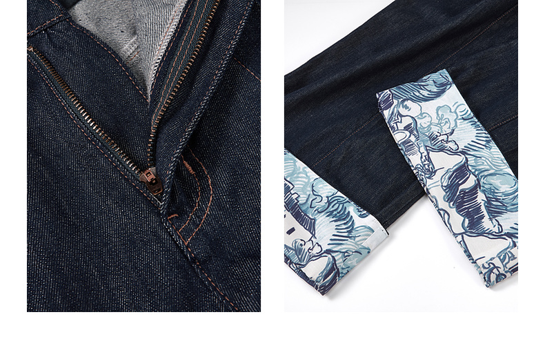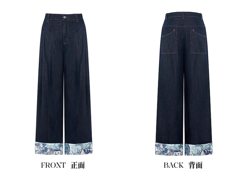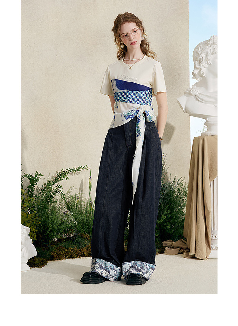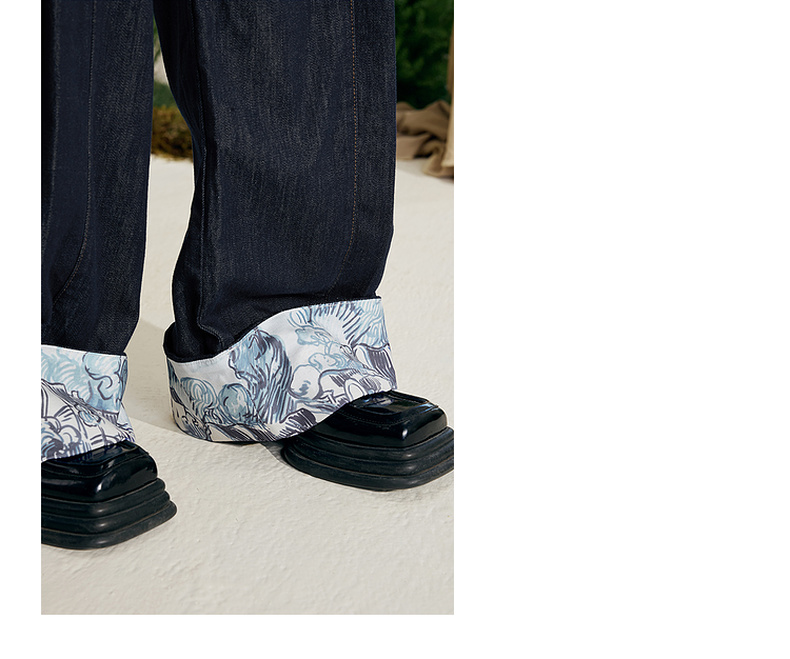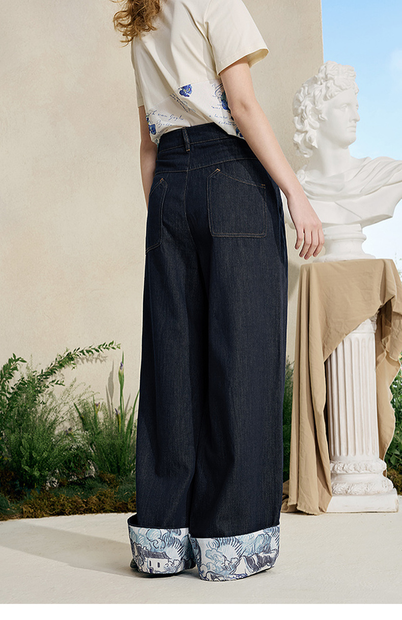 两三事梵高文艺星空夜宴2025夏新款休闲印花翻边裤脚直筒牛仔裤女