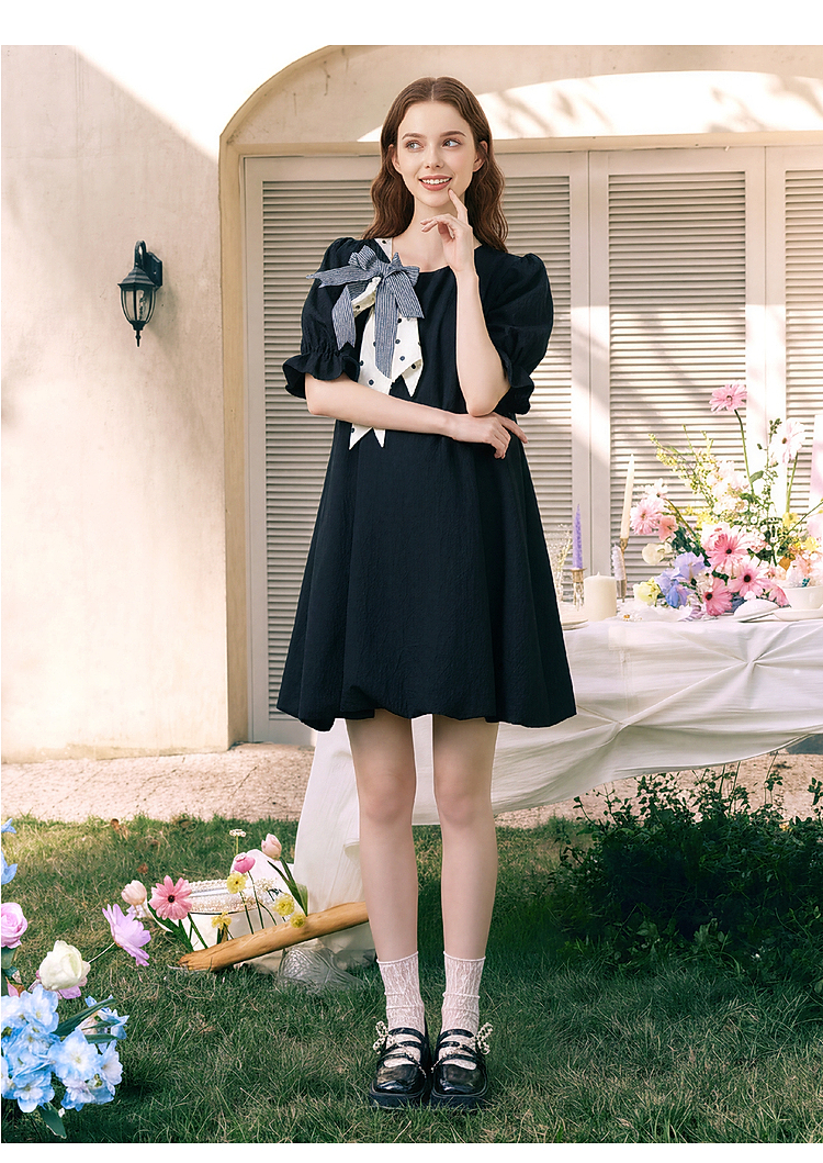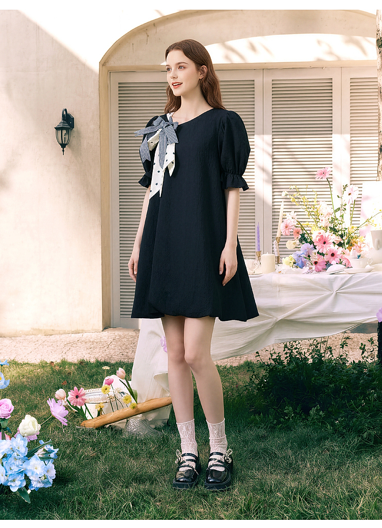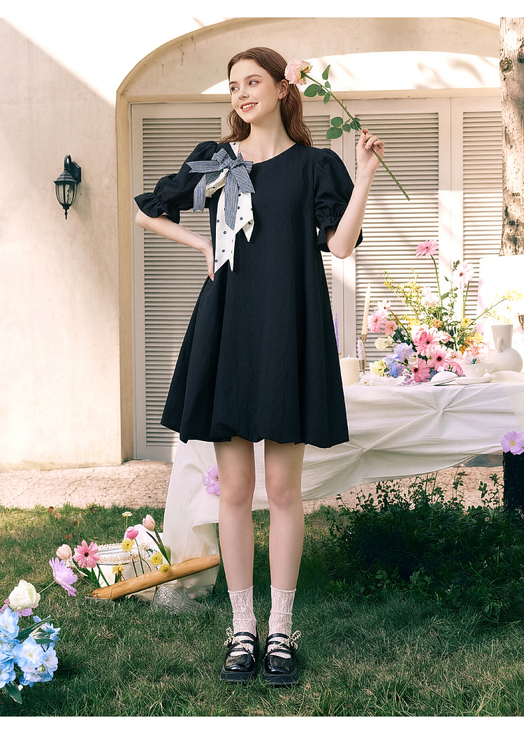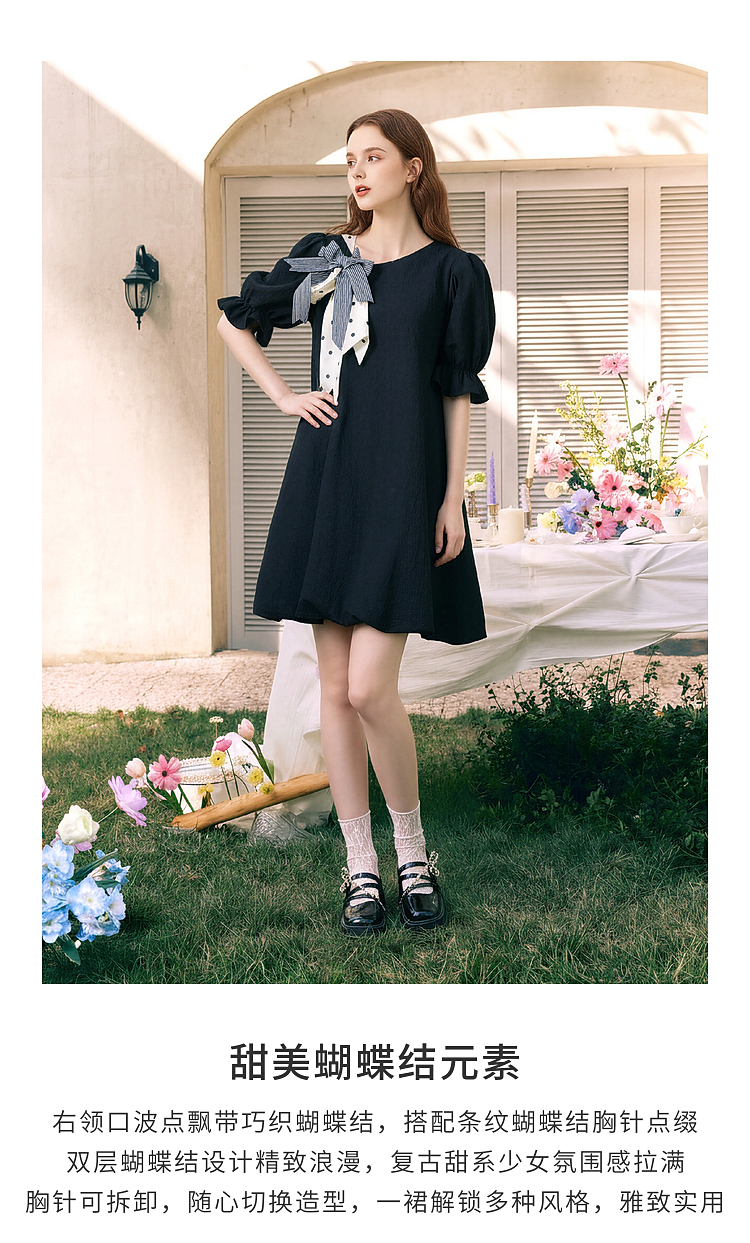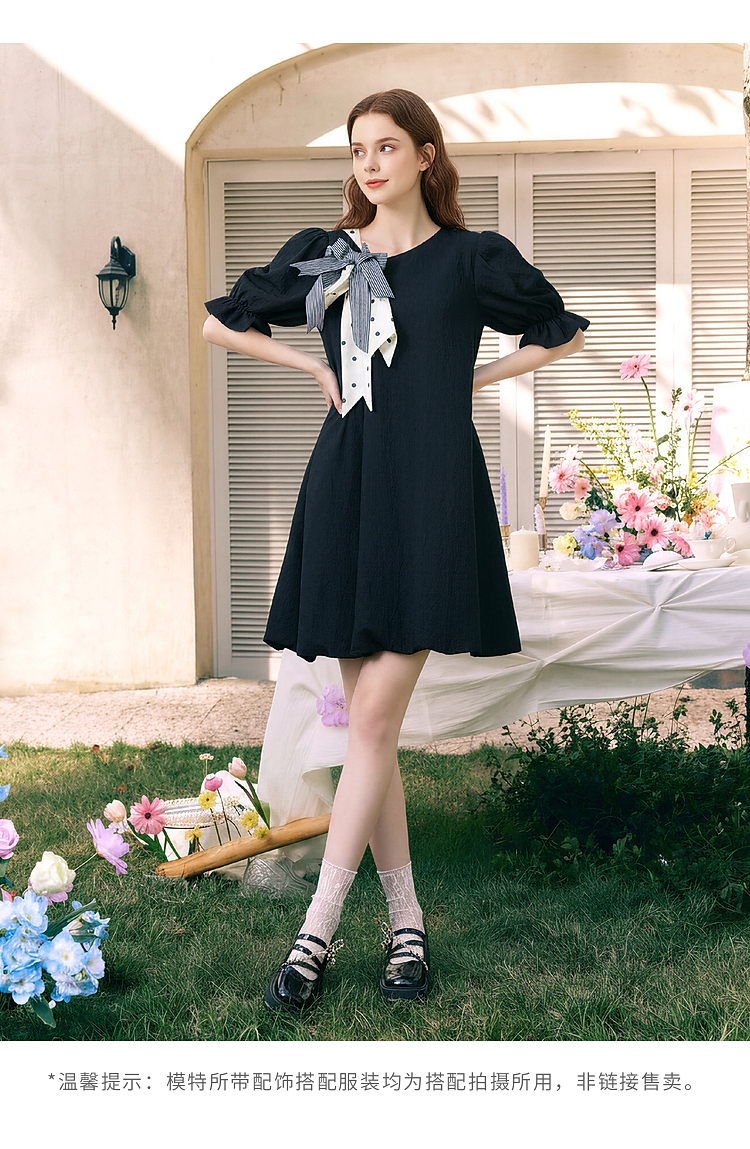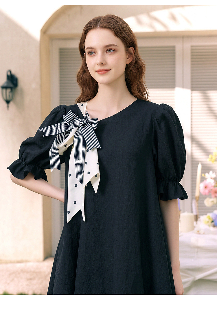 两三事欢愉记号2026春季新款条纹波点蝴蝶结波浪裙摆泡泡袖连衣裙