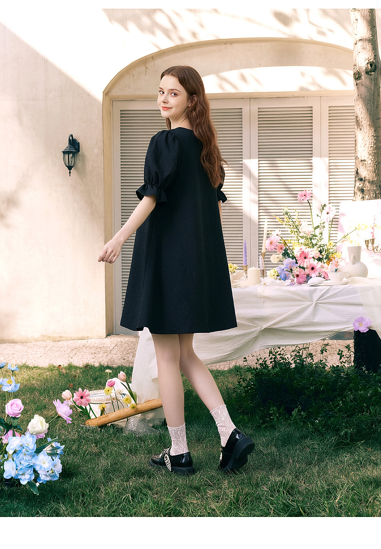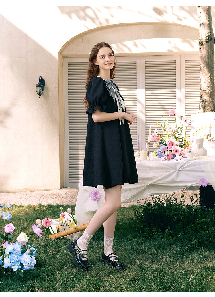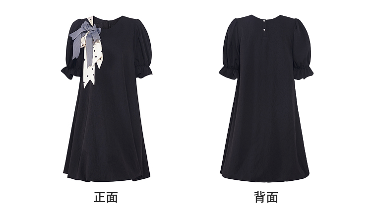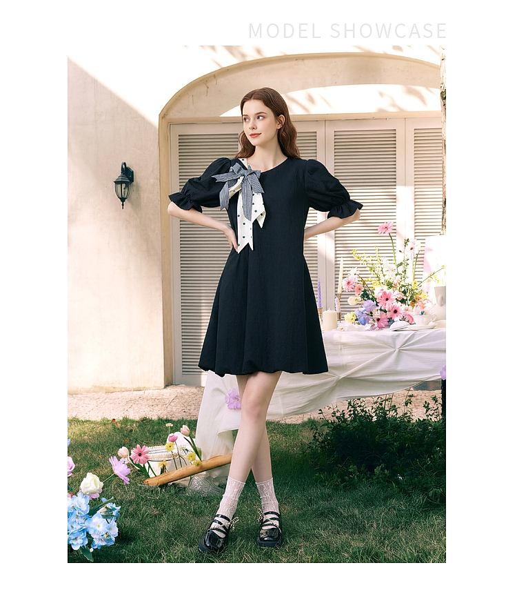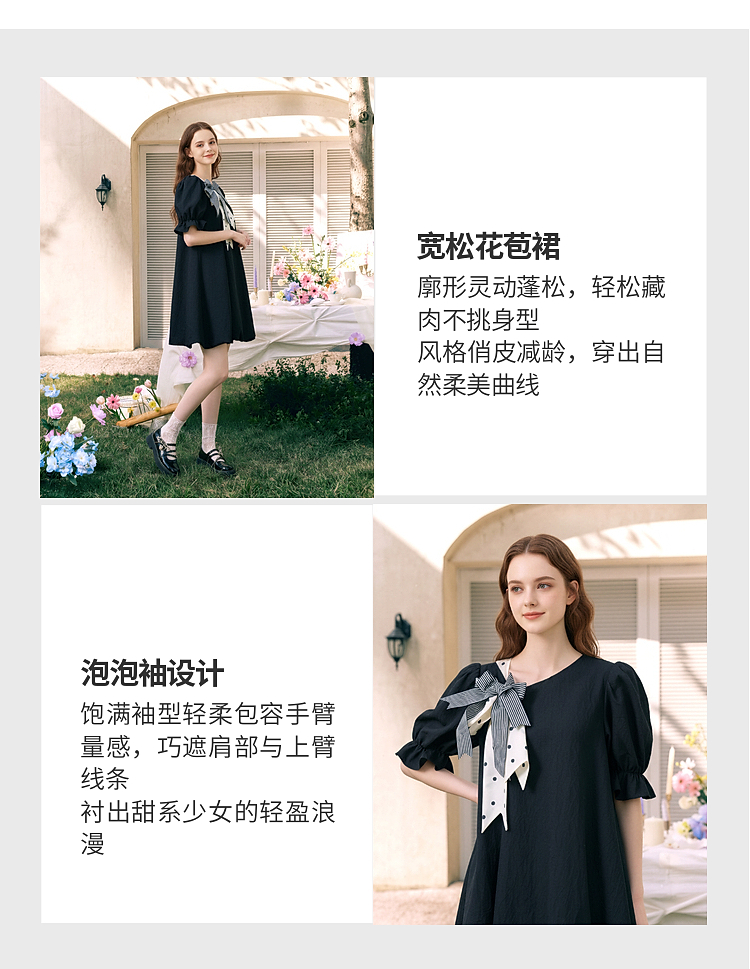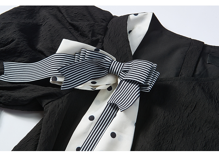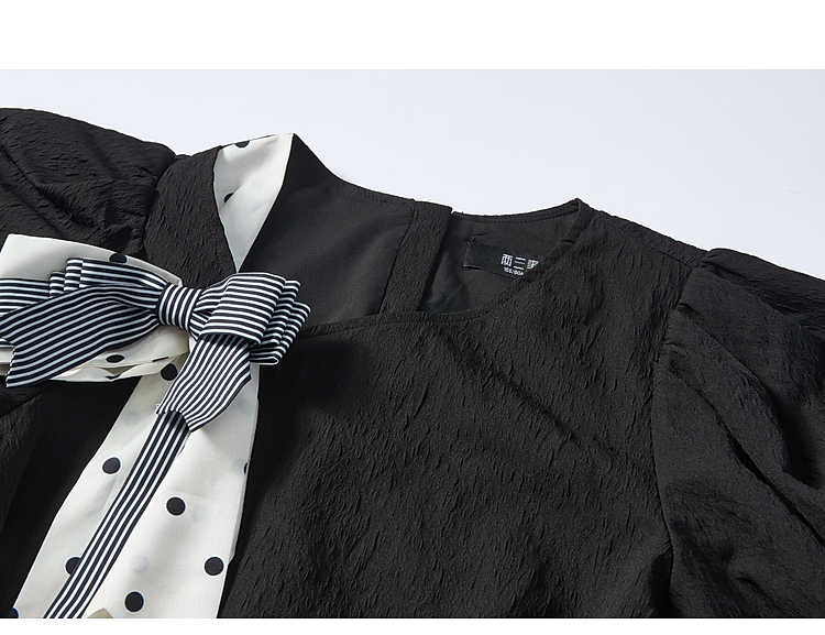 两三事欢愉记号2026春季新款条纹波点蝴蝶结波浪裙摆泡泡袖连衣裙