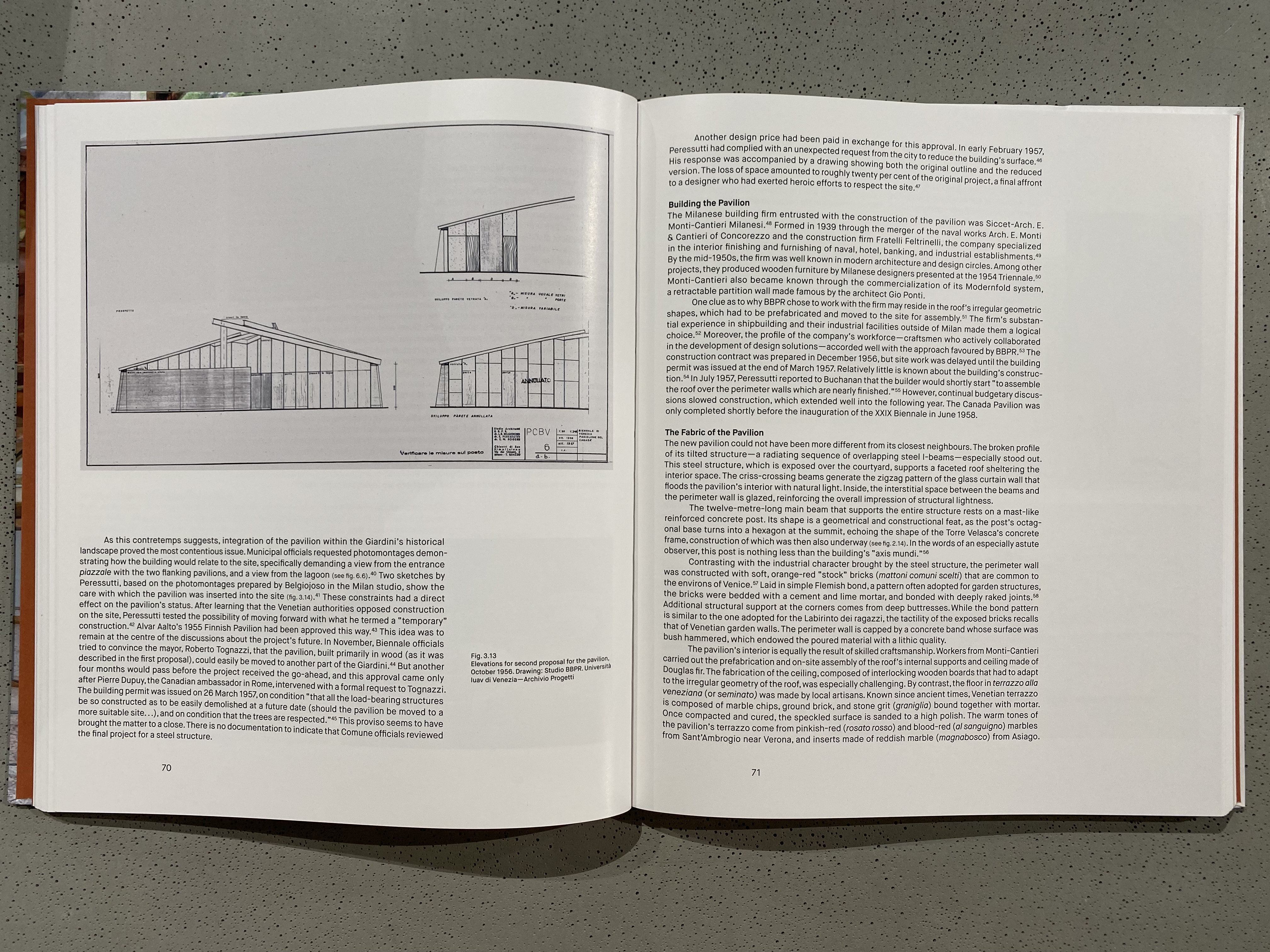 The essays of the various contributors to the book analyse the cultural and political context in which the Canada Pavilion committee worked (Cammie McAtee); the concept and construction of the building and the links with the architect Enrico Peressutti and the BBPR partnership (Réjean Legault); the pavilion's role in the postwar Italian cultural context (Serena Maffioletti) and its fortunes from its inauguration in 1958 to the restoration in 2018 (Josée Drouin-Brisebois); the restoration project itself (Susanna Caccia Gherardine), and, lastly, the relationship between the Canada Pavilion and the Biennale Gardens (Franco Panzini).