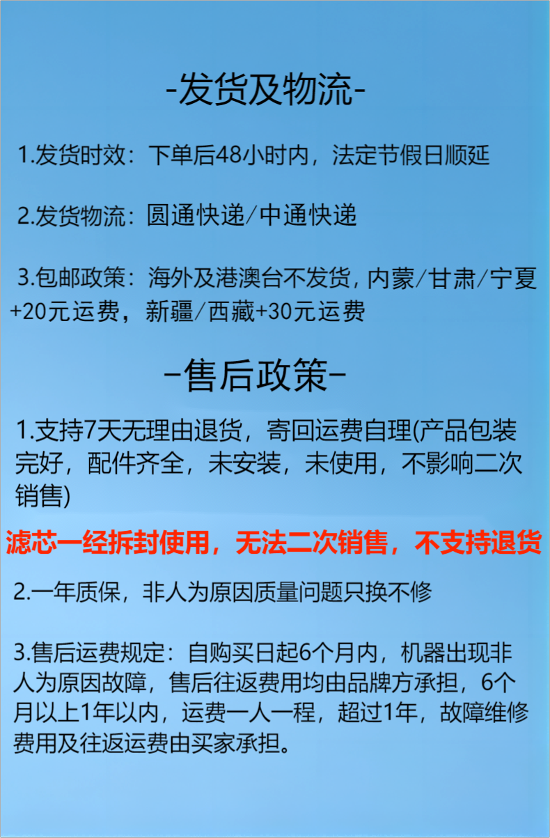 滤芯一经拆封使用,无法二次销售,不支持退货,