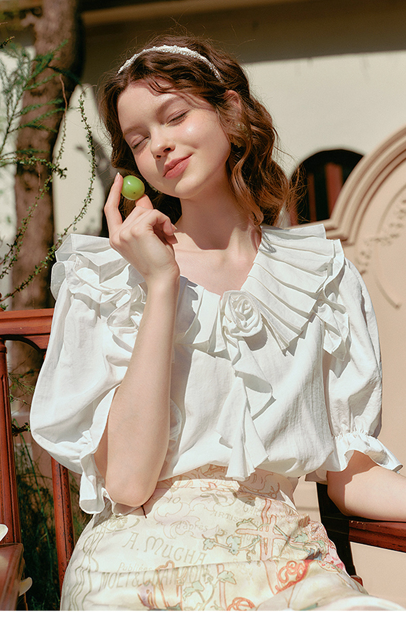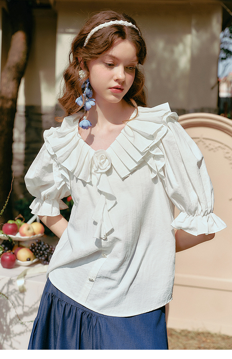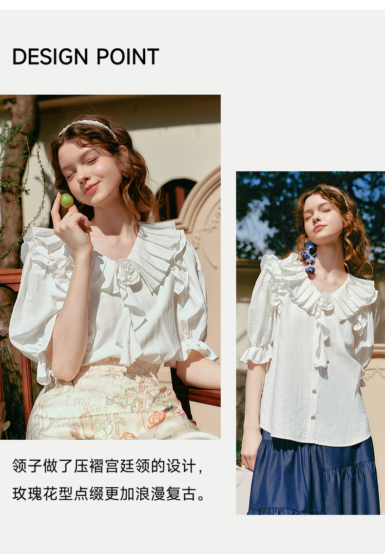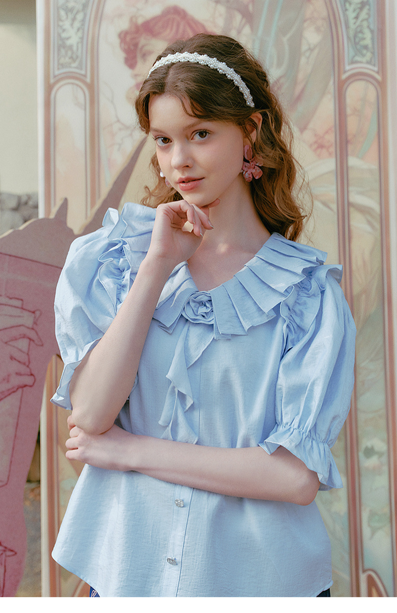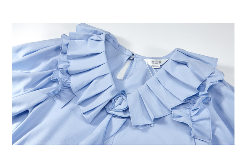 两三事盐渍晴空2025春季新款压褶翻领立体花朵荷叶边泡泡袖衬衫女
