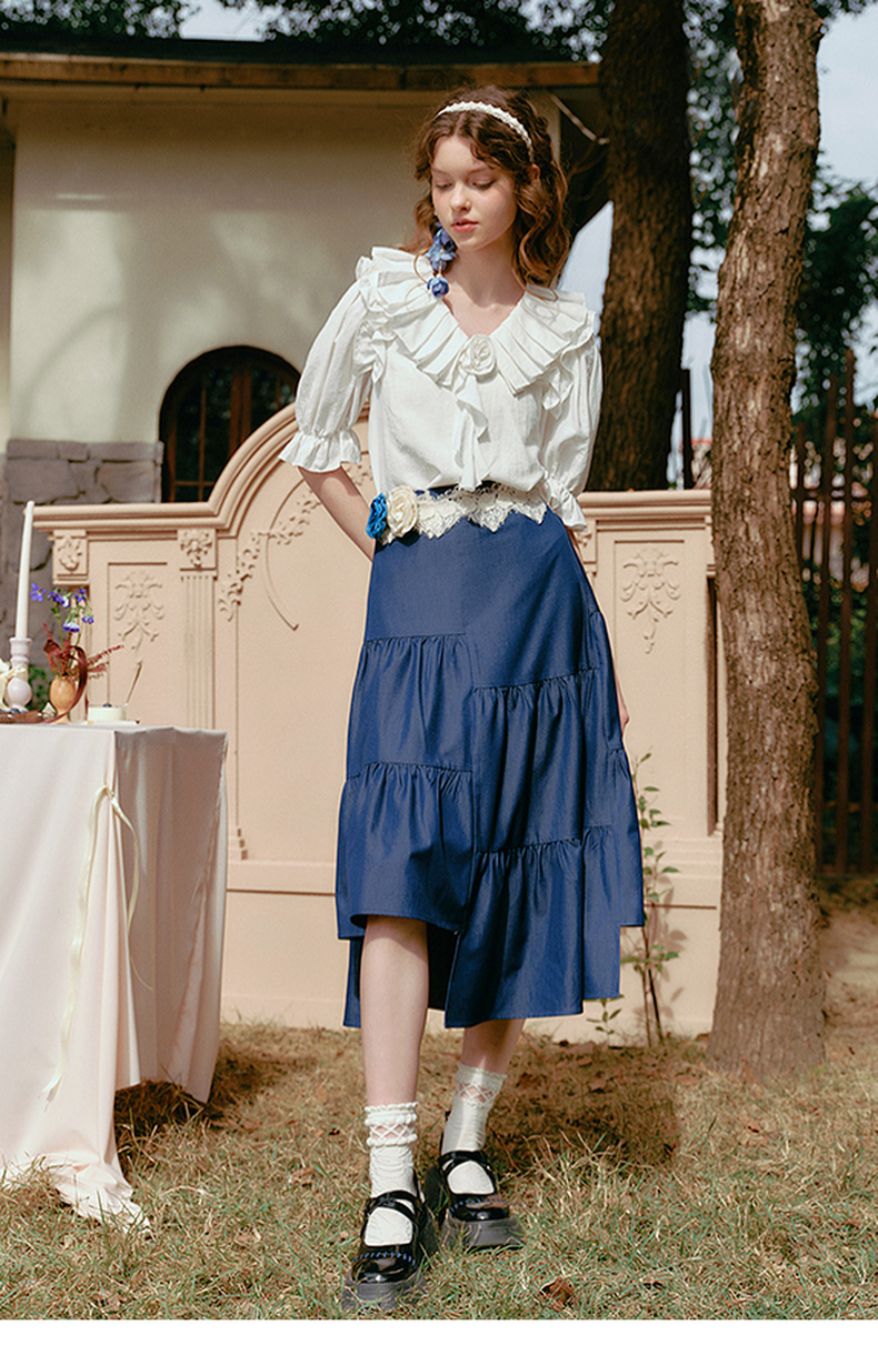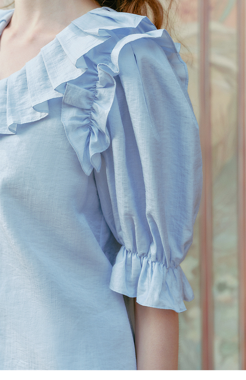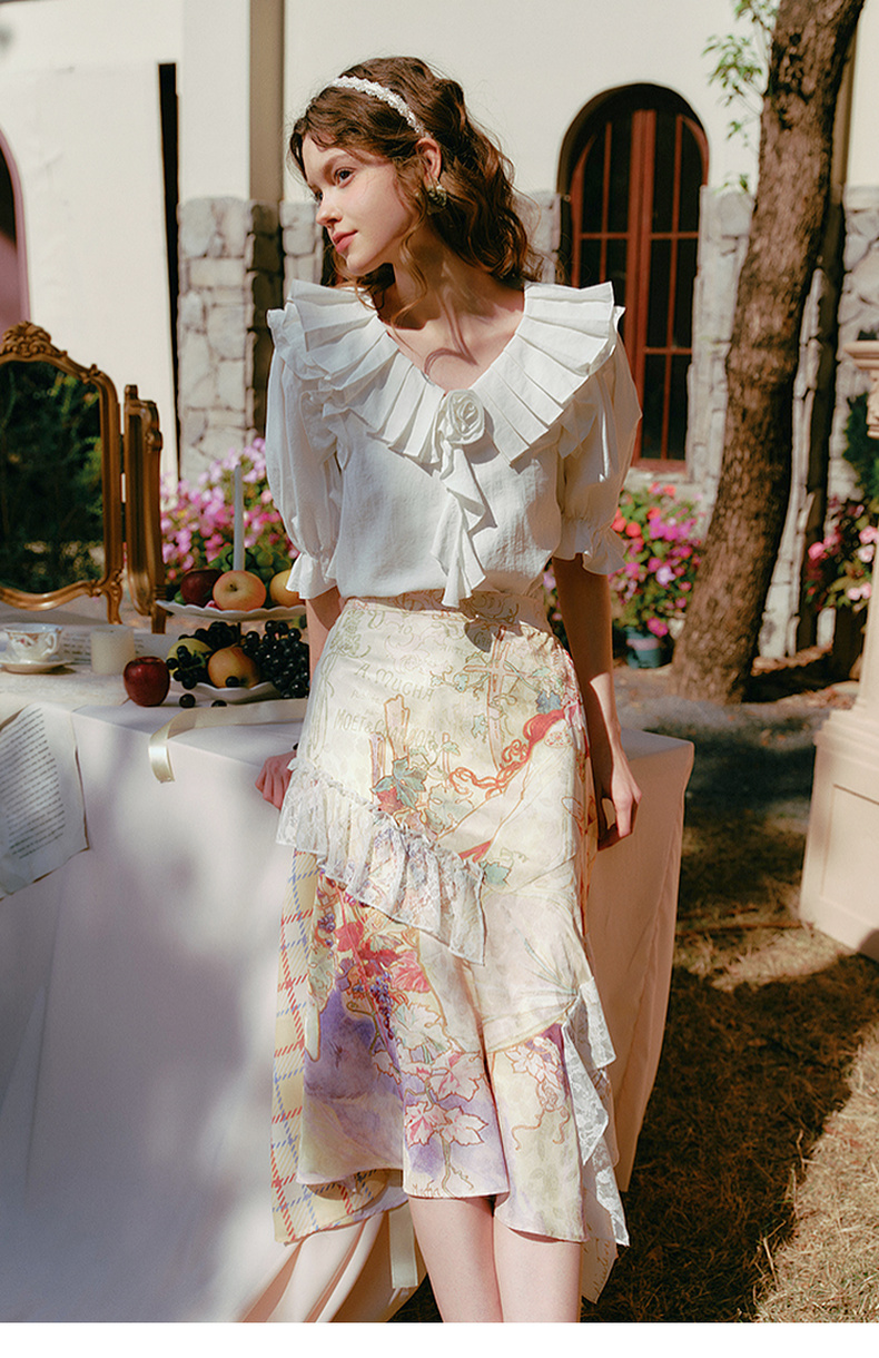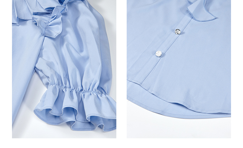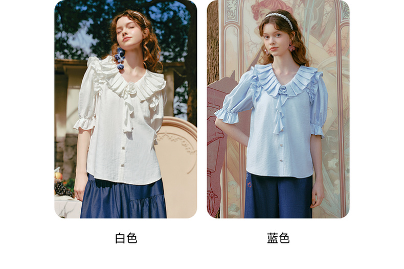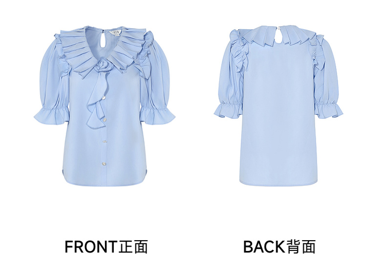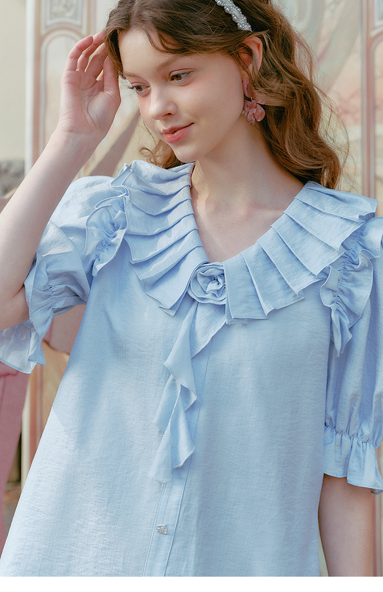 两三事盐渍晴空2025春季新款压褶翻领立体花朵荷叶边泡泡袖衬衫女