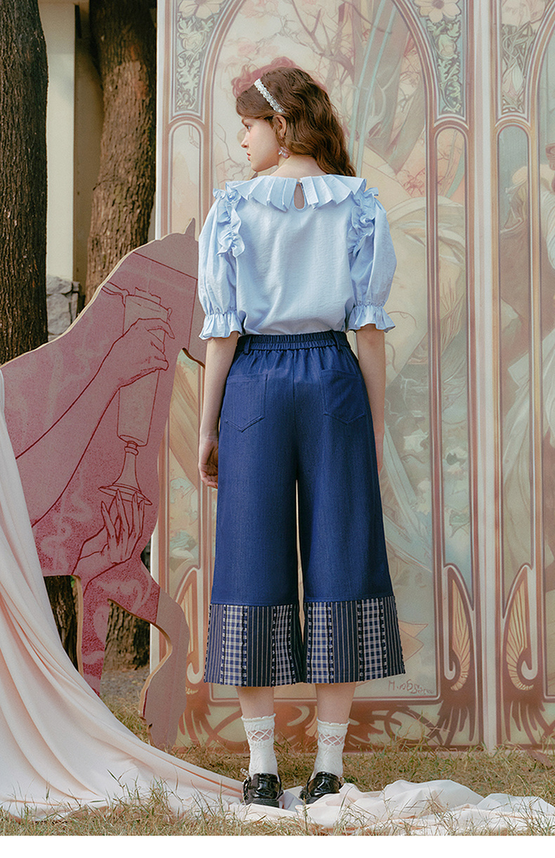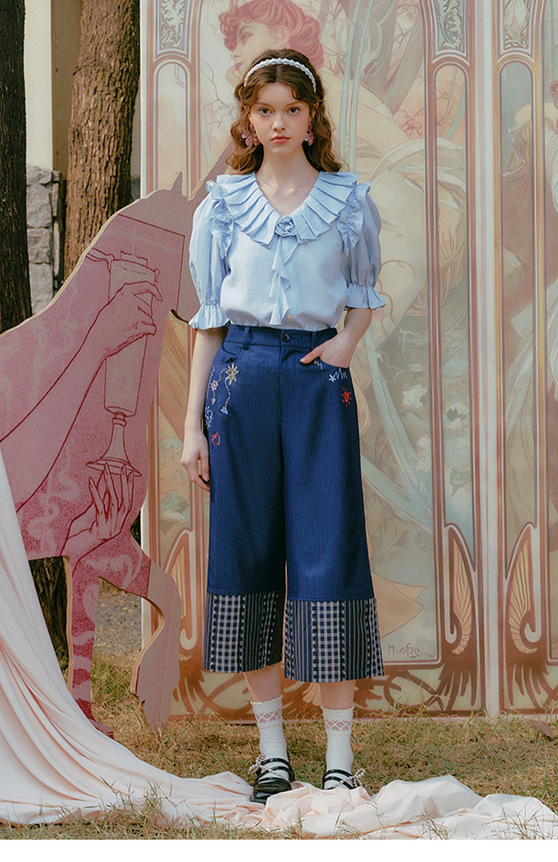 两三事 花间浅染 2025春季新款双层蕾丝拼接裤脚绣花直筒牛仔裤女