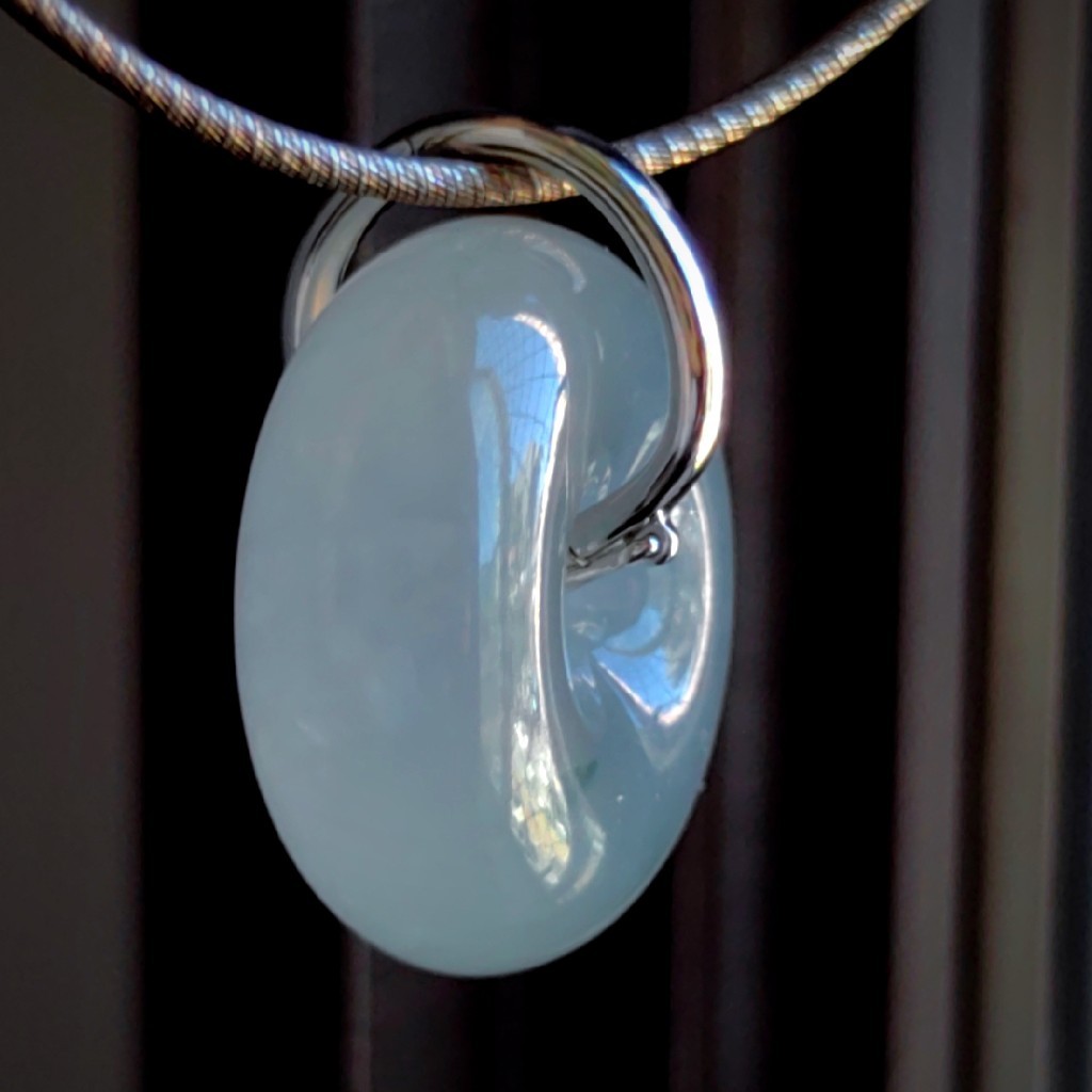 在镶嵌上,因翡翠料足,器型、弧度、优美简约,所以无需做过多复杂的衬托。我们只做了简洁大方的活扣卡子来装点,就可以凸显翡翠圆胖子的优点。活扣卡子可以随时打开,这样胖胖既可以搭配项链,也可以搭配绳艺,可谓一物多用了。