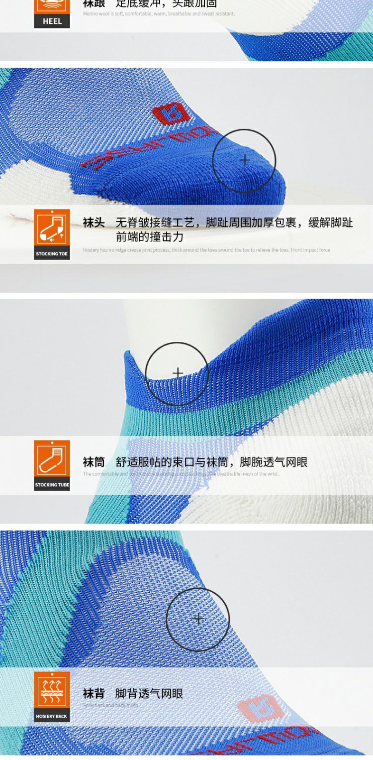 脚底和脚尖都有毛圈加厚,高强度运动和徒步不容易起水泡,减震效果非常不错。彩条上有透气带,方便散热排汗。整体结构复杂,工序繁琐,造价很高。