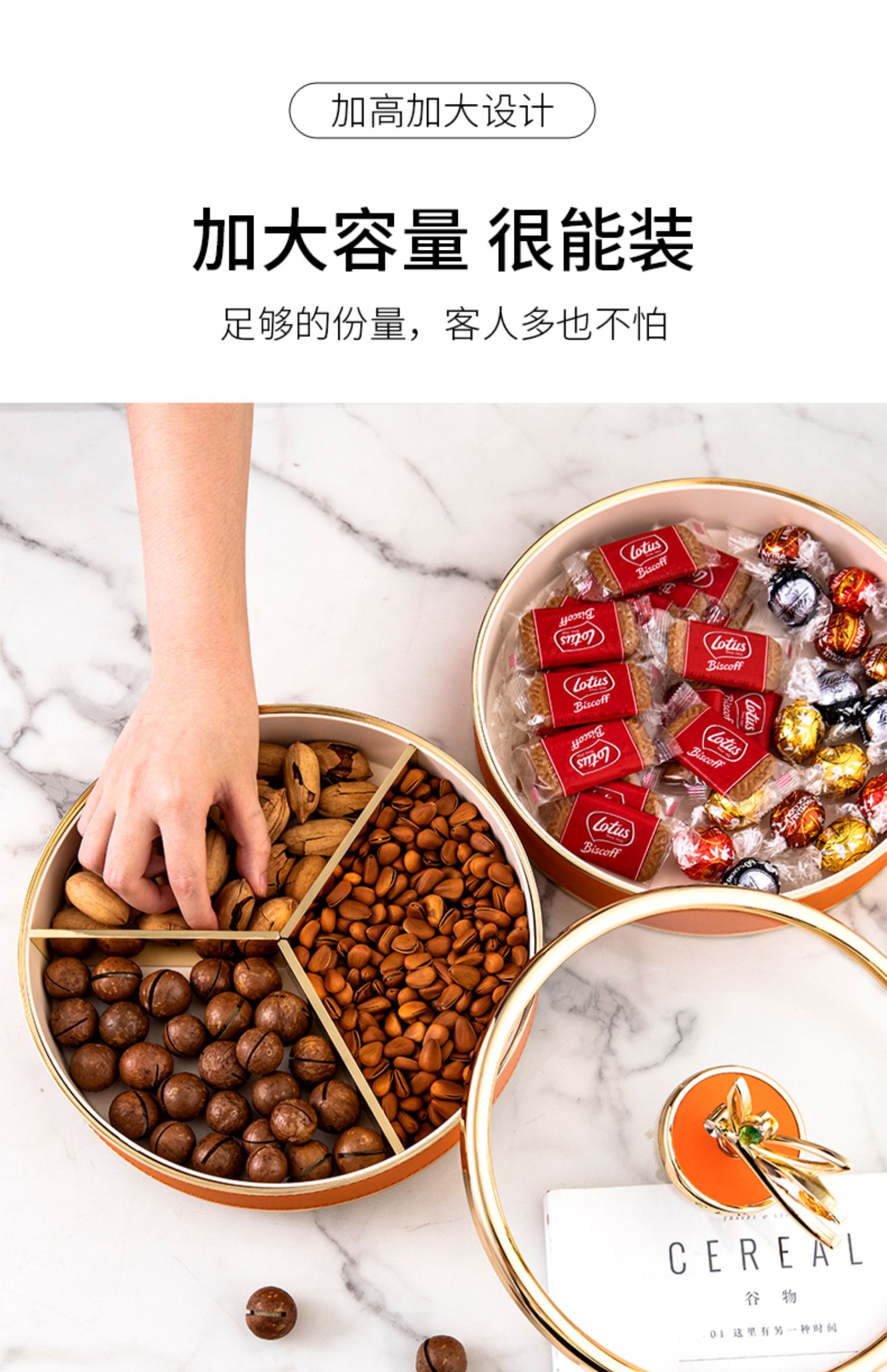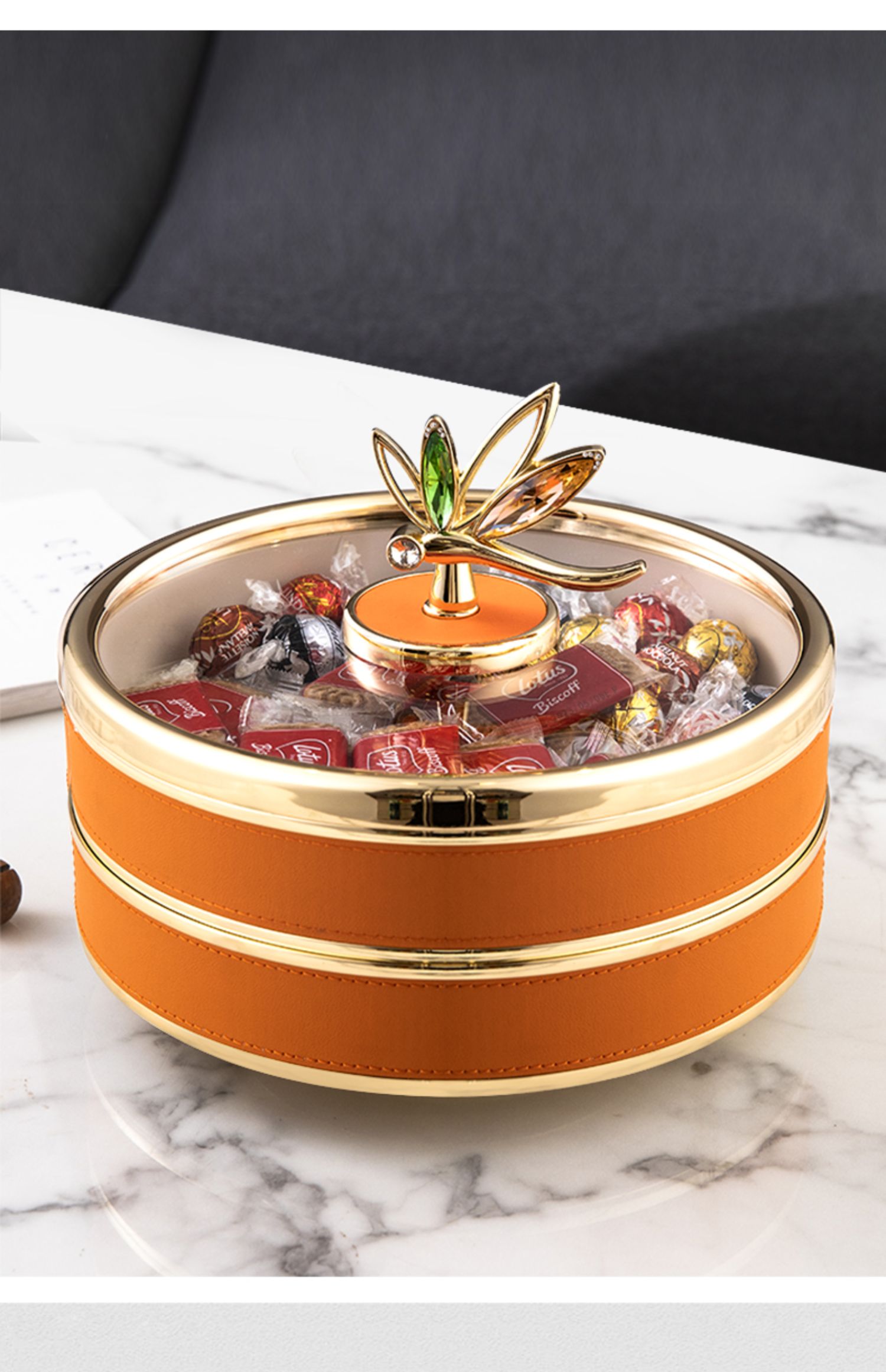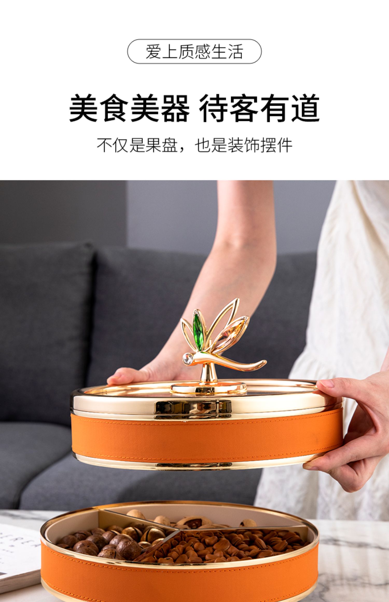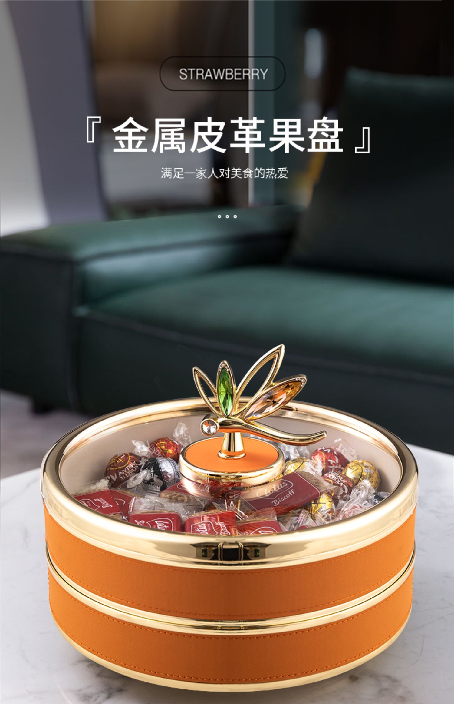 高档轻奢密封干果收纳盒客厅茶几水果盘双层旋转点心盒零食糖果盒珐琅彩蜻蜓双层果盘 (合金+皮革款)