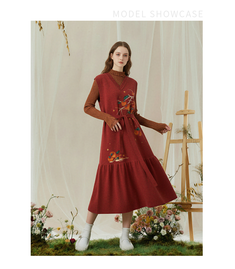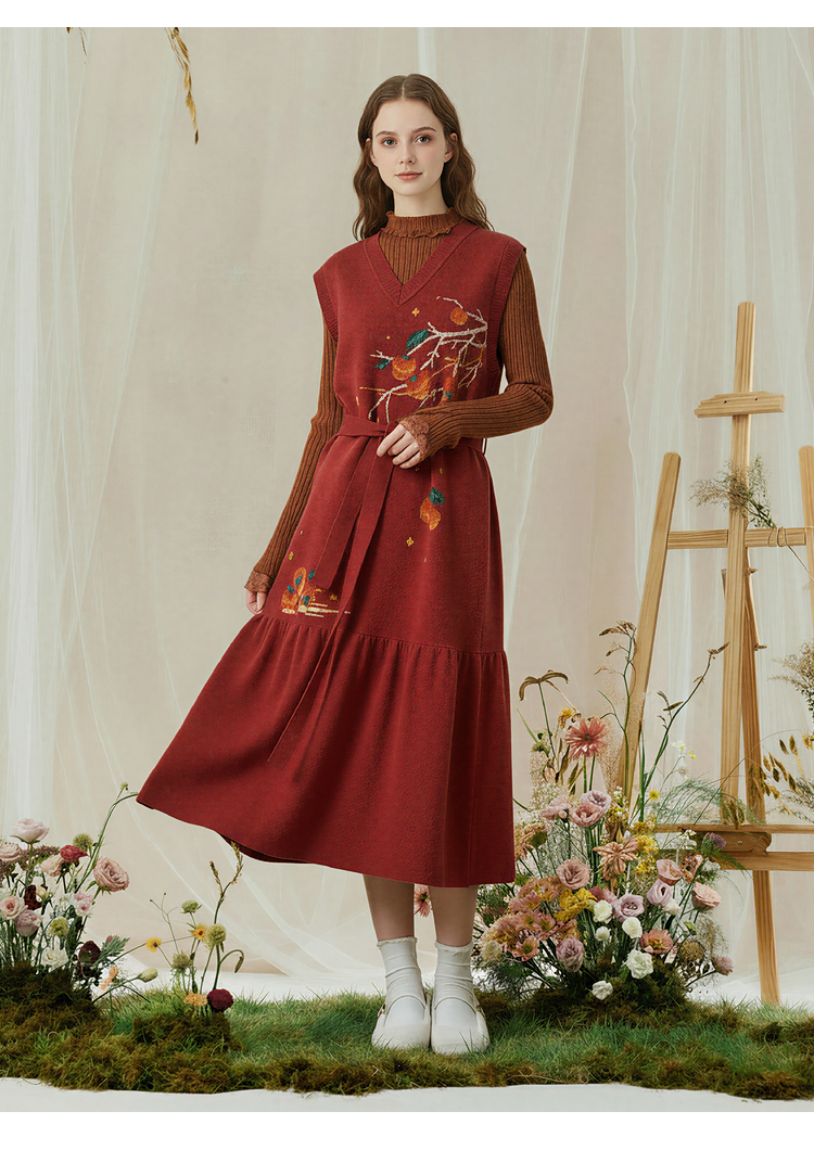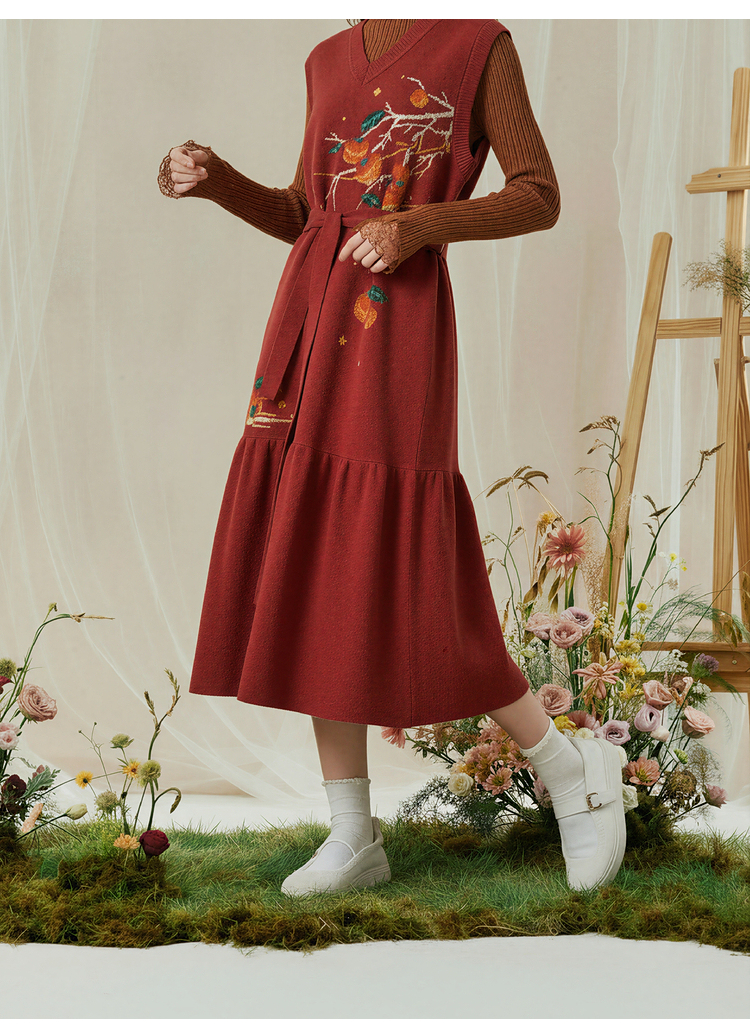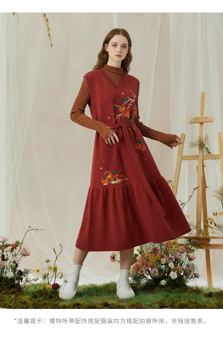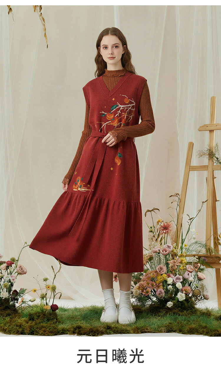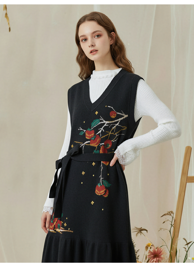两三事柿柿暖春2025冬季新款复古柿子树图案绑带毛衣背心裙连衣裙