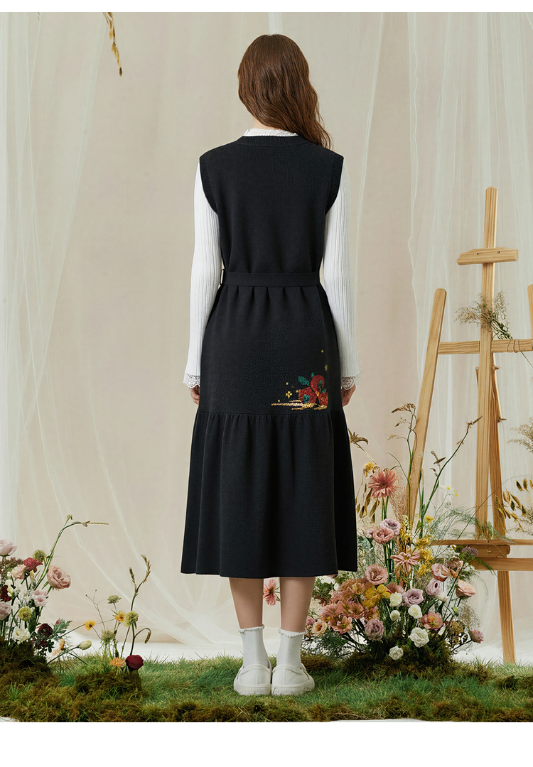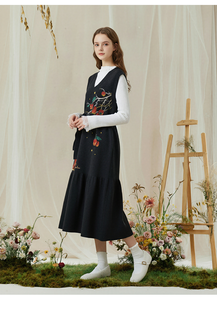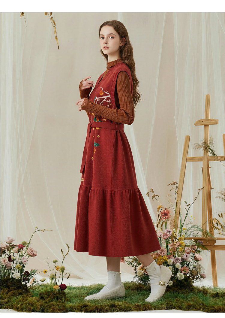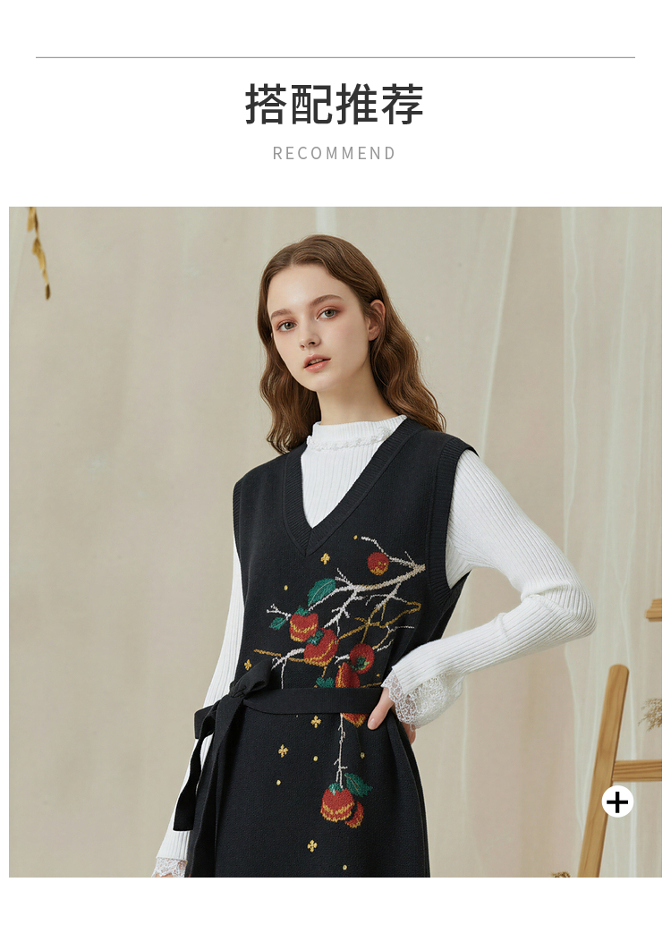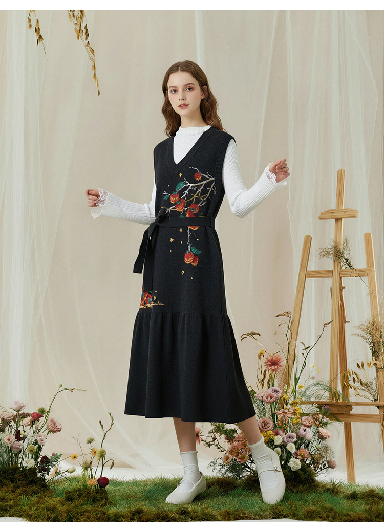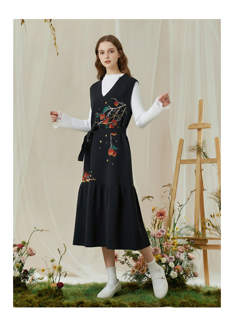 两三事柿柿暖春2025冬季新款复古柿子树图案绑带毛衣背心裙连衣裙