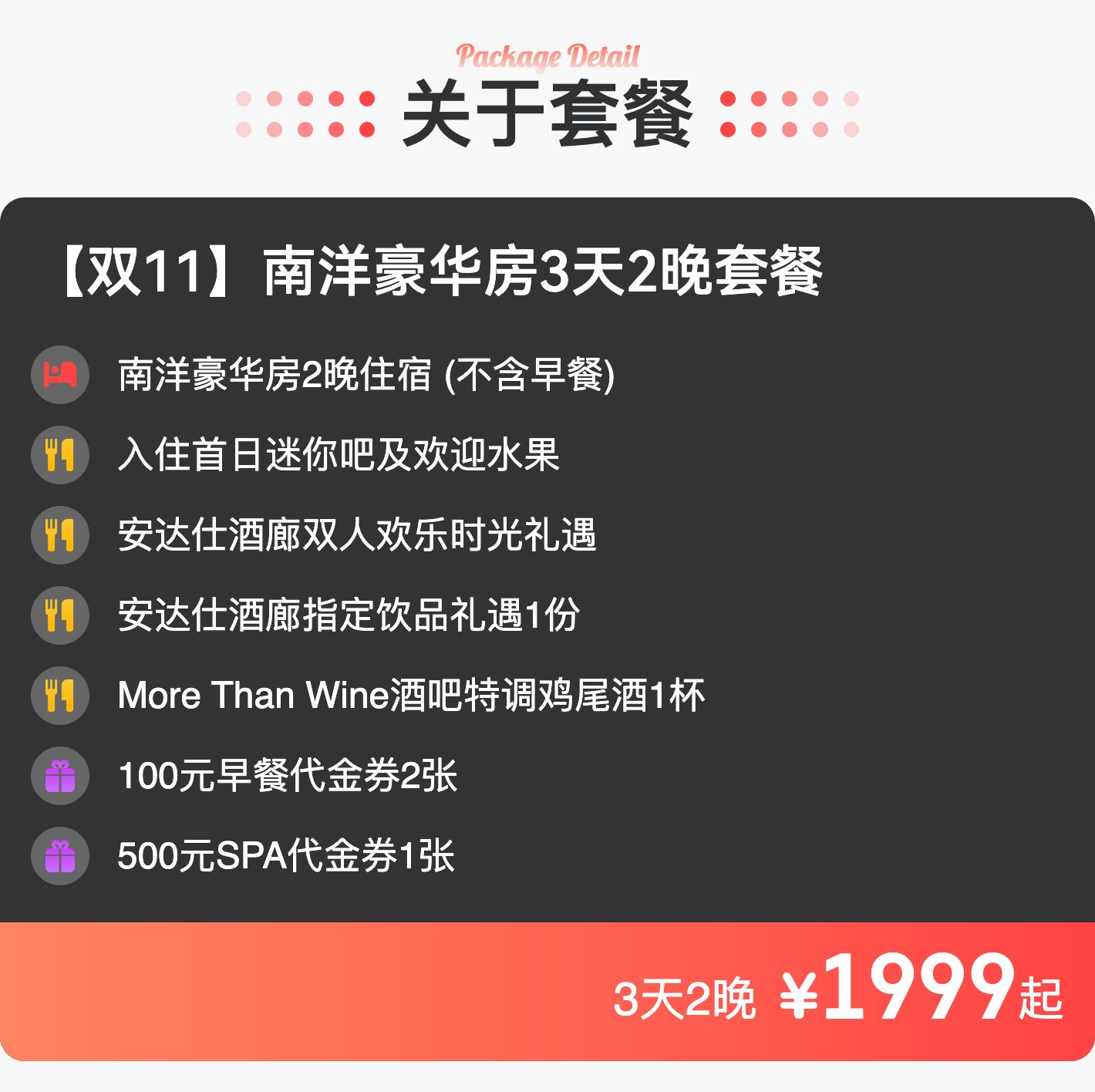 双11返场!3天2晚【厦门安达仕酒店】入住南洋豪华房,赠早餐代金券、SPA代金券,享安达仕傍晚欢乐时光、安达仕酒廊指定饮品礼遇等,住进南洋别墅,畅享放松假期~