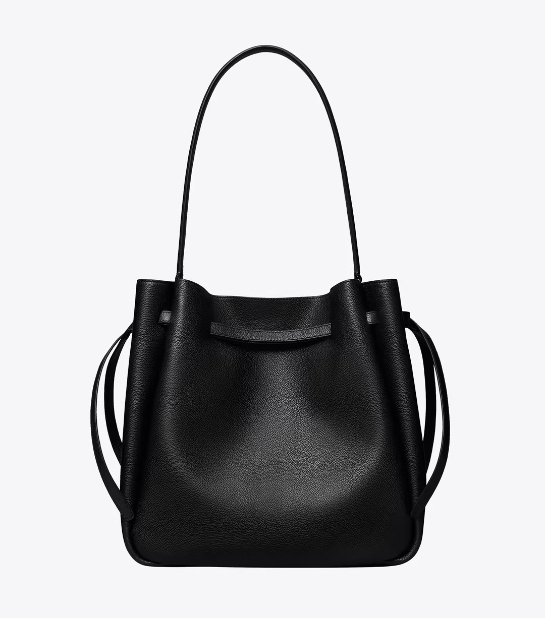 日常出行使用的理想之选。Romy 大号水桶包精选柔软皮革而制,廓形灵巧,顶部巧妙收拢,富有质感。包身轻盈,内部空间宽敞,配备一个口袋,可轻松收纳笔记本、钱包、平板电脑。配有纤细背带并融入全新纽扣式 Logo,为造型增添时尚亮点。