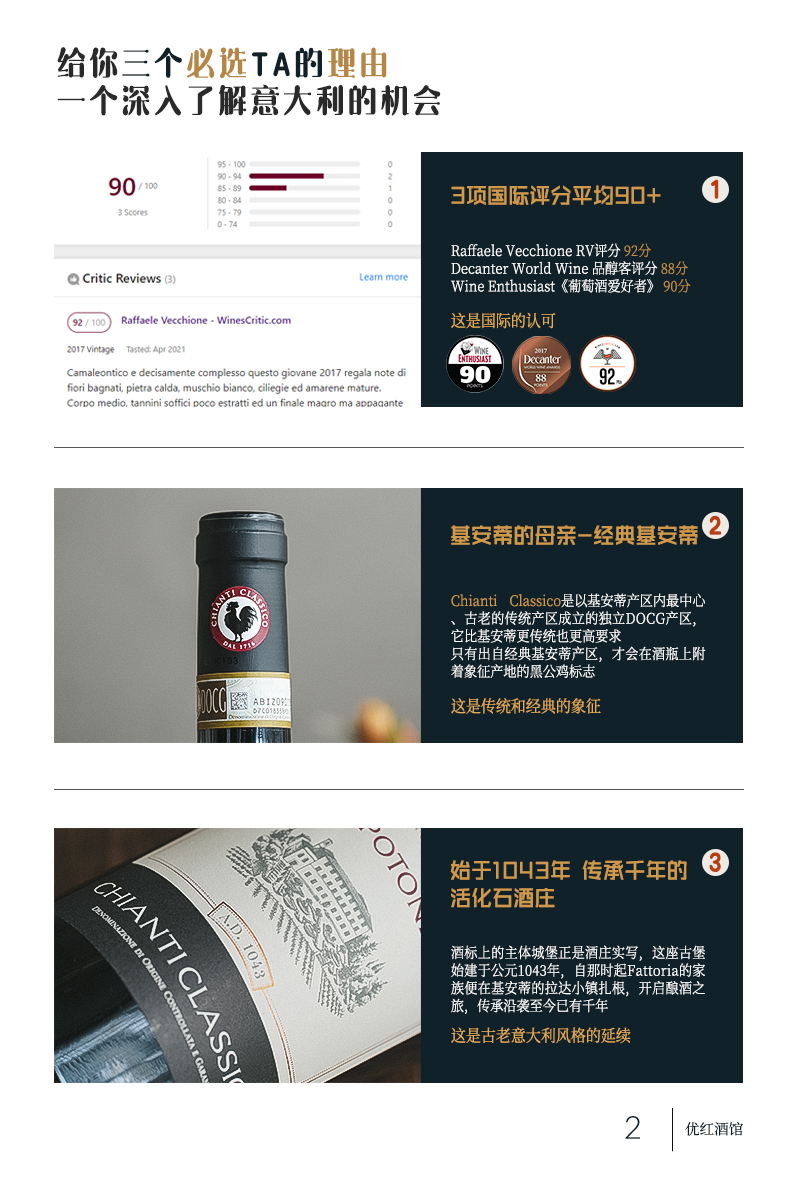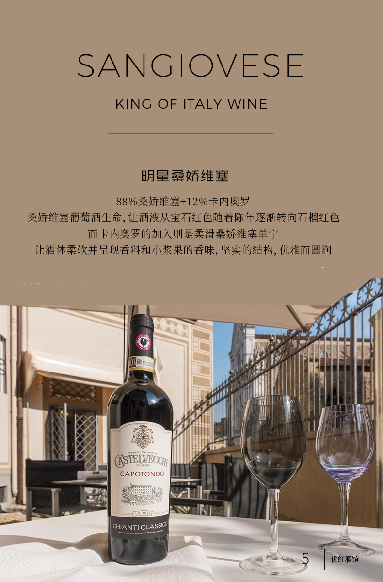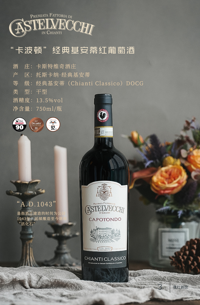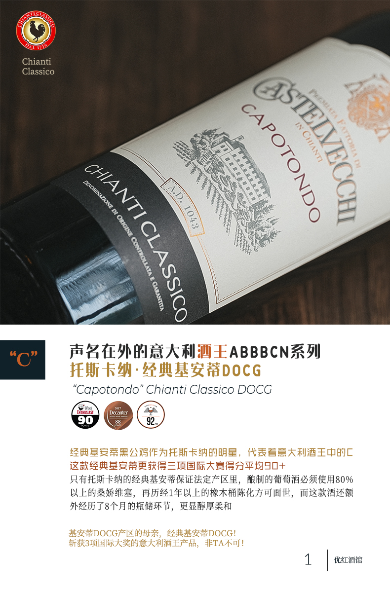 【连续6年葡萄酒爱好者90+】卡波顿经典基安蒂干红葡萄酒 DOCG等级 14%vol