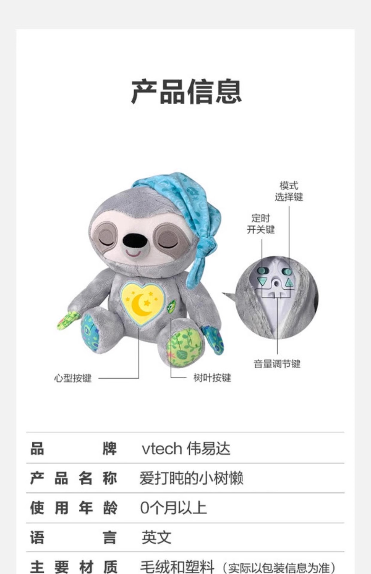 伟易达安抚小树懒睡眠仪宝宝安抚玩偶哄睡婴儿阿贝贝抱睡玩具礼物