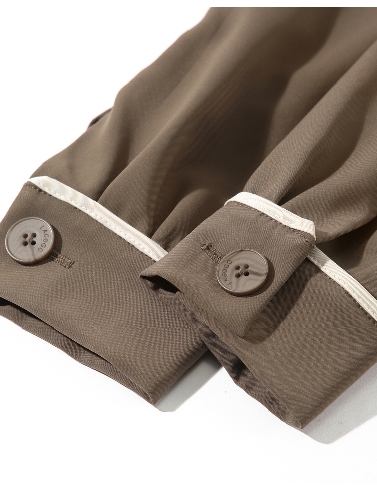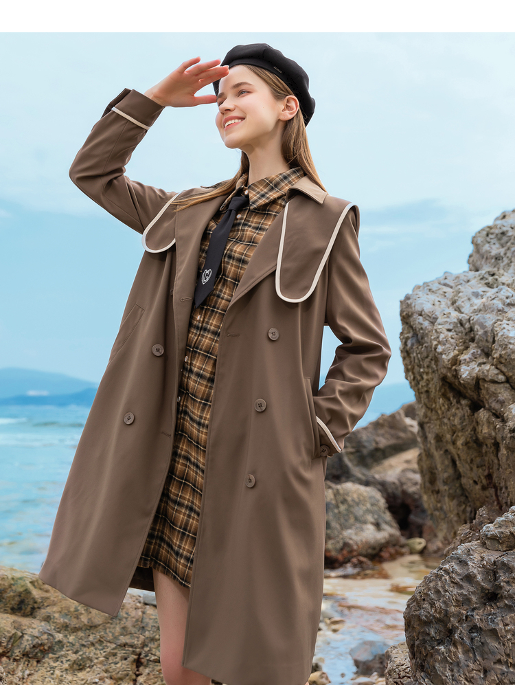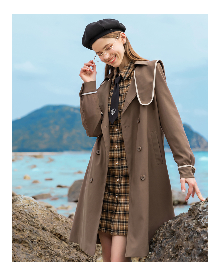 Lagogo拉谷谷2022年春季新款西装领系带双排扣学院风风衣女咖啡色LAFF332C44