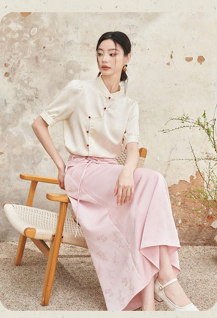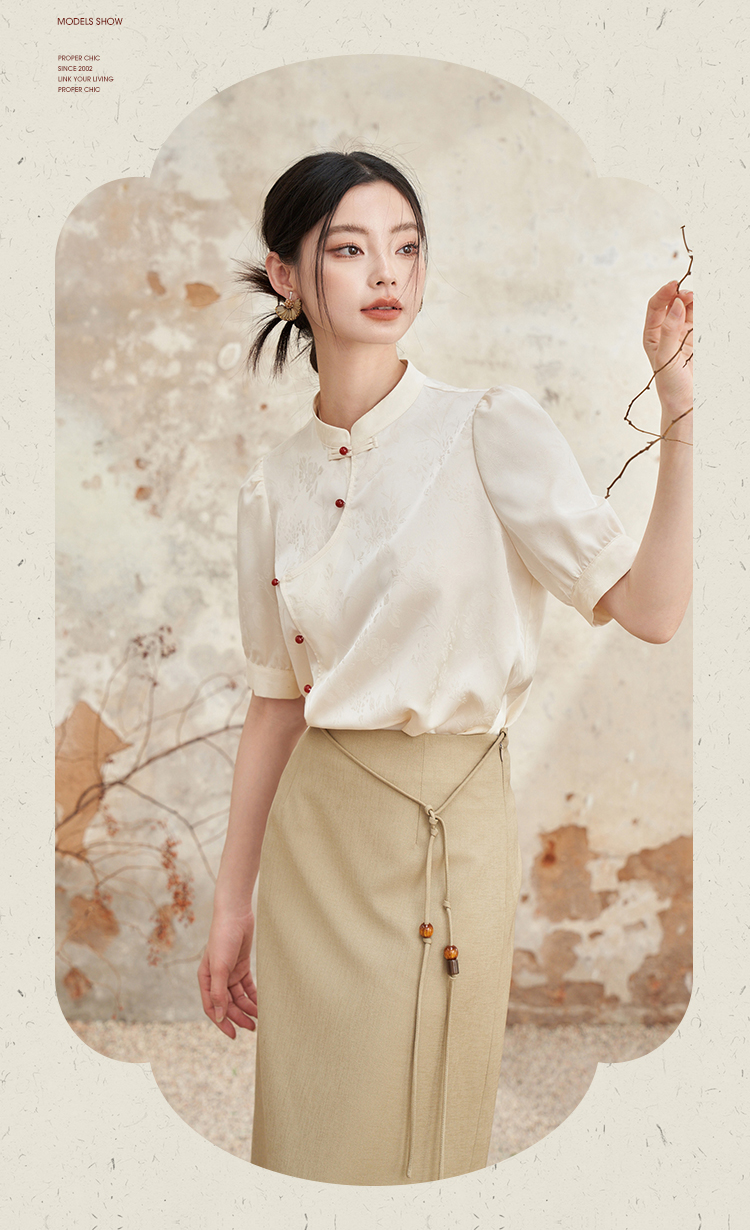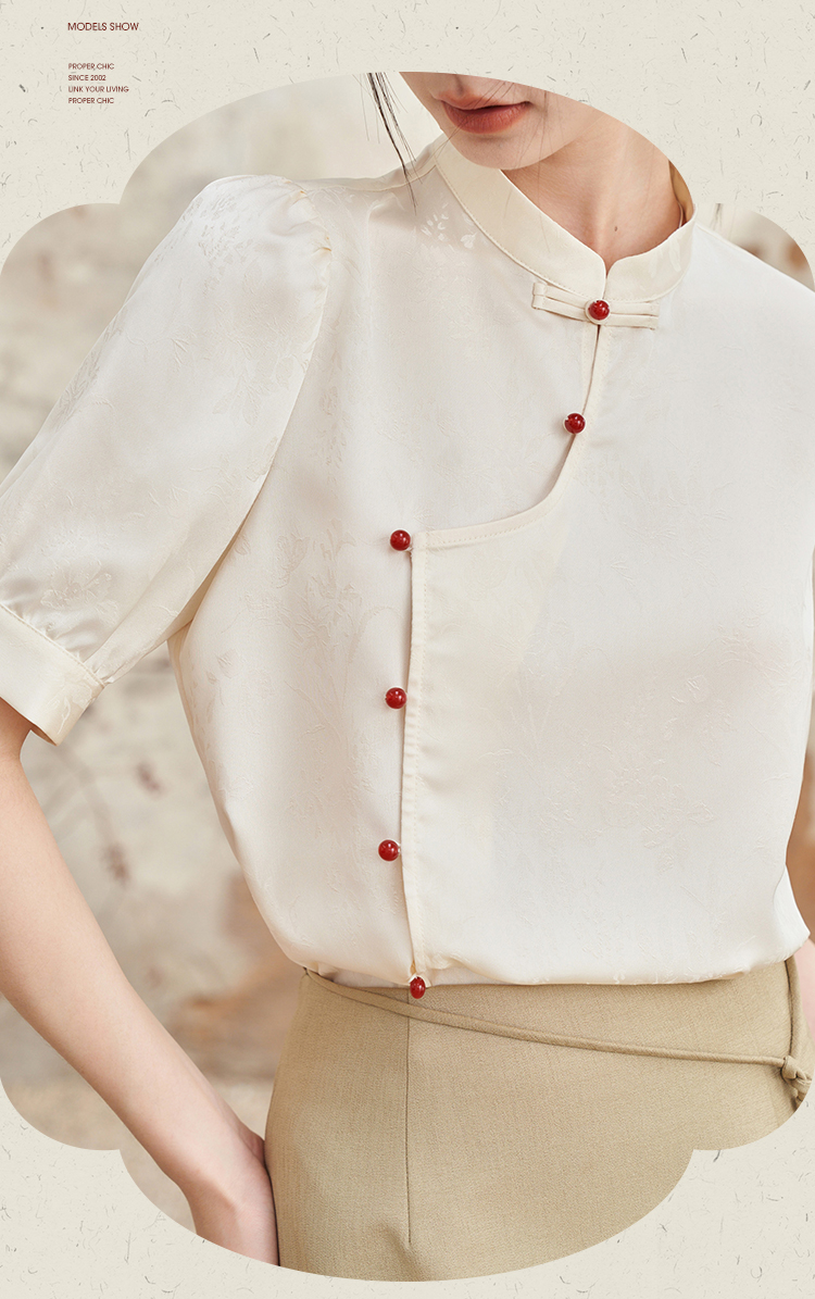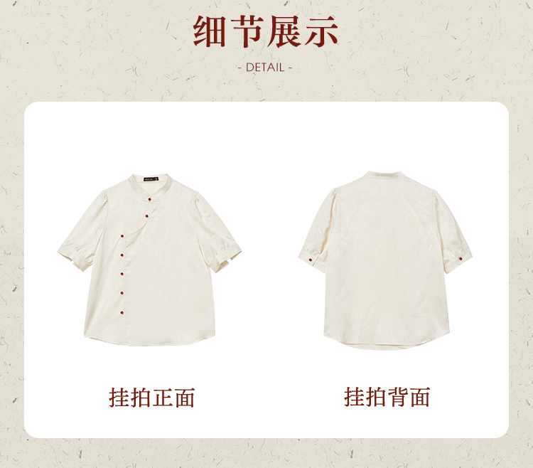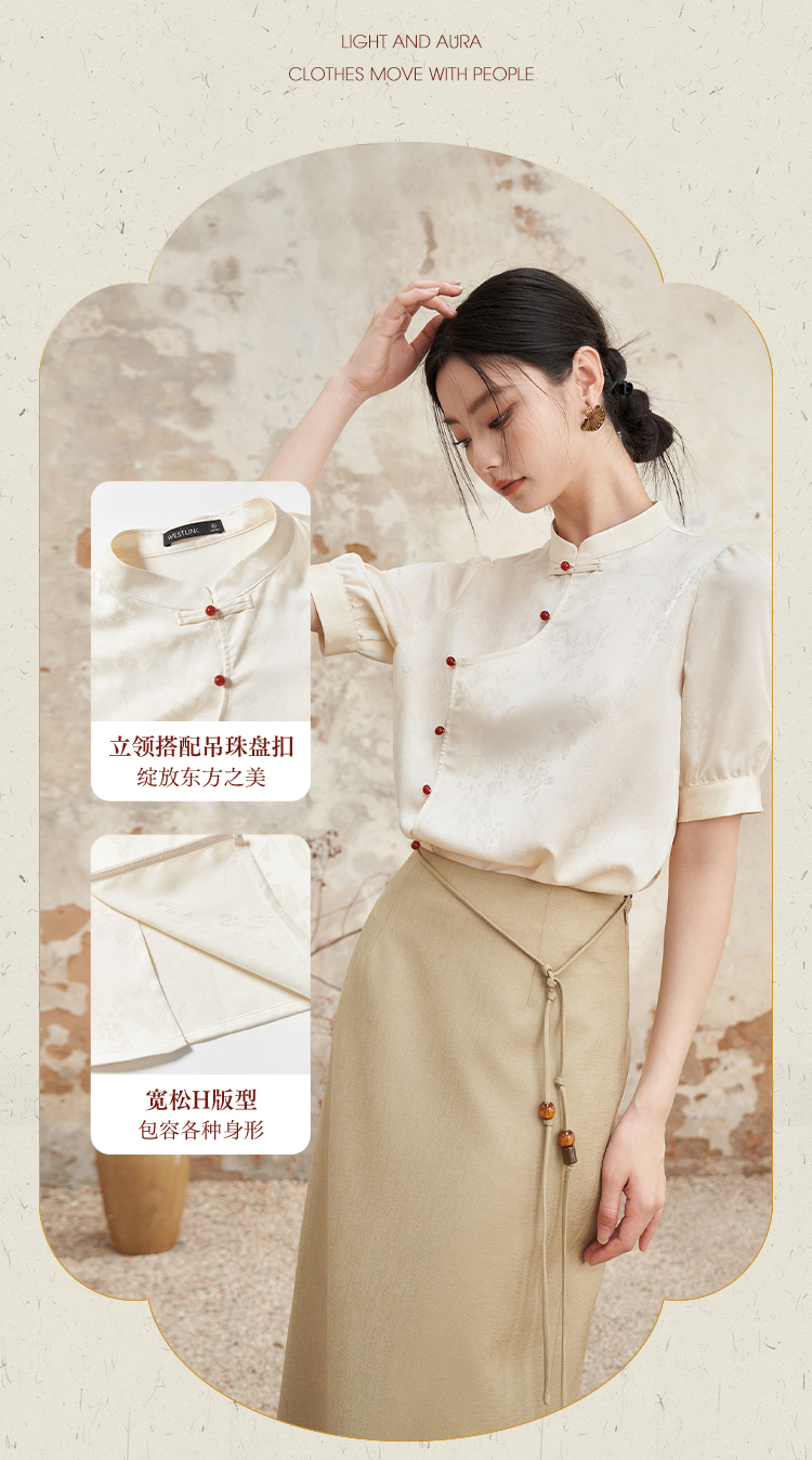 暗纹缎面新中式小立领吊珠盘扣衬衫女春夏季古韵端庄衬衣V1140881