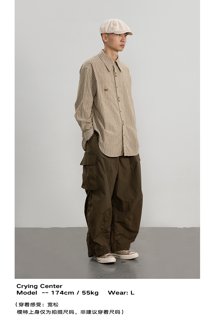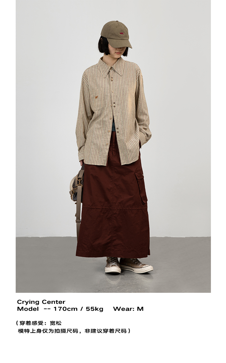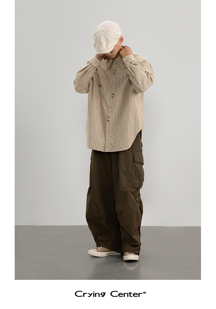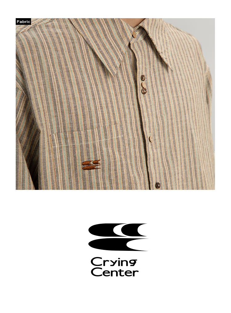 CryingCenter 椰咖灰条纹 洗水棉麻宽松长袖衬衫 哭喊中心
