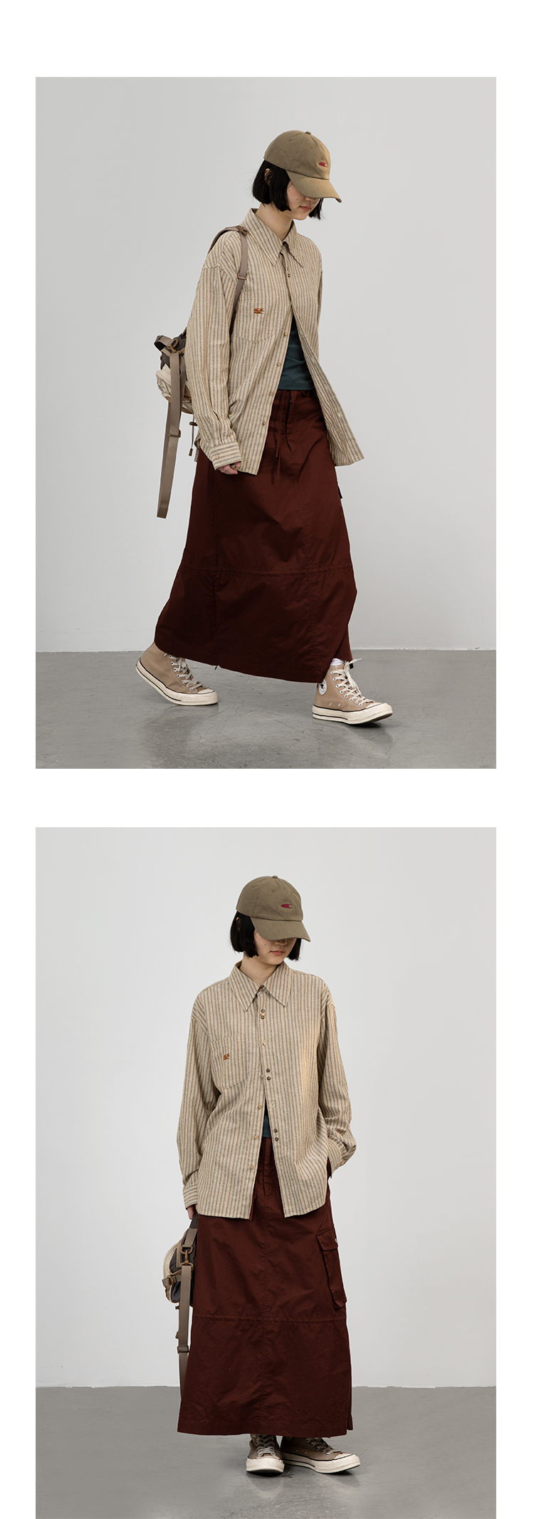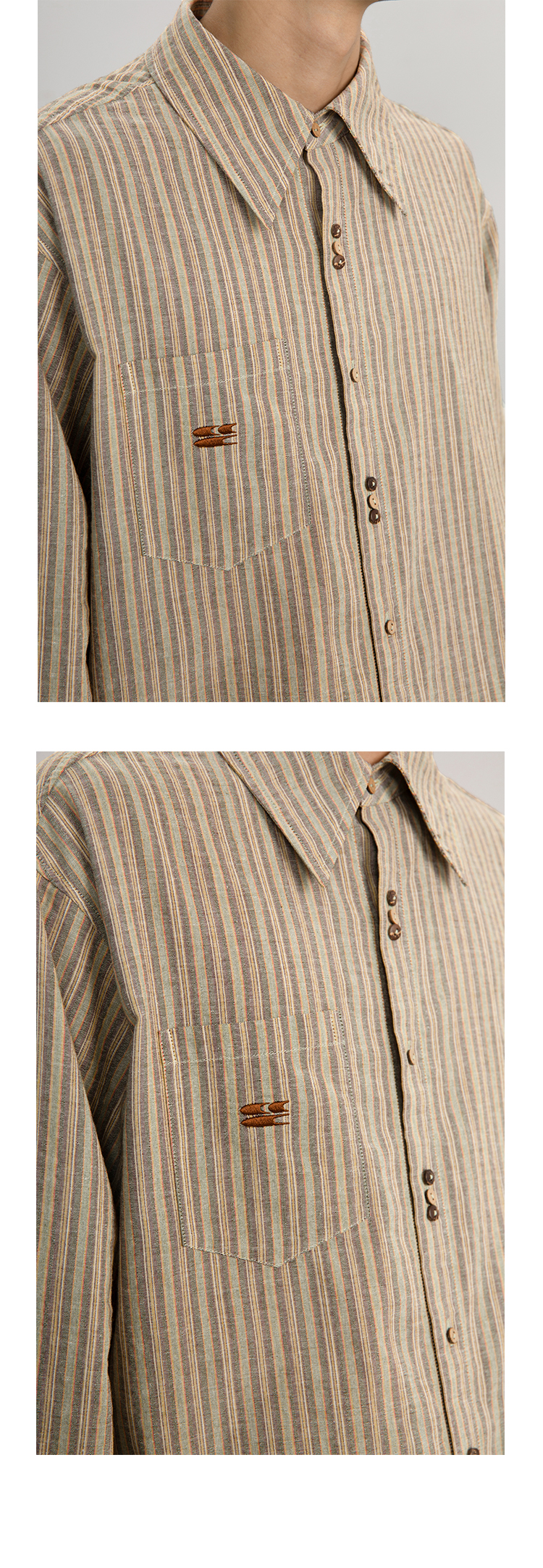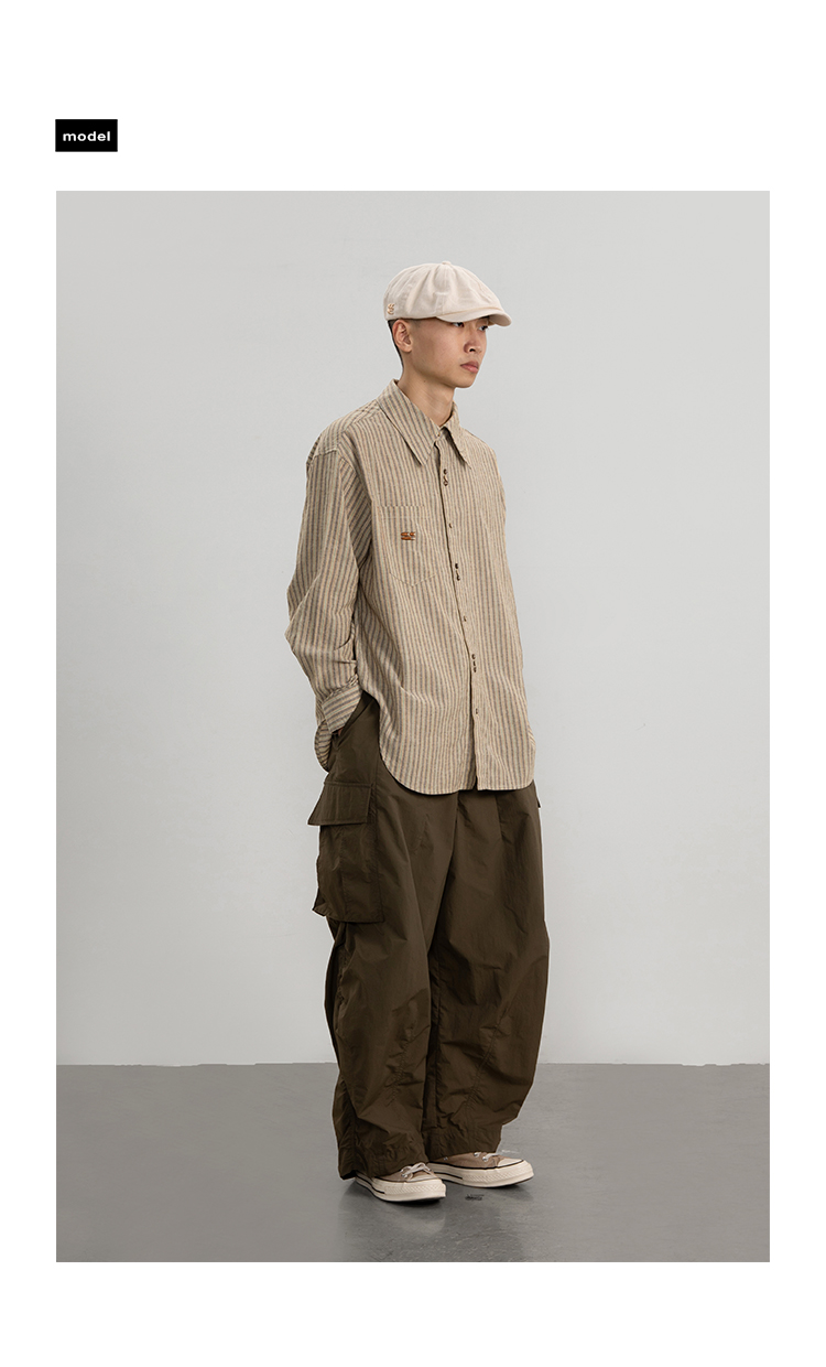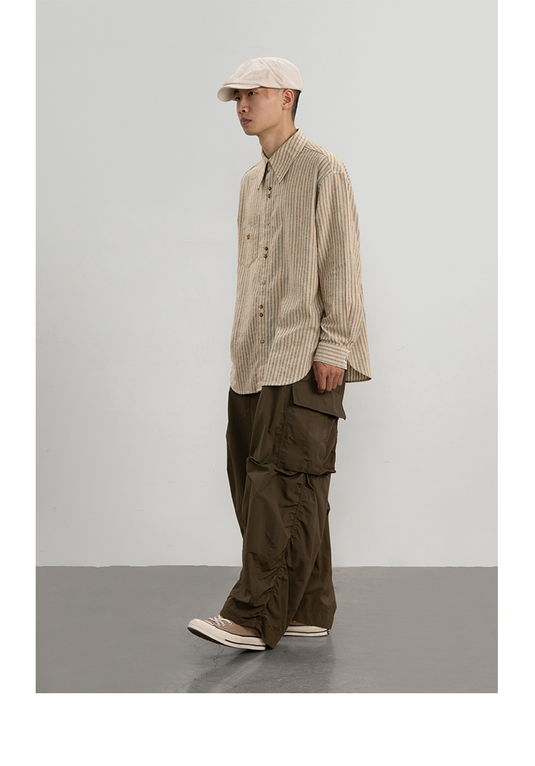 CryingCenter 椰咖灰条纹 洗水棉麻宽松长袖衬衫 哭喊中心