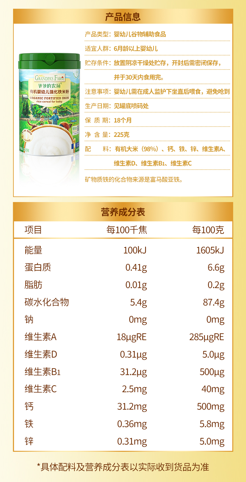爷爷的农场有机婴幼儿强化铁米粉(原味)225g