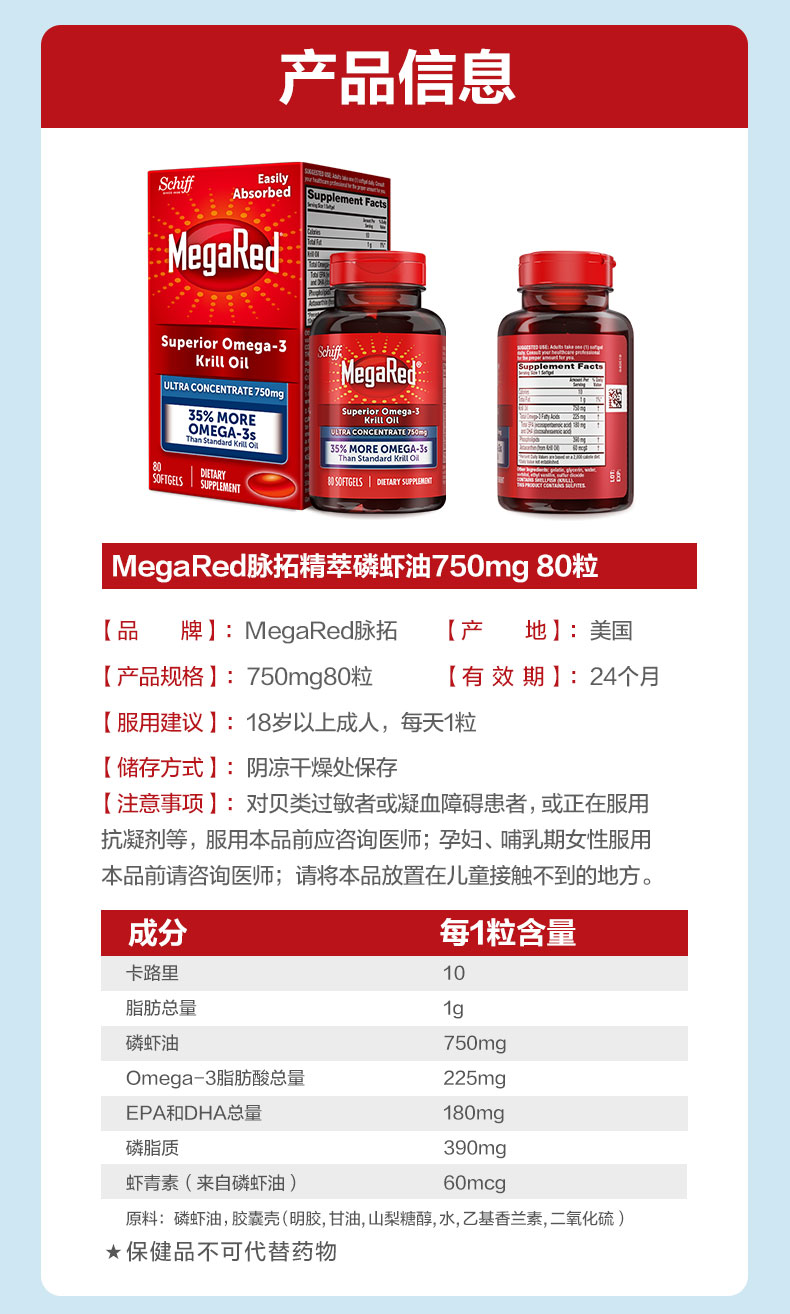 Schiff MegaRed 脉拓 磷虾油软胶囊750mg 80粒