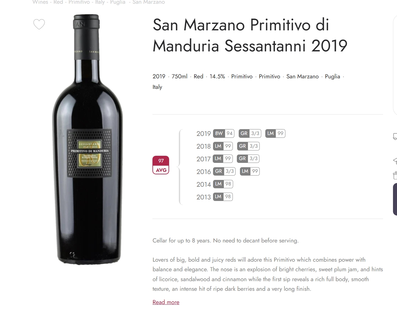 【推荐】2019 San Marzano Sessantanni 60 Old Vines Primitivo di Manduria 施丹宁60周年老藤普利米蒂沃红葡萄酒