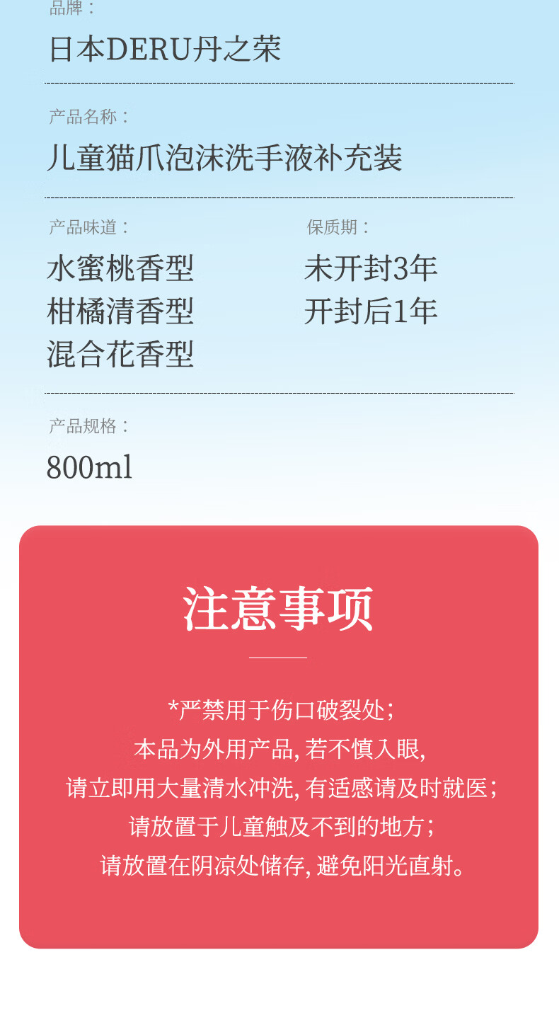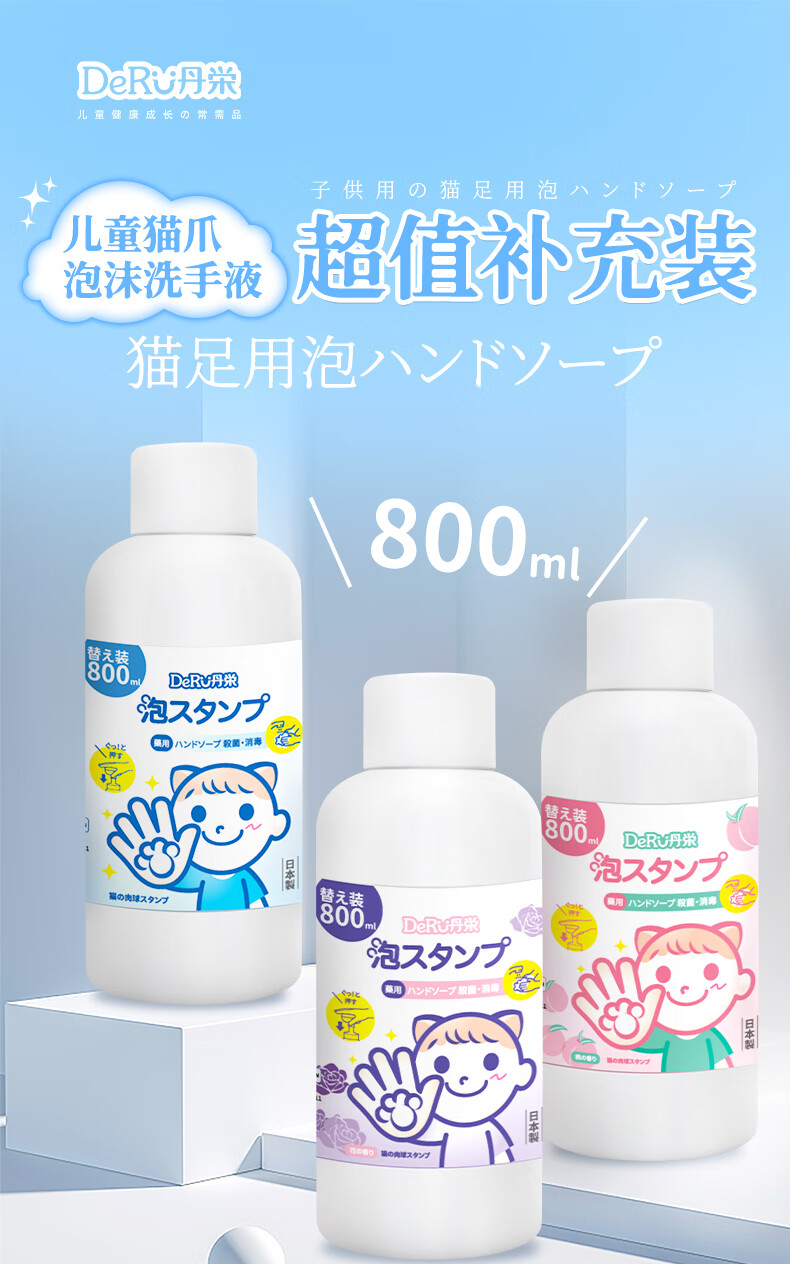 DeRU丹之荣 猫爪儿童泡沫洗手液补充装滋润护手花果香型 800ml/瓶