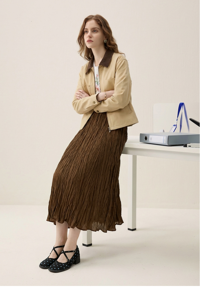 谜底印花半裙2025冬新品复古拼接撞色抽绳腰头中长裙女254MB1675