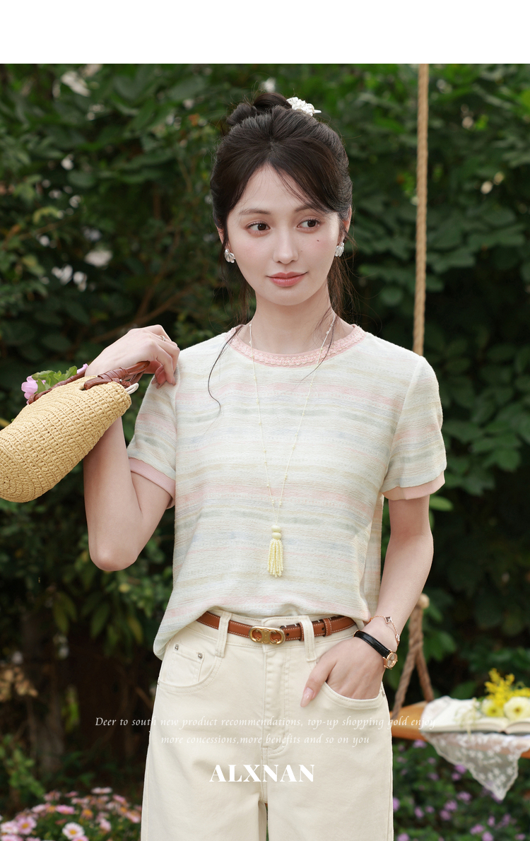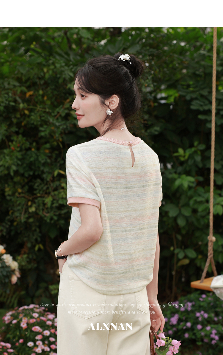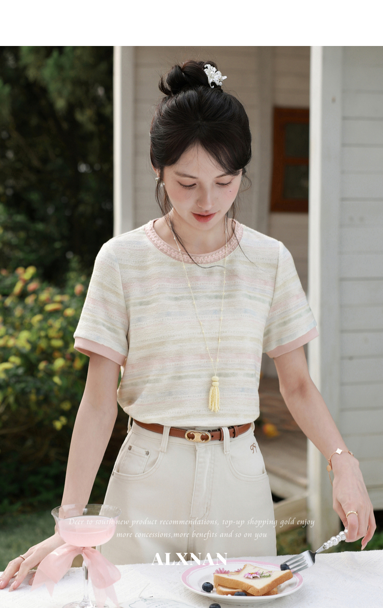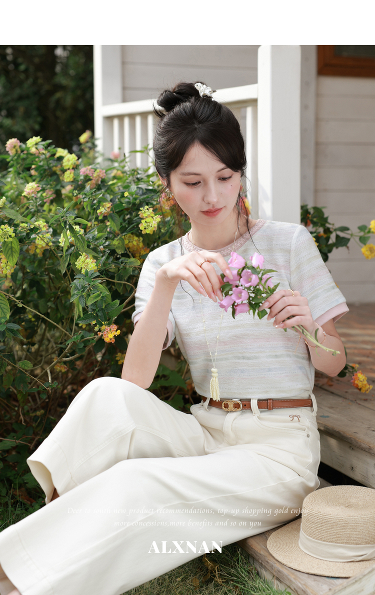 鹿向南「流光花语」粉色T恤短袖女夏蕾丝领撞色正肩显瘦百搭上衣