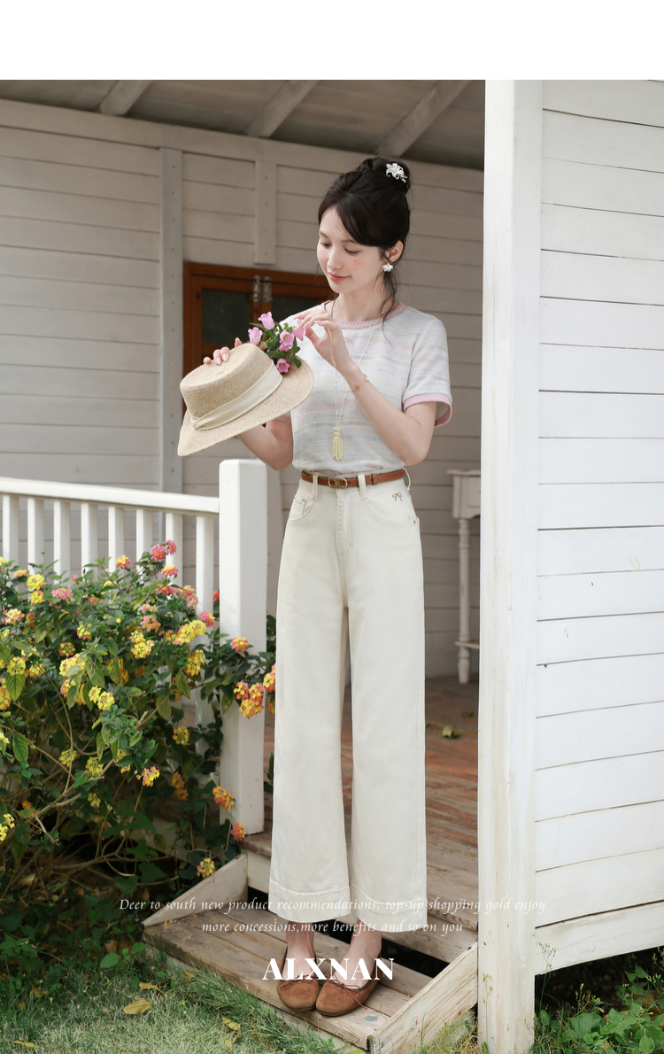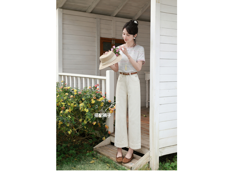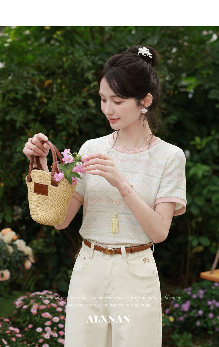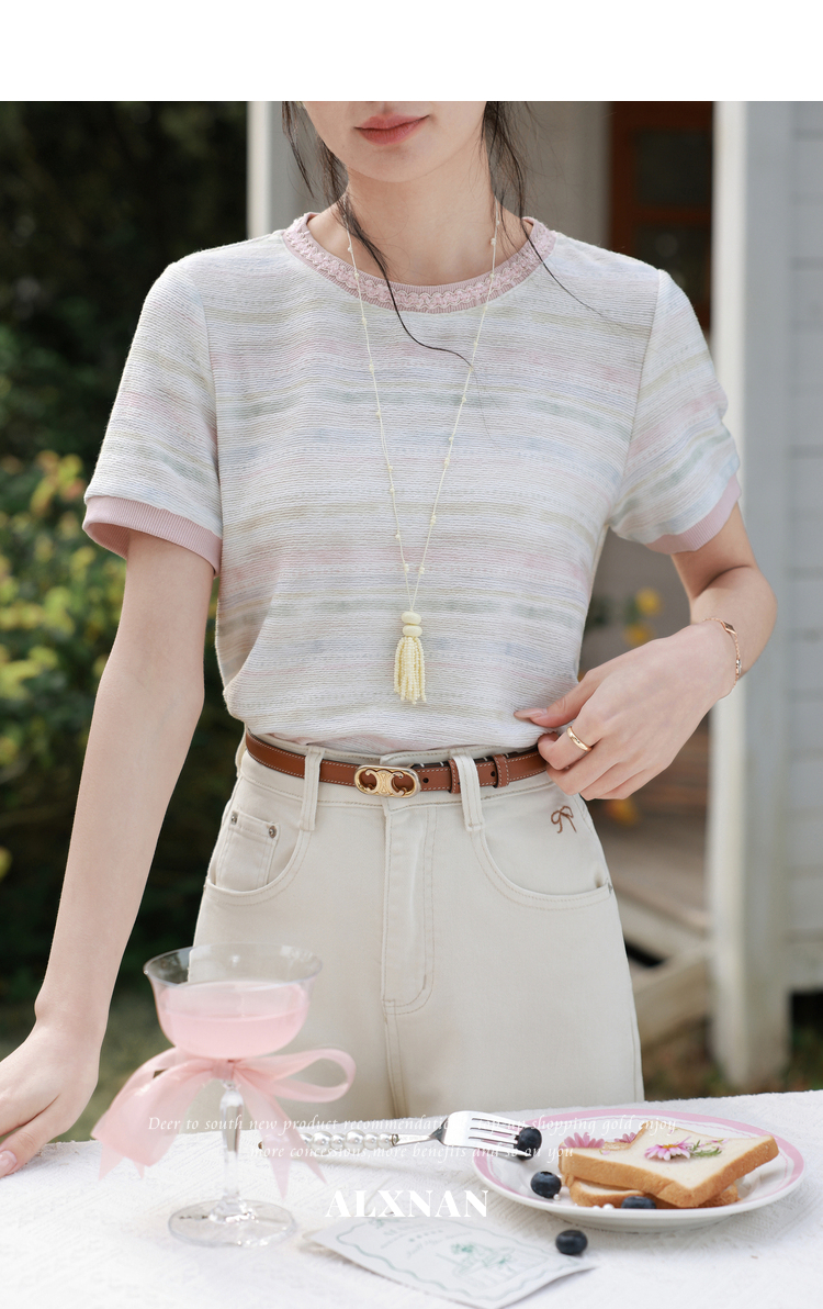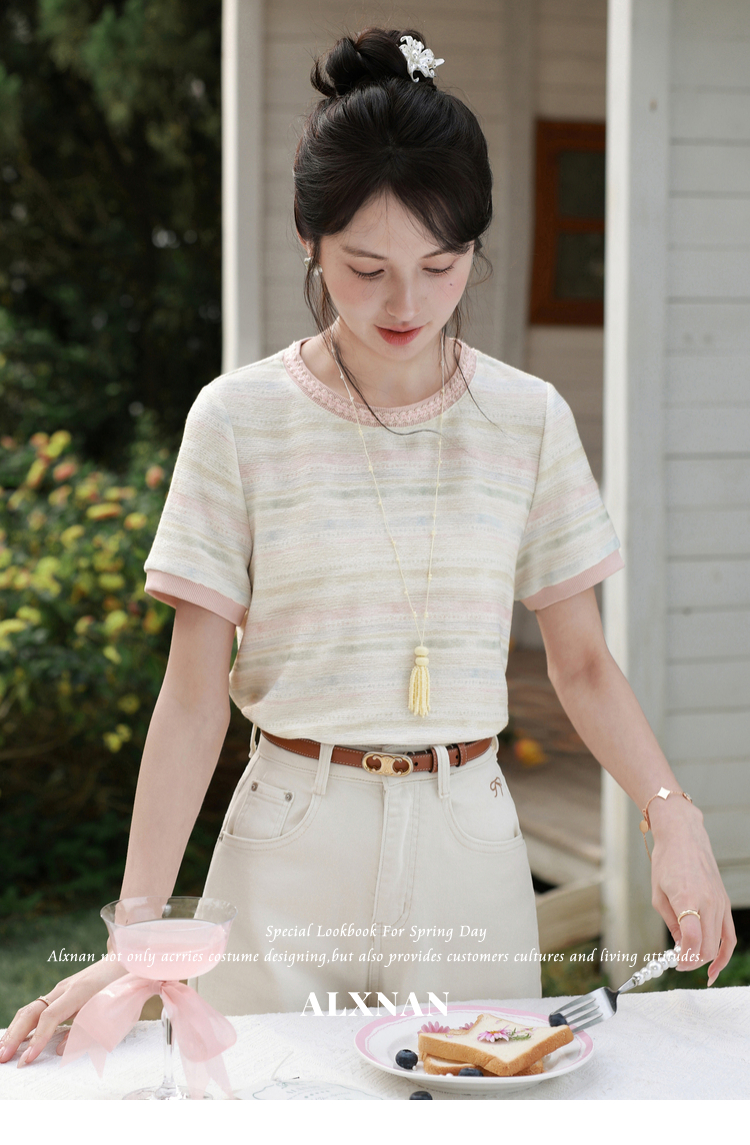 鹿向南「流光花语」粉色T恤短袖女夏蕾丝领撞色正肩显瘦百搭上衣