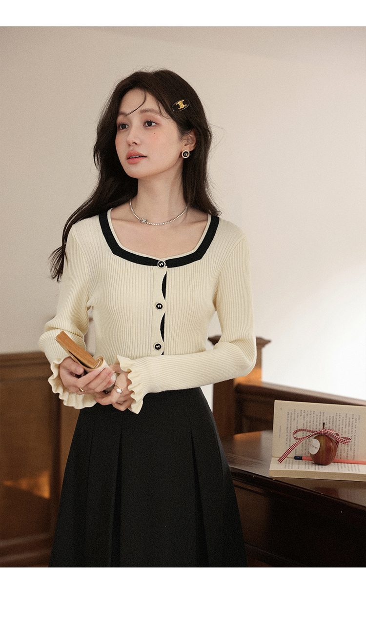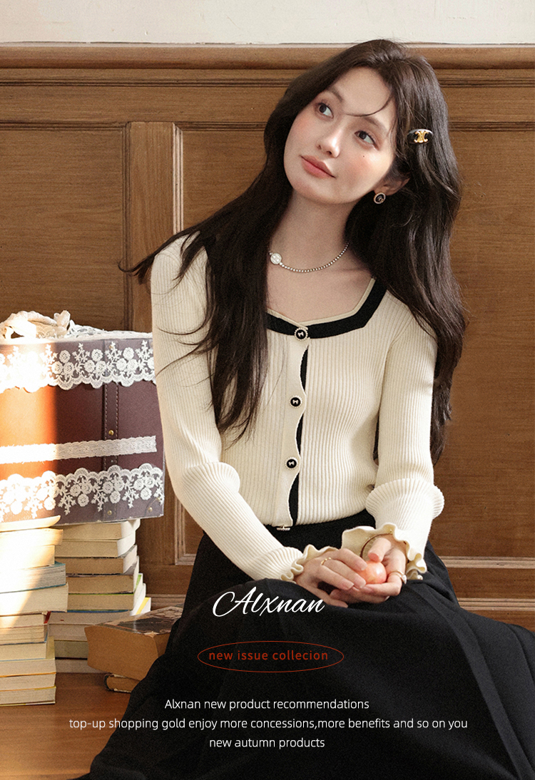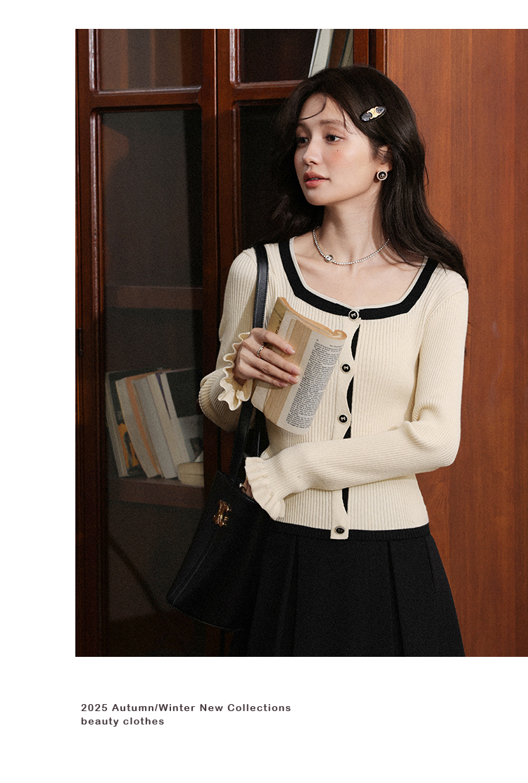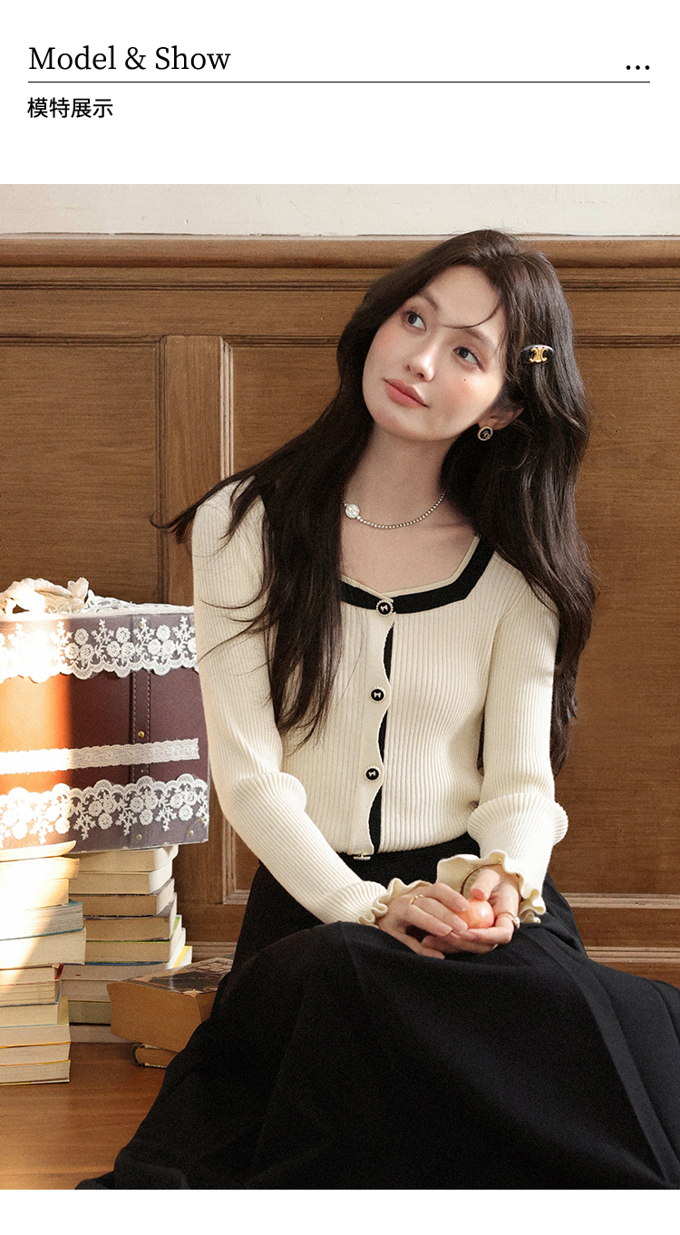 鹿向南「绵绵甜巧」杏色修身针织衫女早秋显瘦撞色高级感长袖上衣L56731