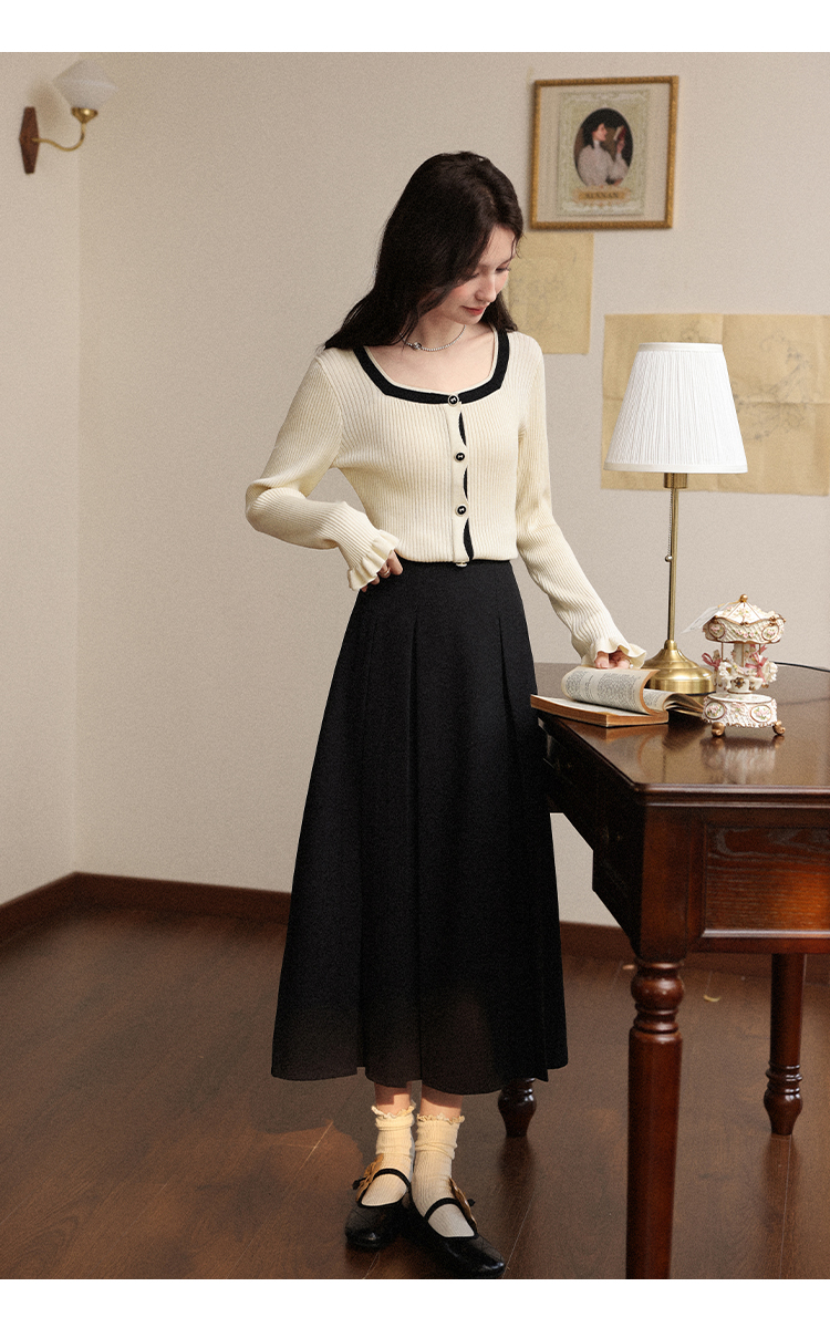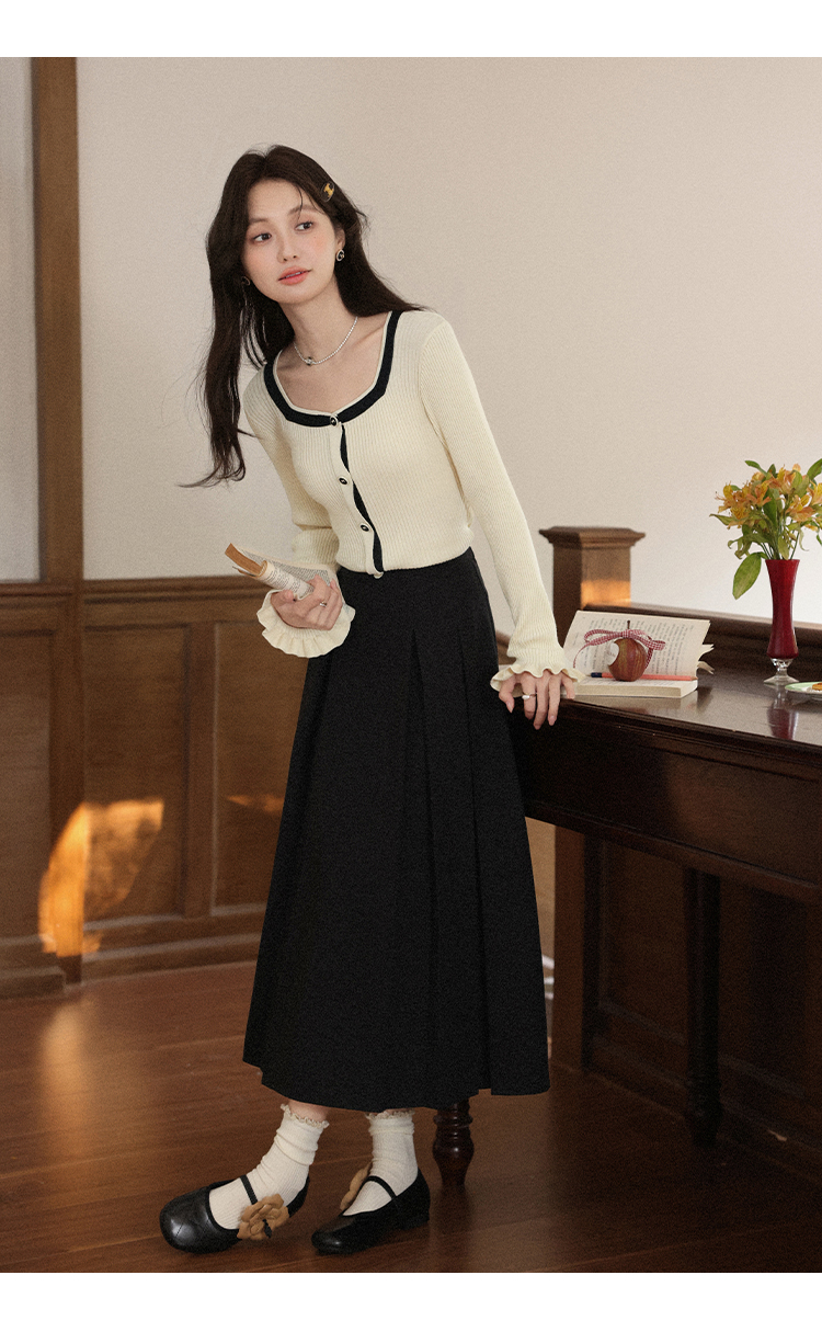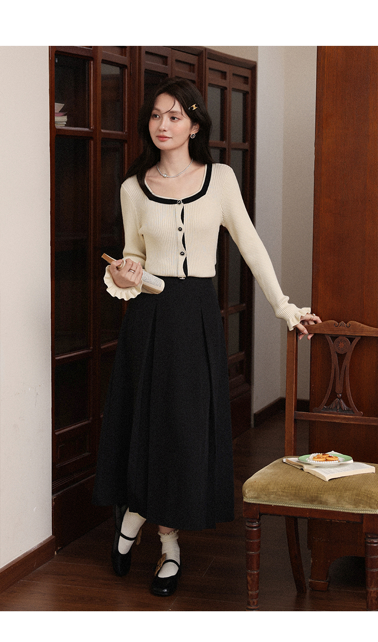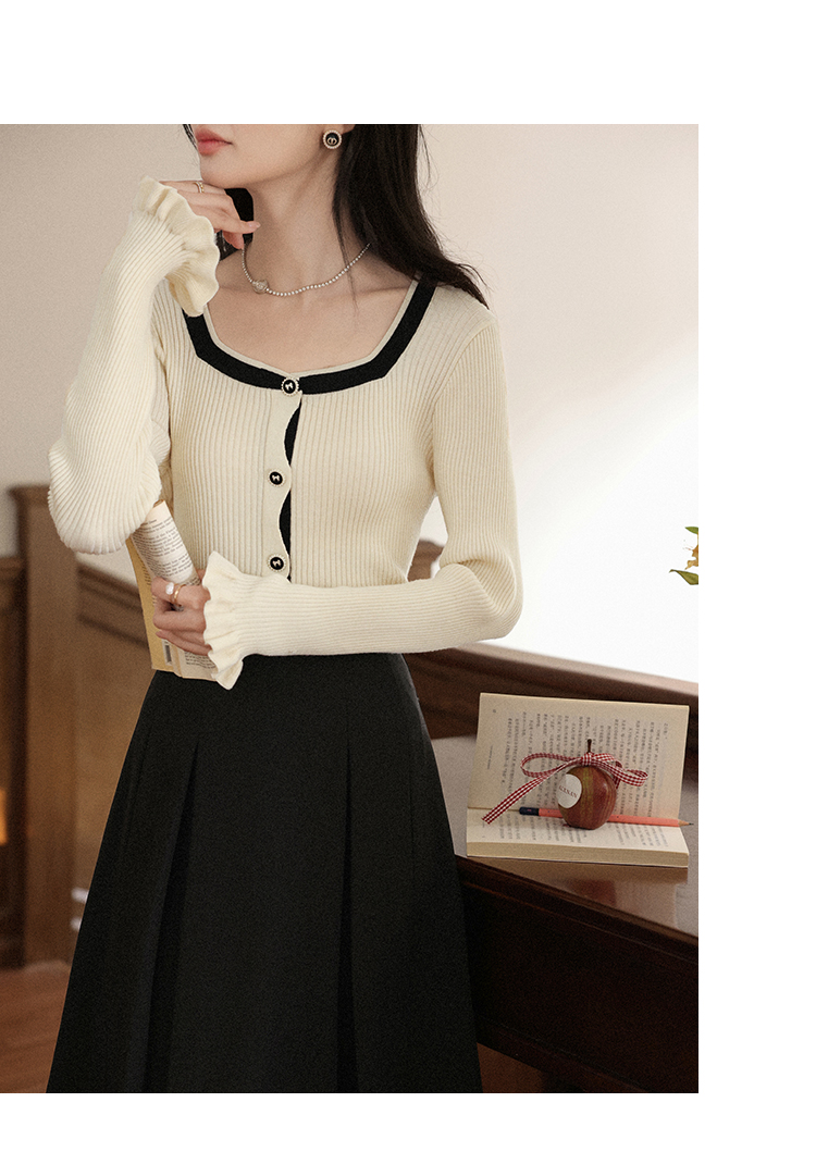 鹿向南「绵绵甜巧」杏色修身针织衫女早秋显瘦撞色高级感长袖上衣L56731