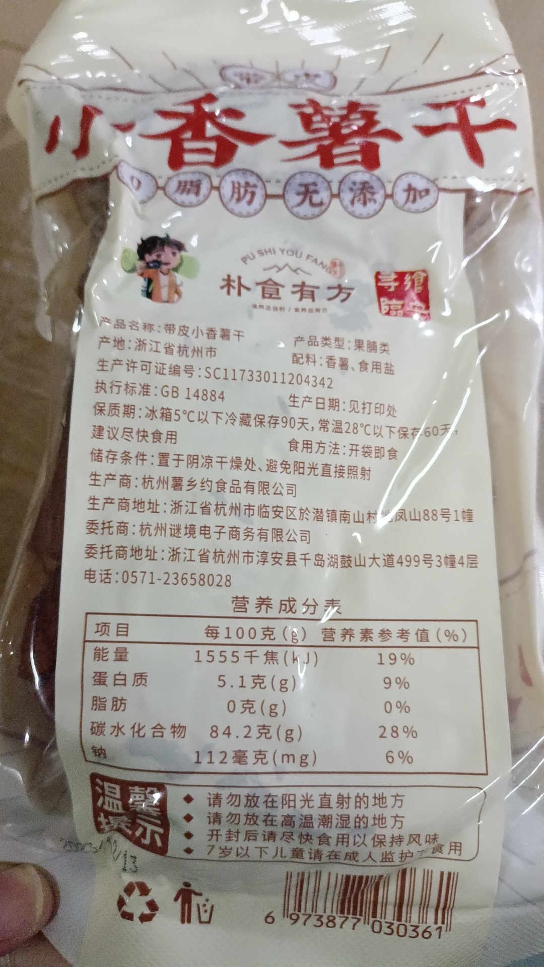 【商品名称】:带皮小香薯干/朴食有方 【商品规格】:250g/袋 【保质期】:冰箱5℃以下冷藏保存90天,常温28℃以下保存60天,建议尽快食用 【配料表】:小香薯、食用盐 【贮存条件】:请置于阴凉干燥处,避免阳光直射【食用方法】:开袋即食 【发货地】:杭州 【发货快递】:申通、中通、邮政随机 【发货时效】:48-72小时 【不发货区域】:新疆、西藏不发货,青海+5元
