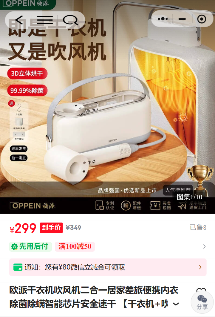 【2025年新款】 欧派干衣机+高速吹风机 二合一 高速烘干 单次可烘8-10件 杀菌除螨便携式