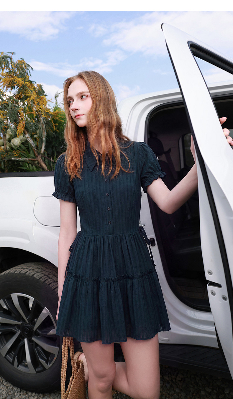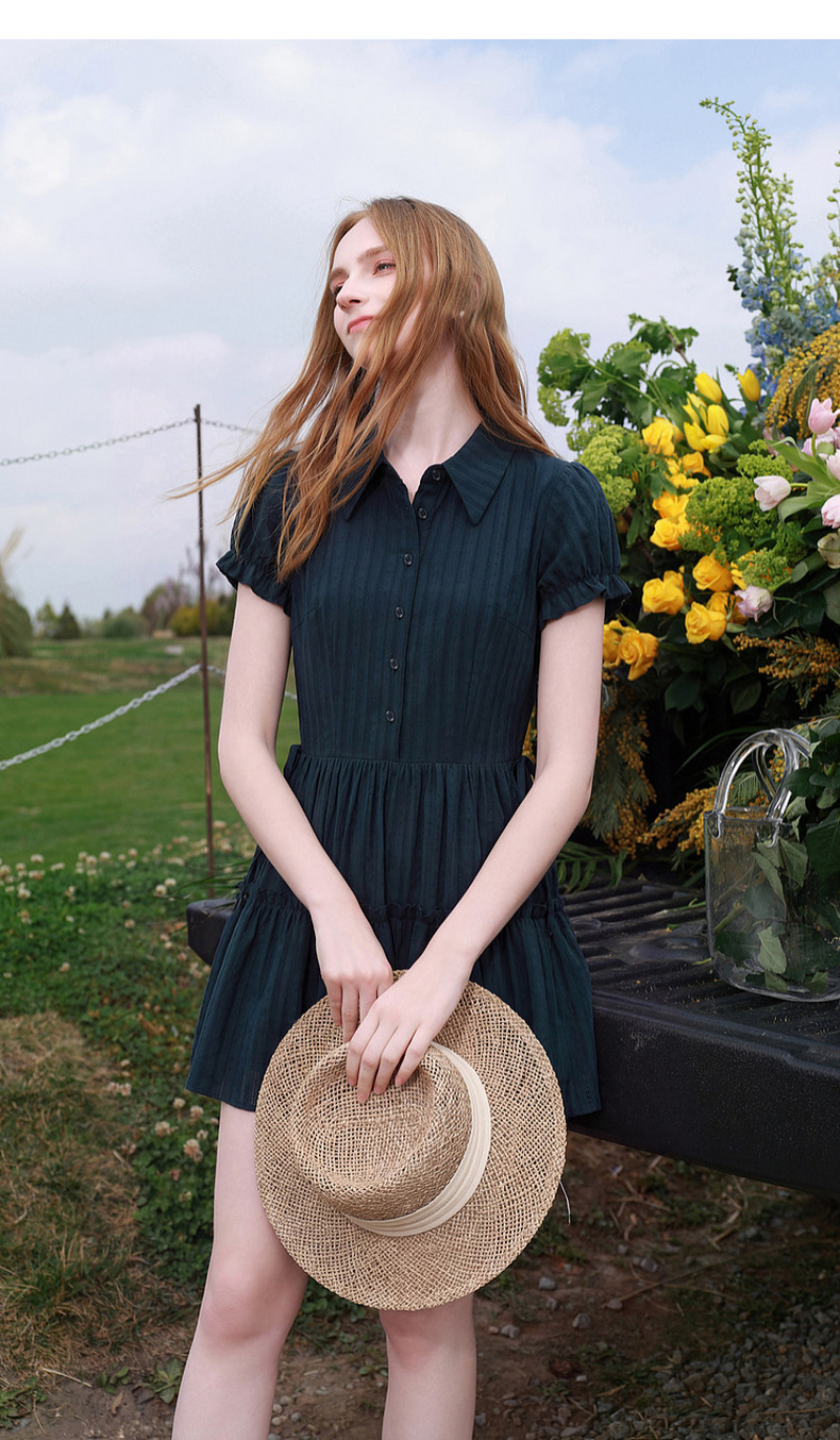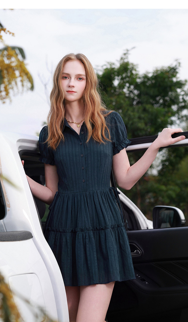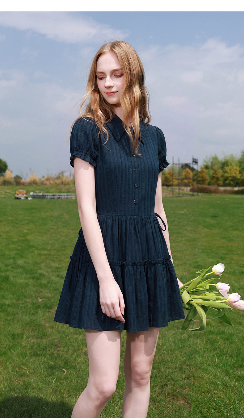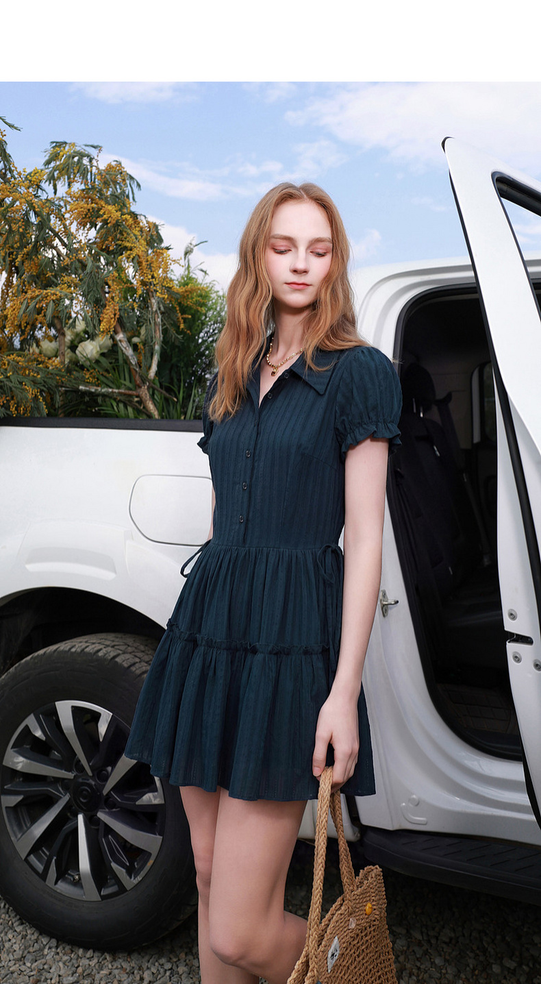 【100棉】三彩2026夏季新款提花连衣裙翻领收腰A字裙短裙M