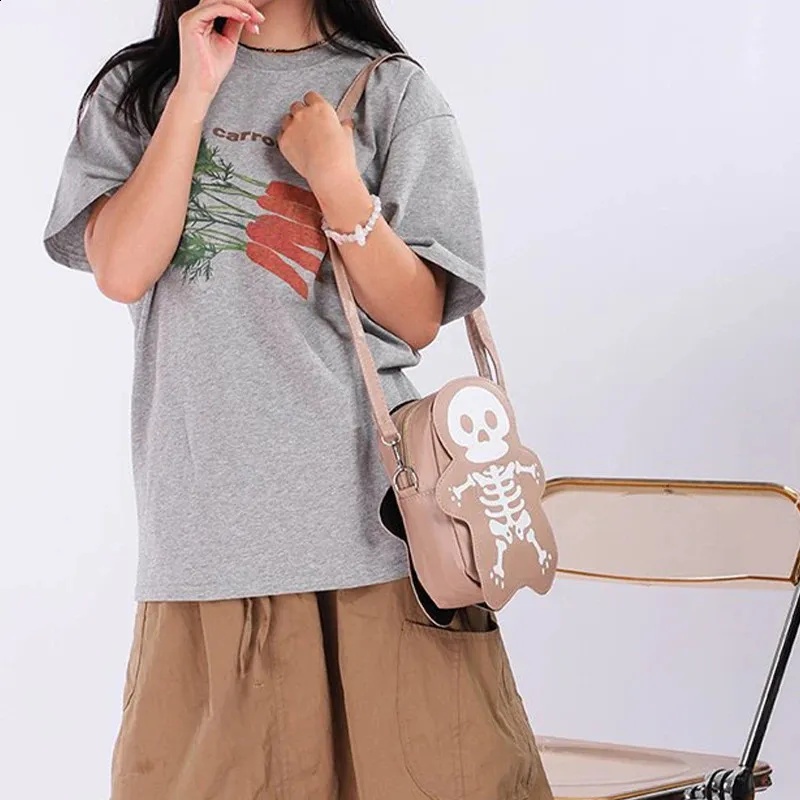 有趣可爱的骨架印花女士肩包可调节肩带女士拉链邮差包 适合万圣节派对出游 卡其色