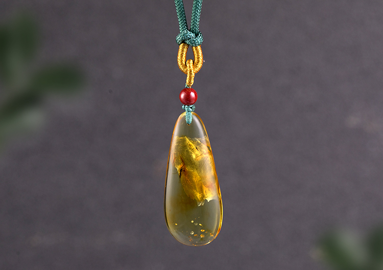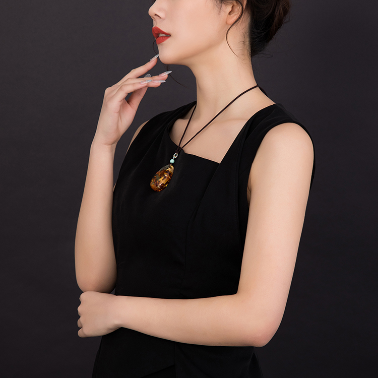 吊坠随型打磨成平安扣、水滴吊坠,弥漫琥珀原始韵味,配以手编挂绳,朱砂或绿松石加以点缀,古典精致。
