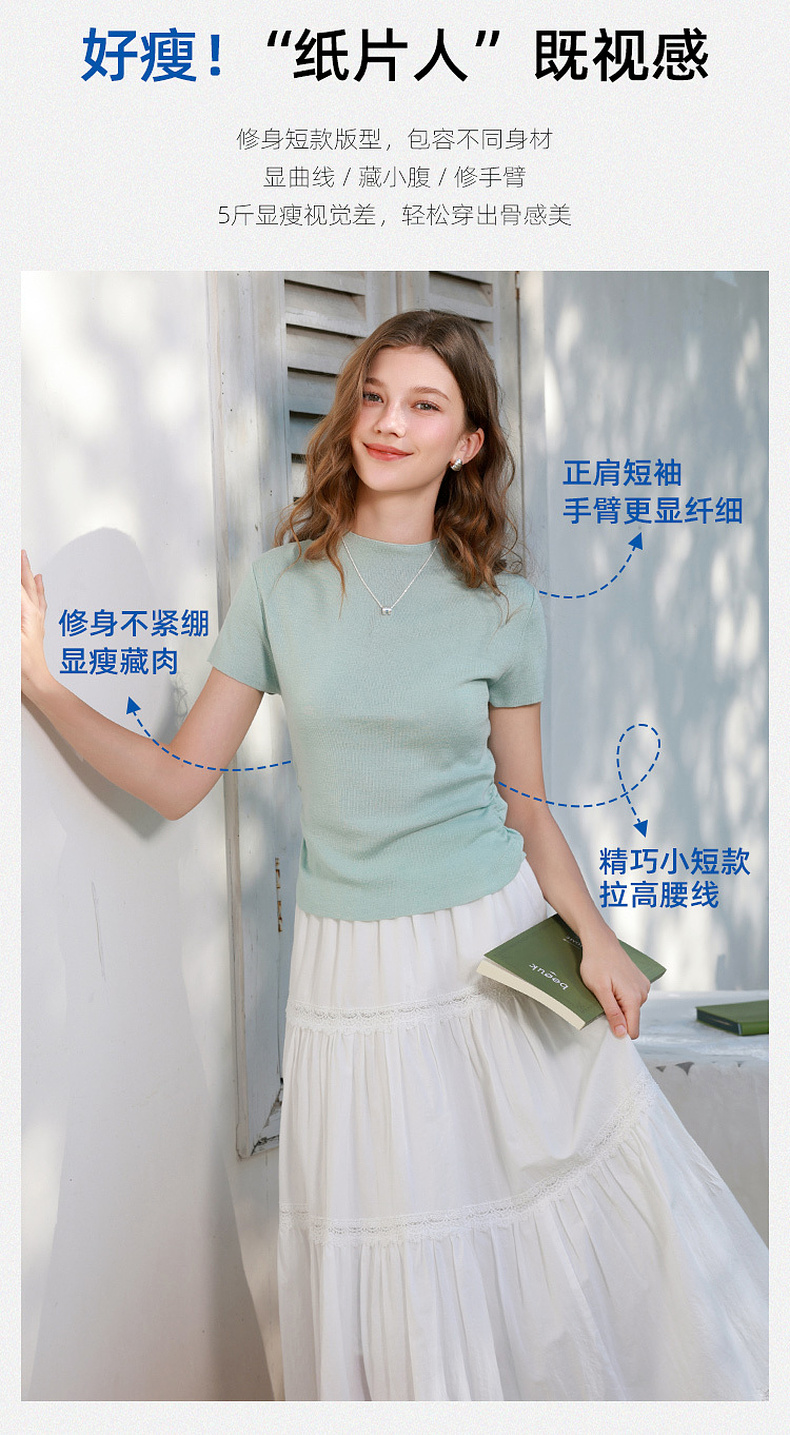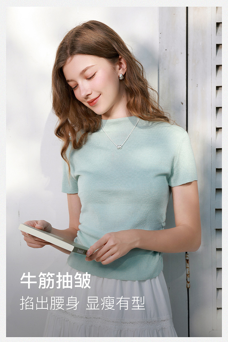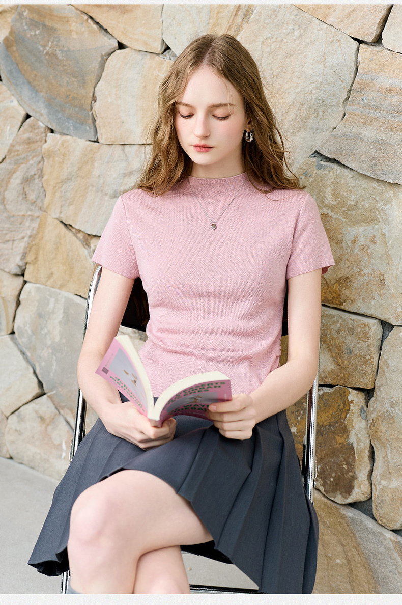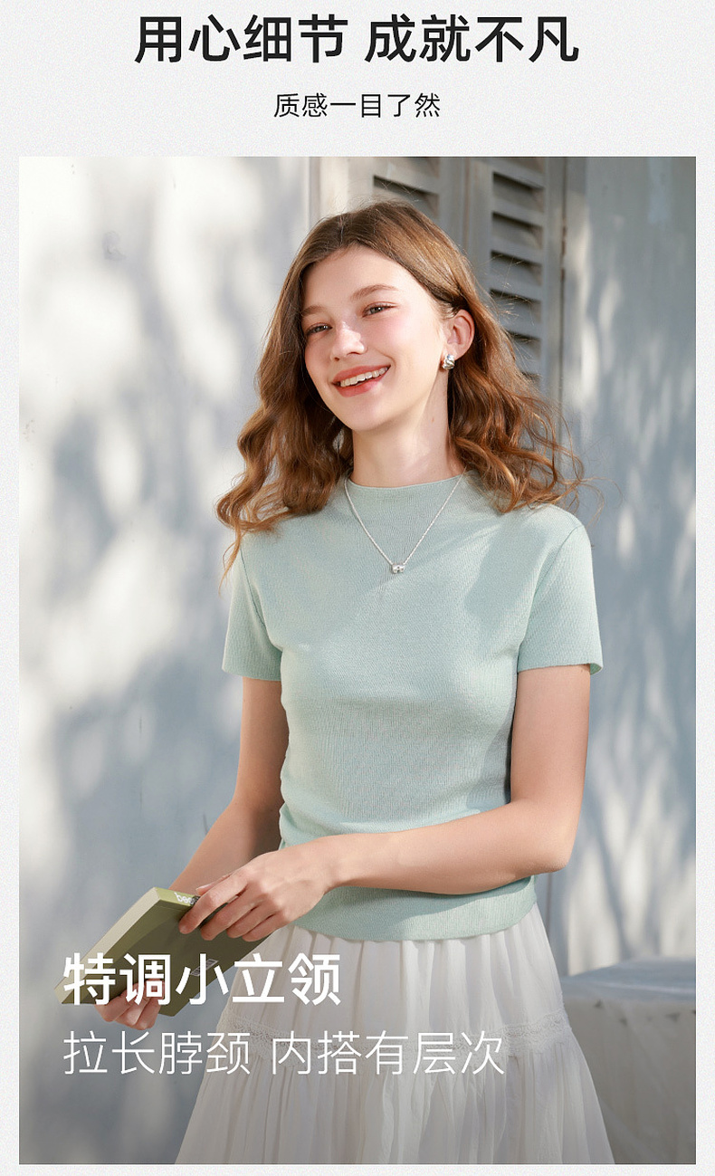 三彩2026春季新款修身短款套头针织衫立领短袖收腰毛衫纯色气质Z
