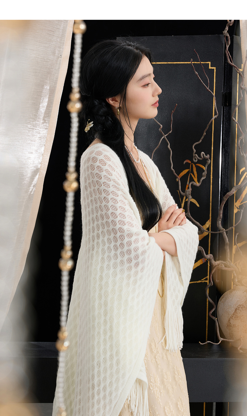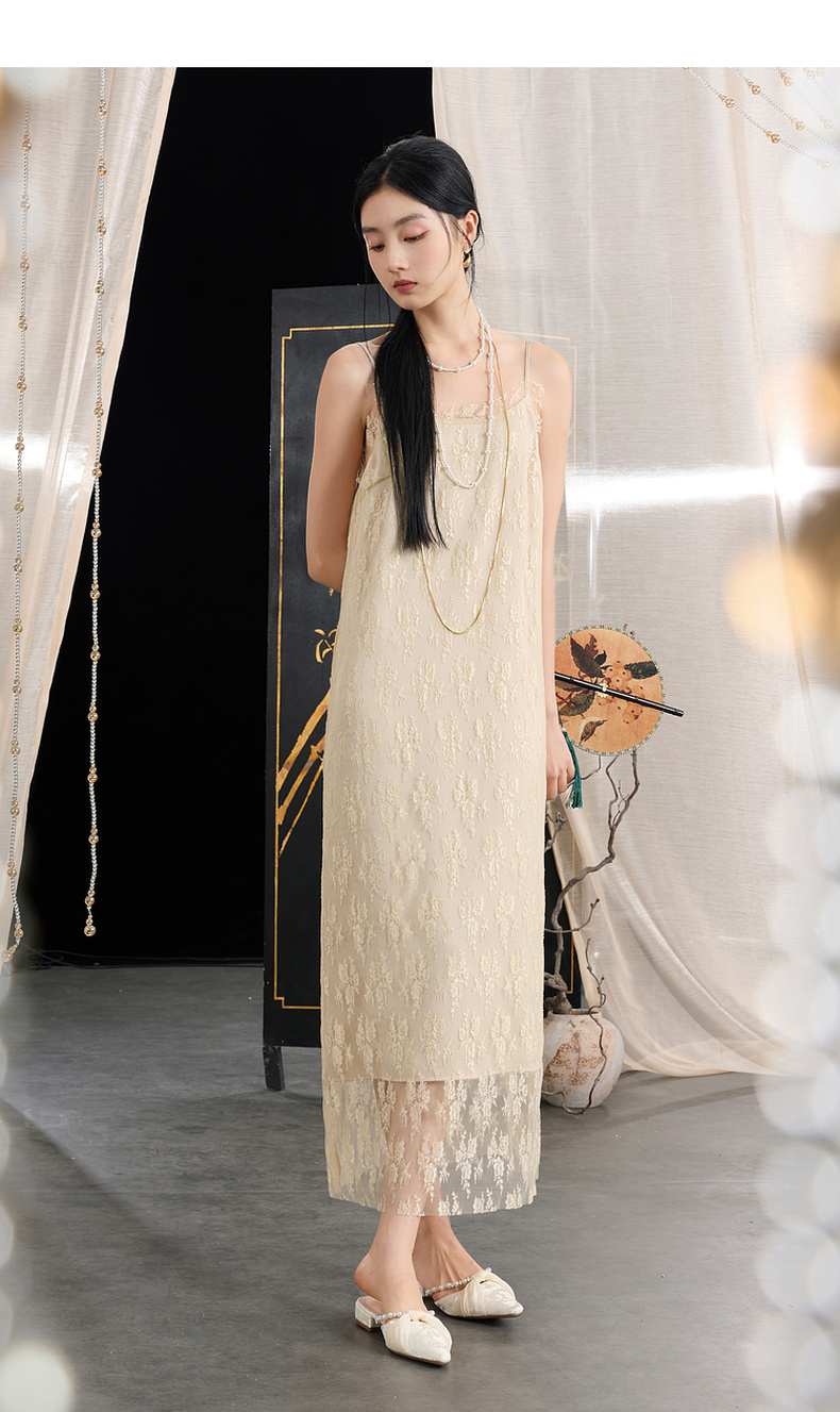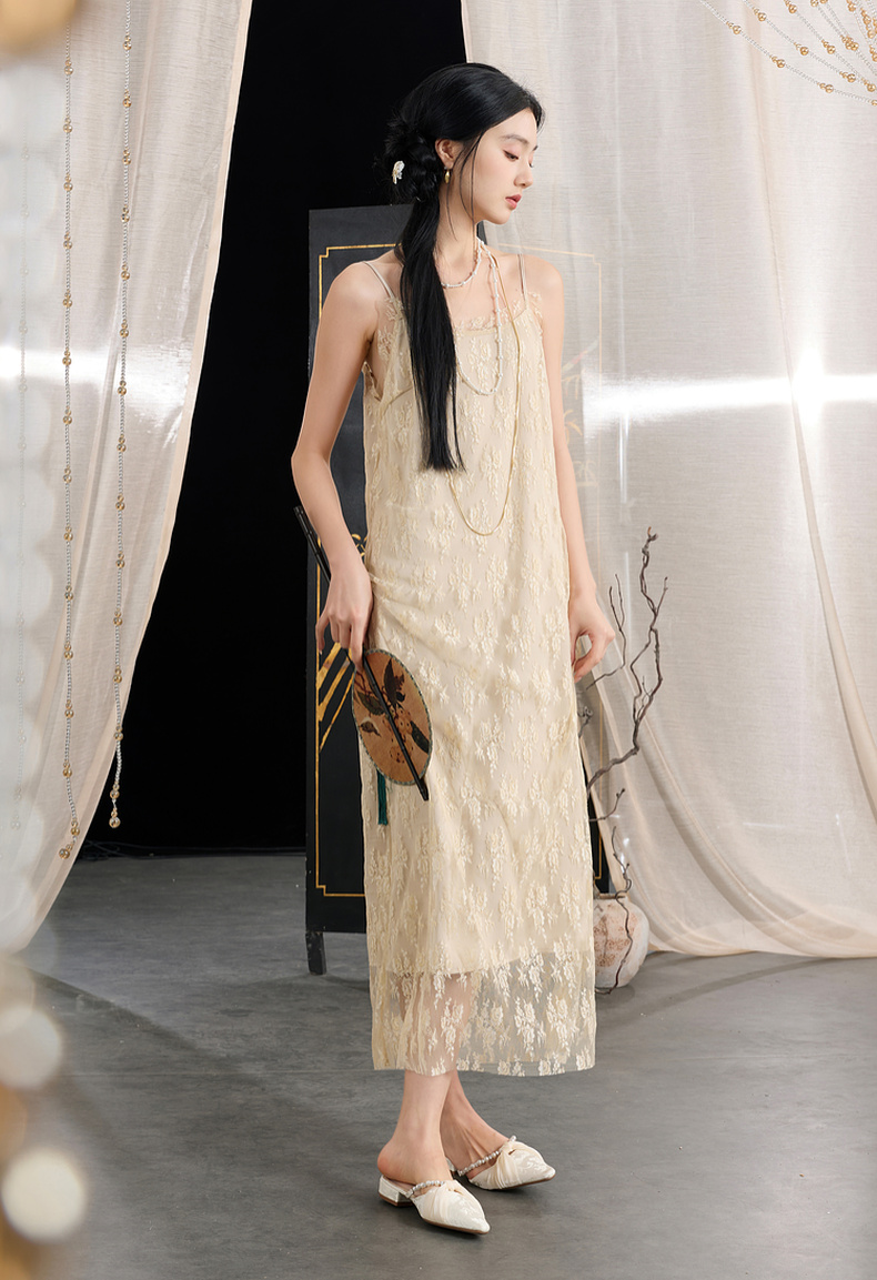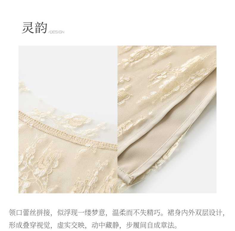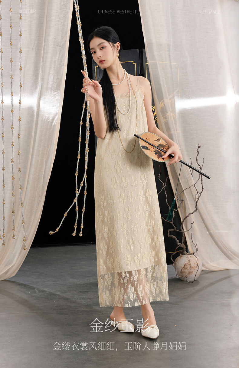 三彩【金纱玉影】2025秋季新款蕾丝吊带裙开叉A字裙长裙中式C