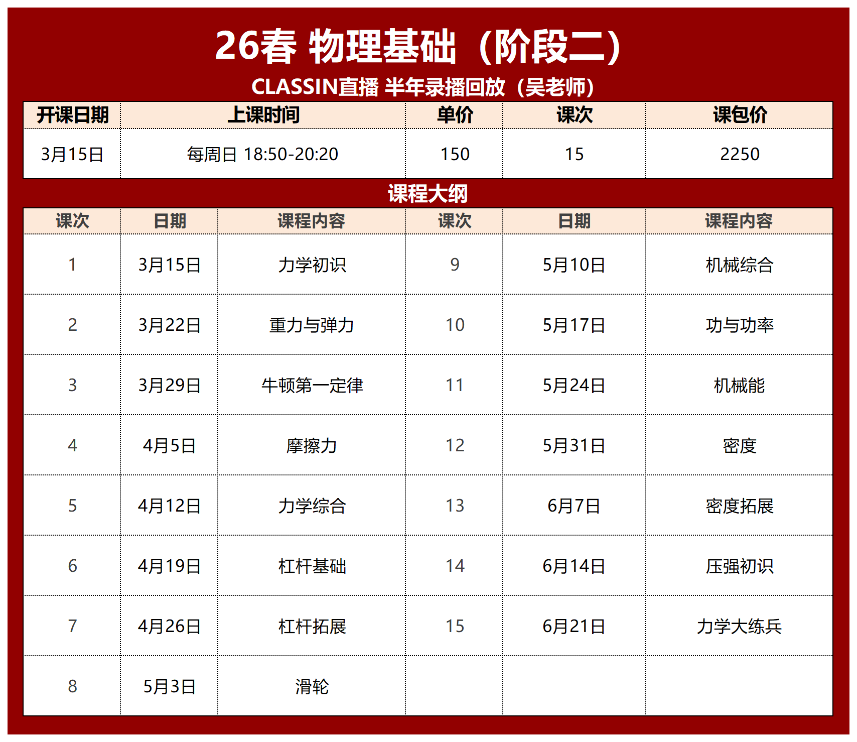 此课程分三期(寒假、春季、暑假)学完整个校内初中物理基础内容,跟校内知识点完全匹配,可作为校内物理的提前预习