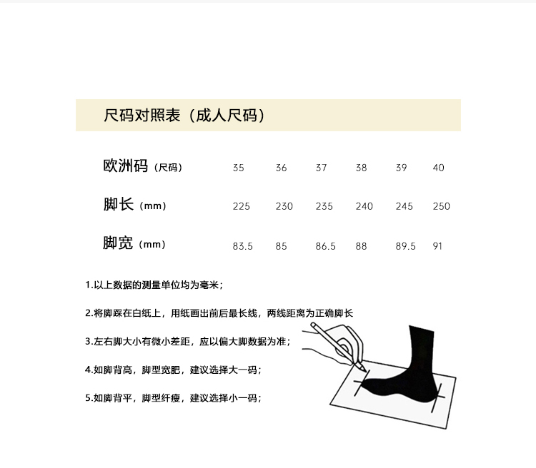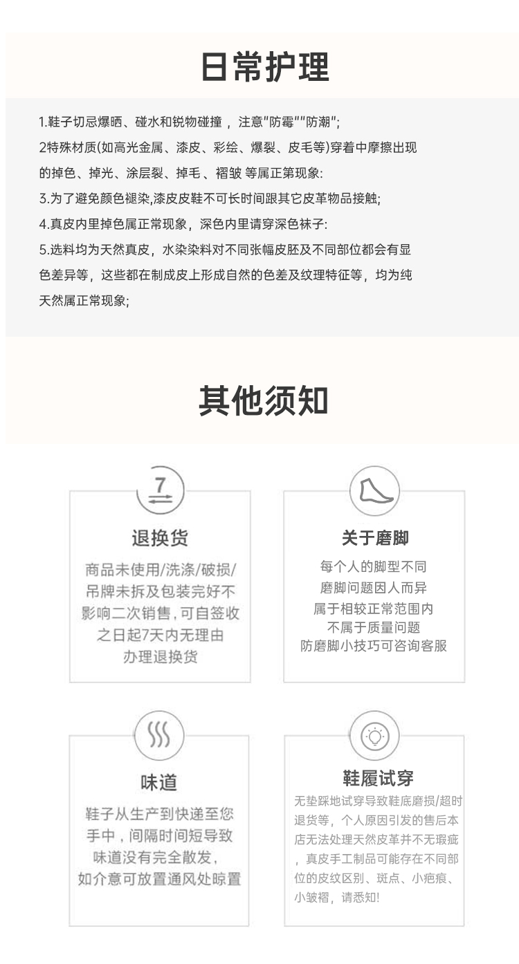 【特别提醒】试穿请用垫子垫好鞋底,在干净的地面上试穿,避免鞋底留下印子影响二次销售。鞋子都是真皮材质,不能水洗,用湿纸巾擦拭即可