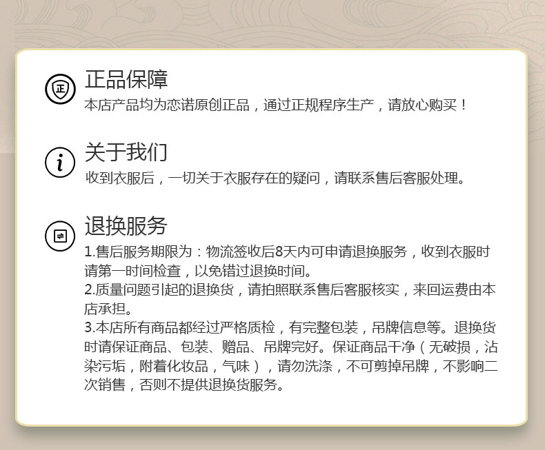 2) 非质量问题售后运费自理,拒收到付件(商品不影响二次销售,包装袋、吊牌需要退回,袋子整洁,表面不能写字和粘胶纸)