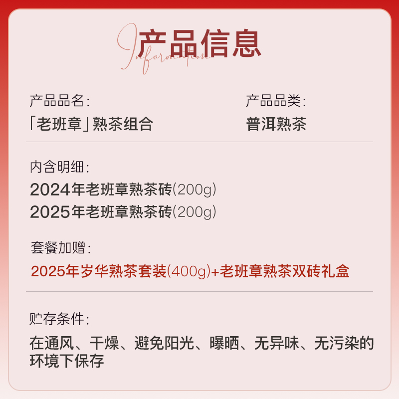 【老班章熟茶套餐】陈升号 2025年陈升老班章熟茶200g+2024年老班章熟茶200g赠送岁华熟茶礼盒1套+双砖礼盒