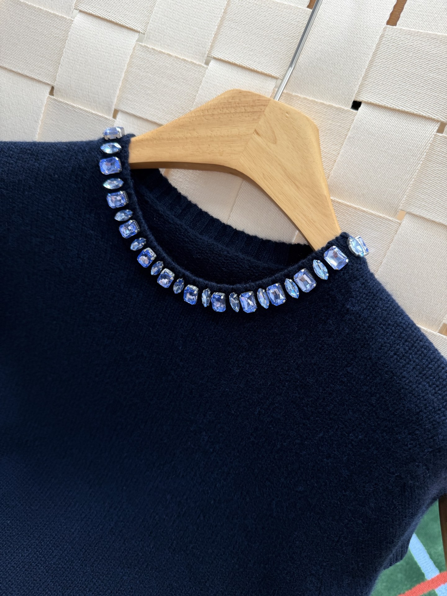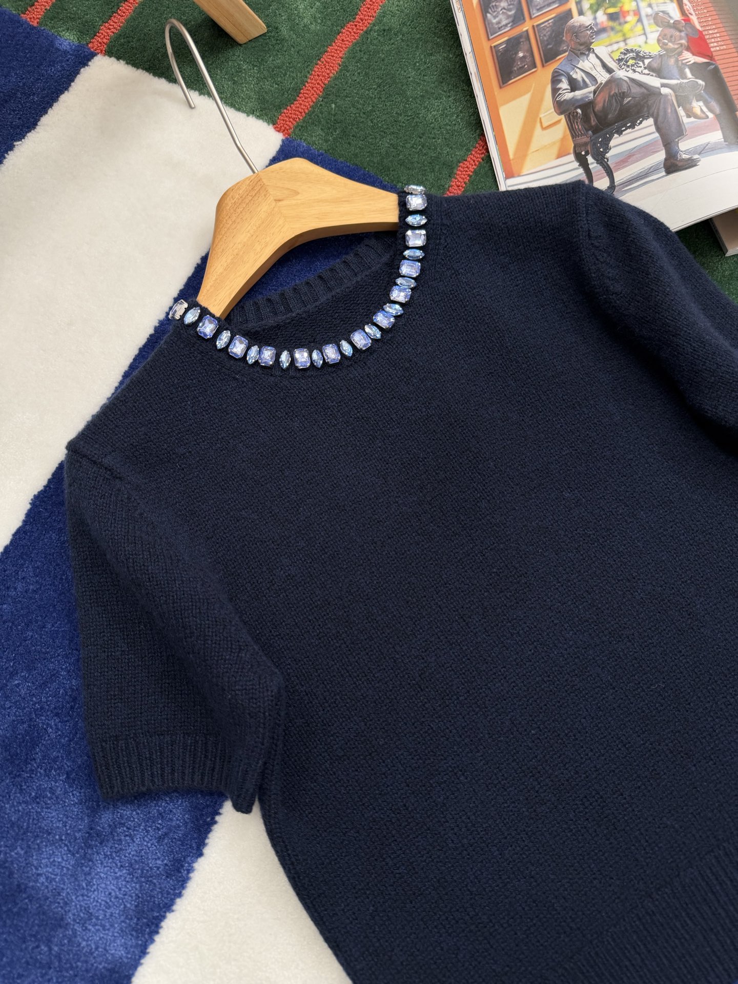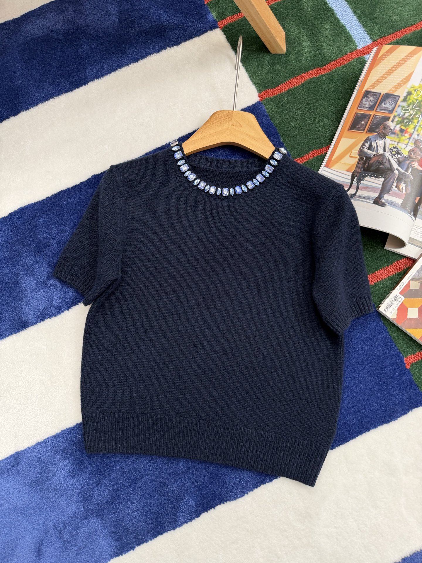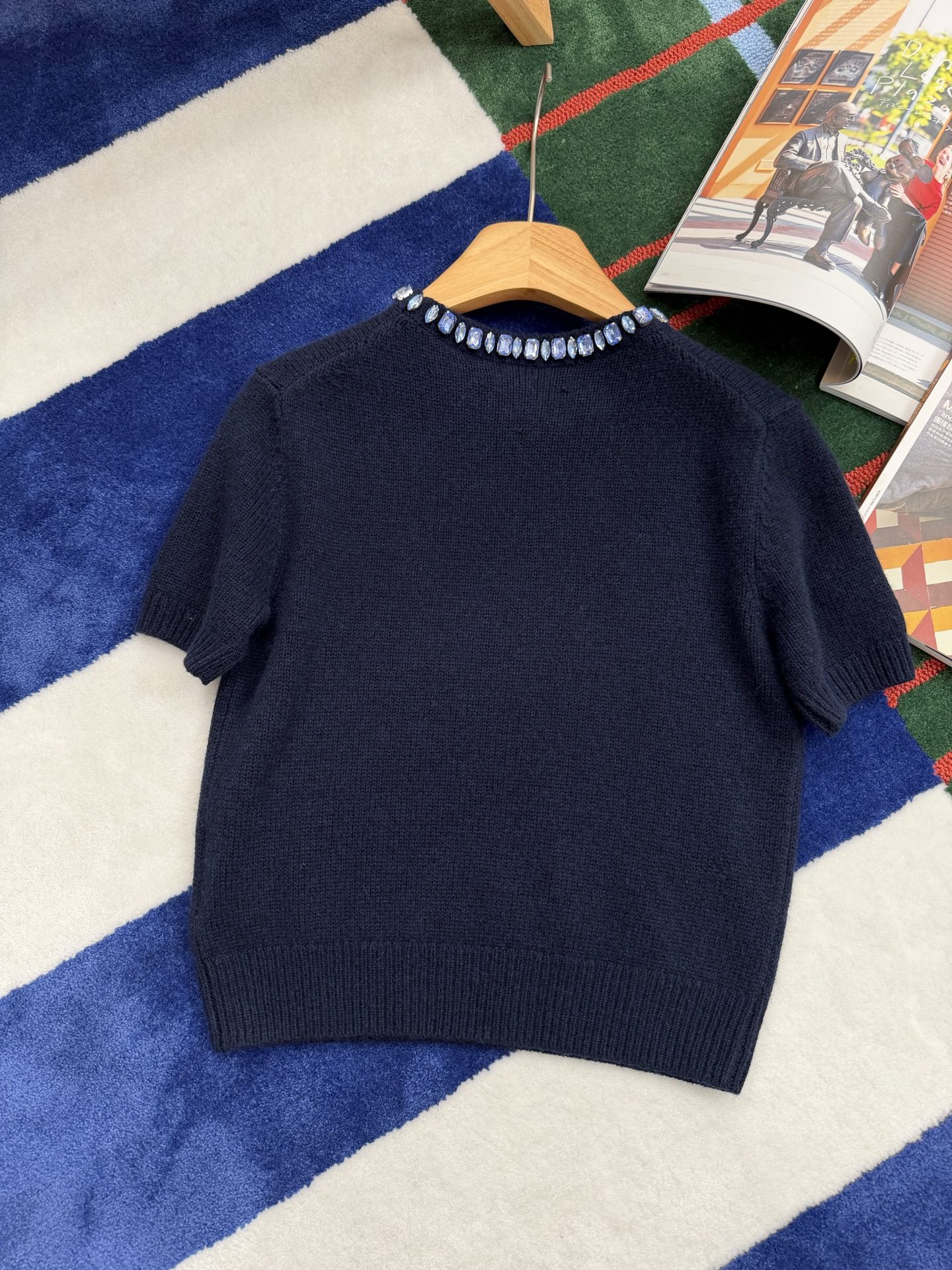最新款 水晶领短袖针织衫💫超时髦,特殊定制定染羊毛➕羊绒混纺纱线,最新的湛蓝色上身真的超级显白‼️搭配扭扭小白T,层次感拉满,妥妥的时髦精✨简约的基调,利落版型剪裁,单穿显瘦叠穿松弛,颈部的蓝色装饰钻简直就是点睛之笔➕既有亮点,又不浮夸,可以说是日常和正式都适配 ✨买到赚到的一款针织衫,你值得拥有,码数SML