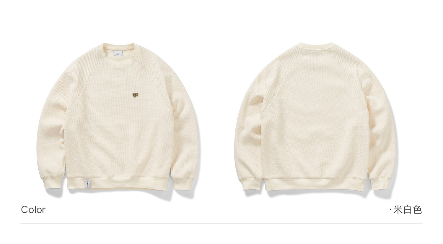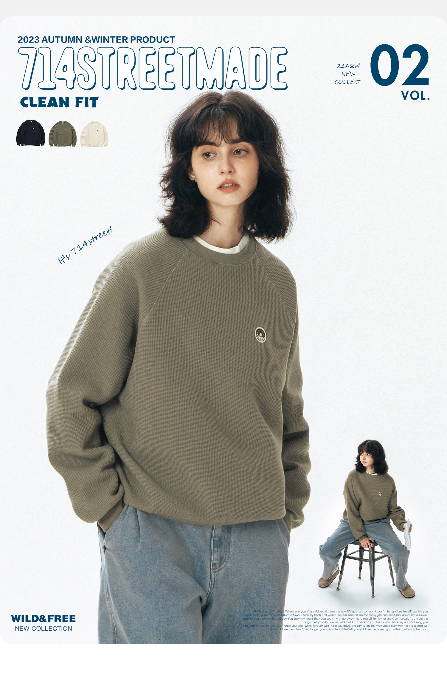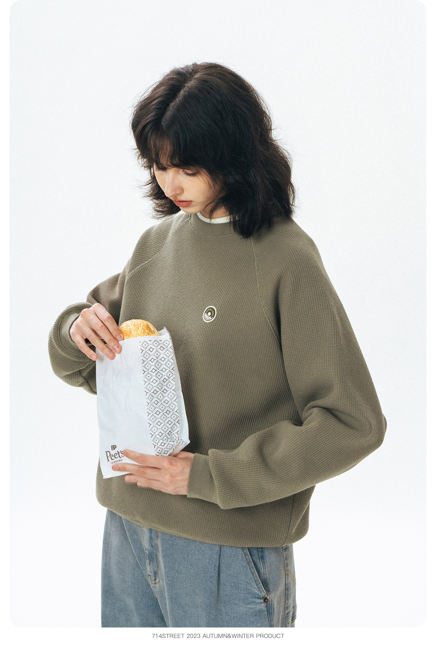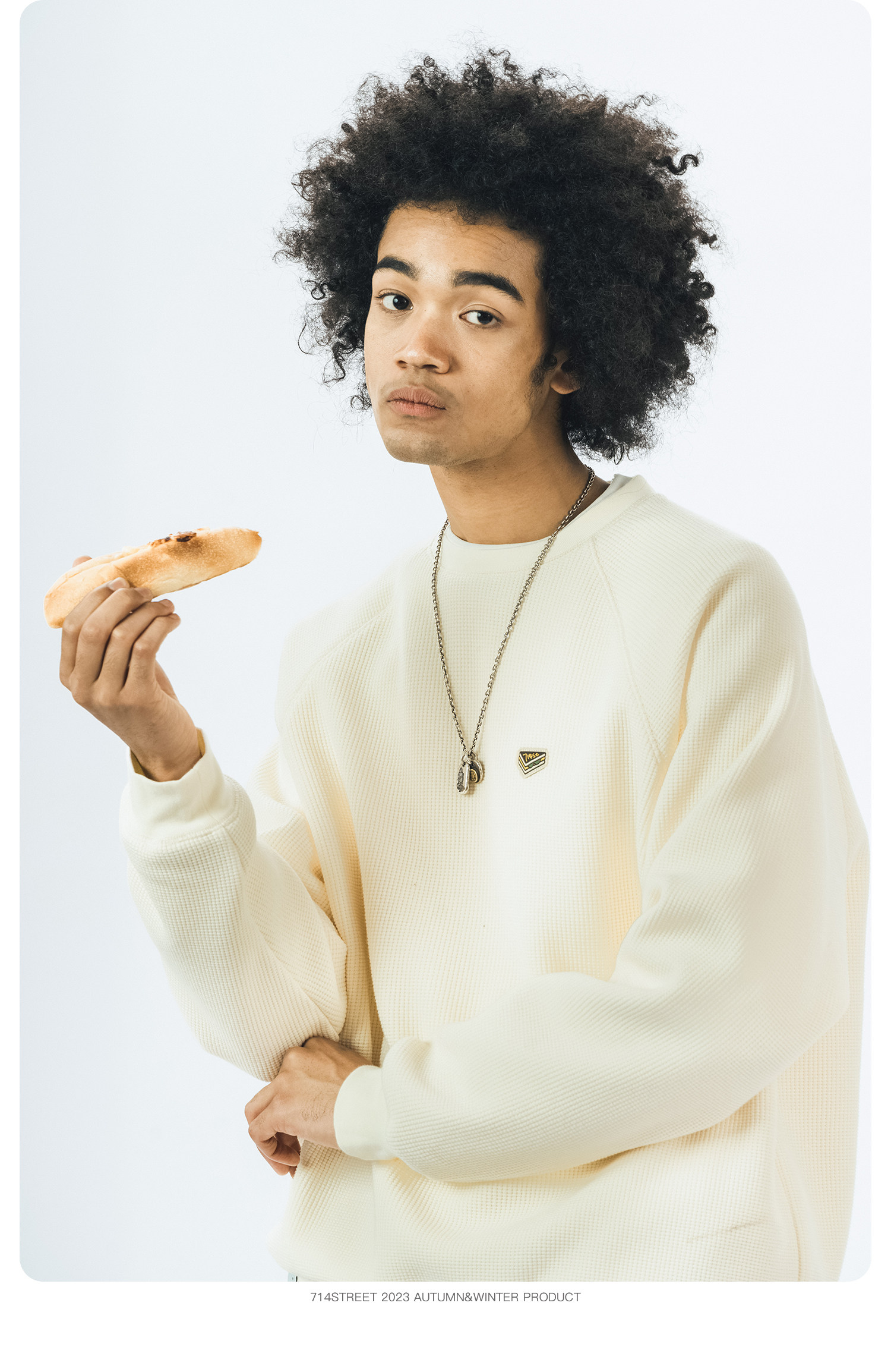 714street华夫格圆领加绒卫衣男女春秋潮牌情侣装日系打底长袖T恤