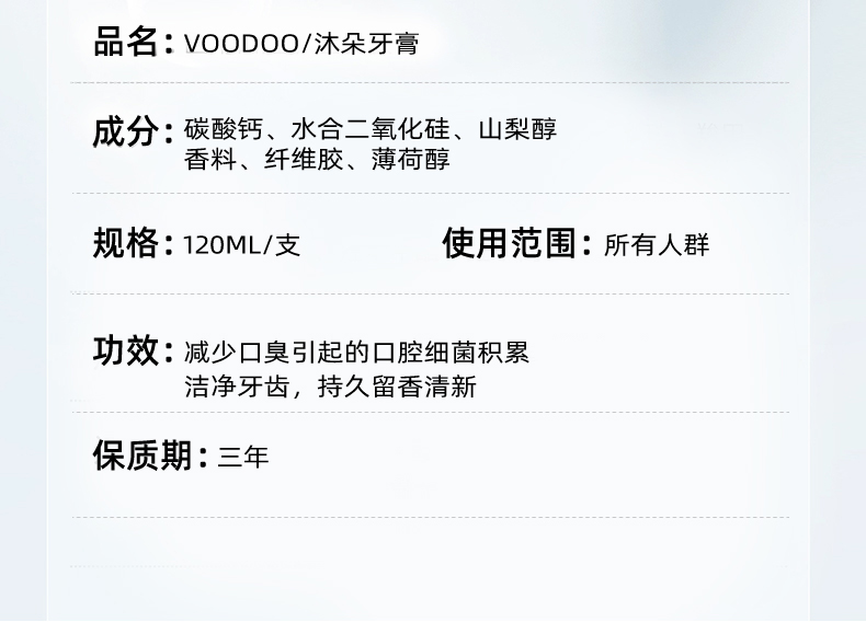 品名:VOODOO牙膏 规格:120ml/支 产地:泰国 发货地:广东 发货时间:下单一般48小时内发货(周末、节假日除外) 发货快递:圆通快递(暂不支持指定快递) 运费模板:该商品全国部分地区包邮(新疆、西藏、港澳台不发货,请知悉) 售后政策:本品包装配件完整、未拆封、不影响二次销售支持7天无理由退换货(无运费险),请知悉 |