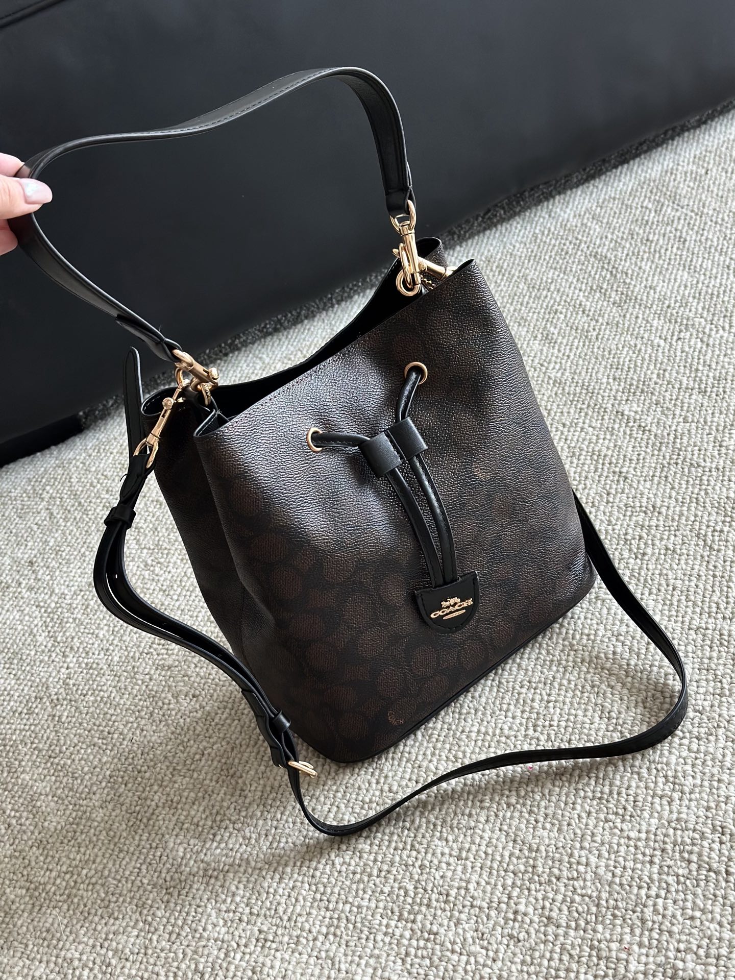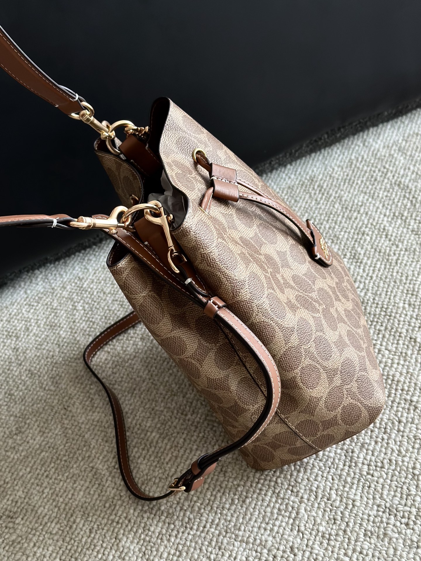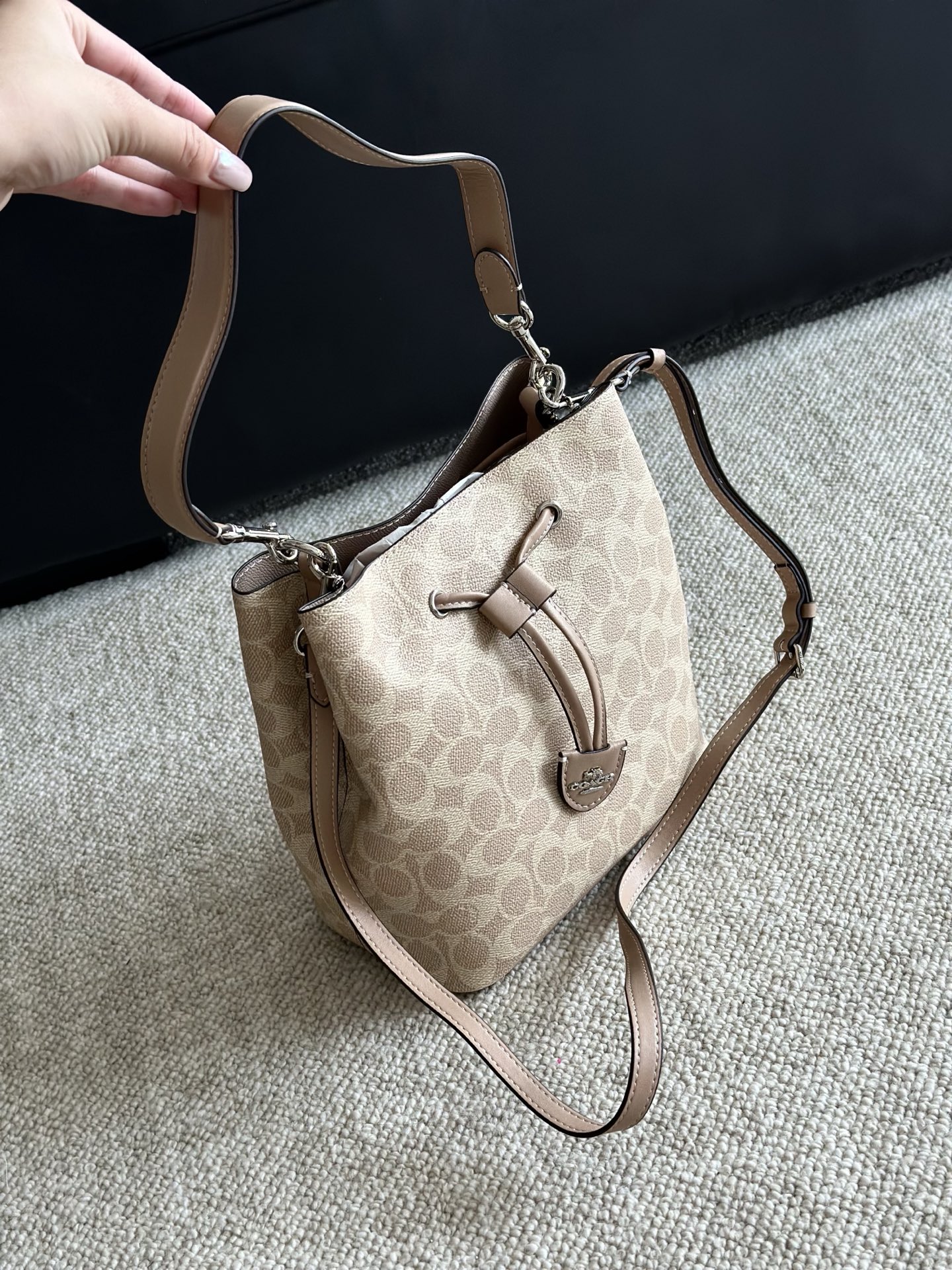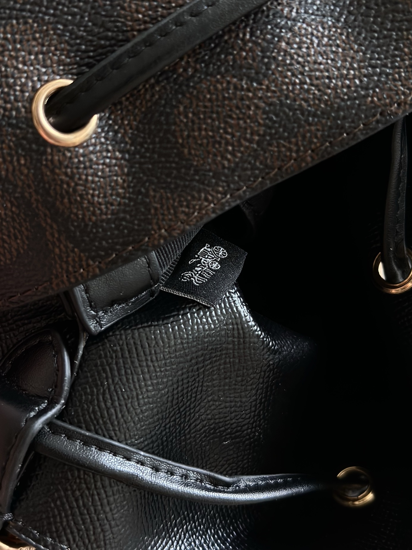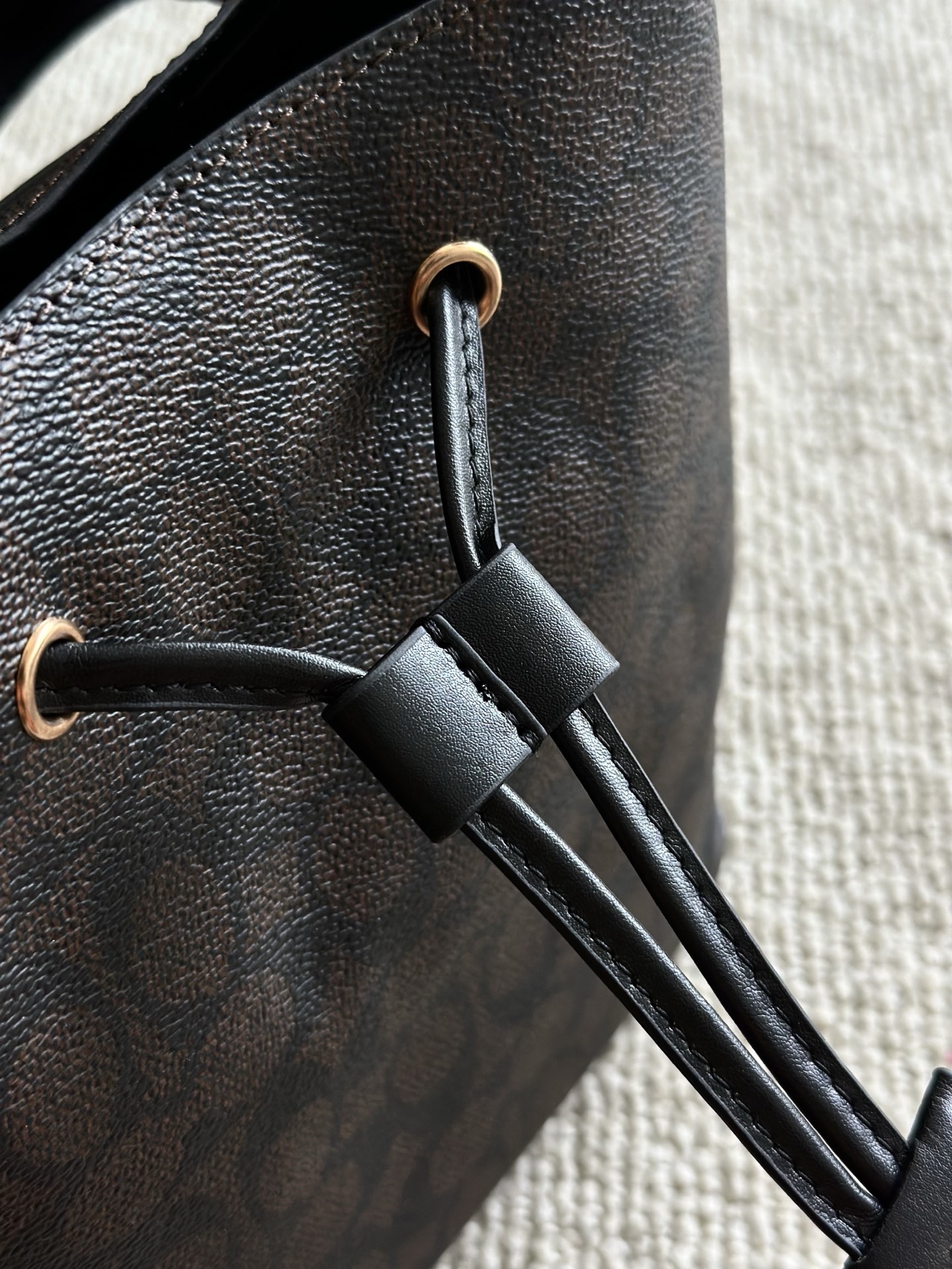6月新品!蔻驰 CBH07 经典老花Rowan抽绳水桶包 子母包搭配可拆卸长短带,可手提腋下单肩斜挎多功能用法,可拆卸拉链手包、中央开放式隔层,抽绳设计开口 ,今天的价格买到就是赚到,摸着都是一种享受!!这种细节一看就知道大厂工艺!coa在我这就是口碑!买过的都知道品质!这款包真的是集时尚与实用于一身,老花复古又百搭,而且款式设计很别致,包身采用柔软的皮质材料,触感舒适且耐用,容量也很可观,非常适合日常出行使用! 尺寸约:长21cm x 高21cm x 宽14cm