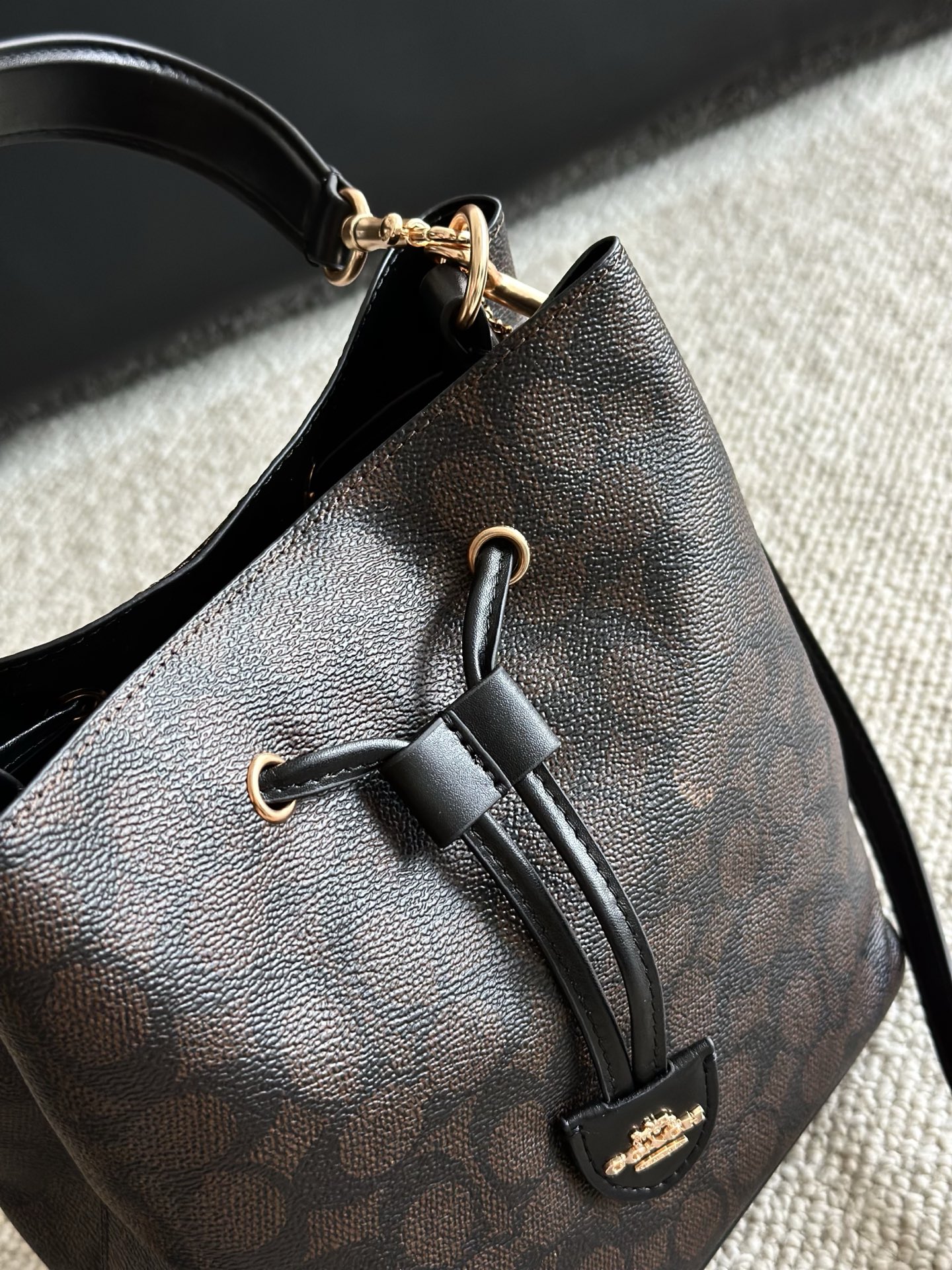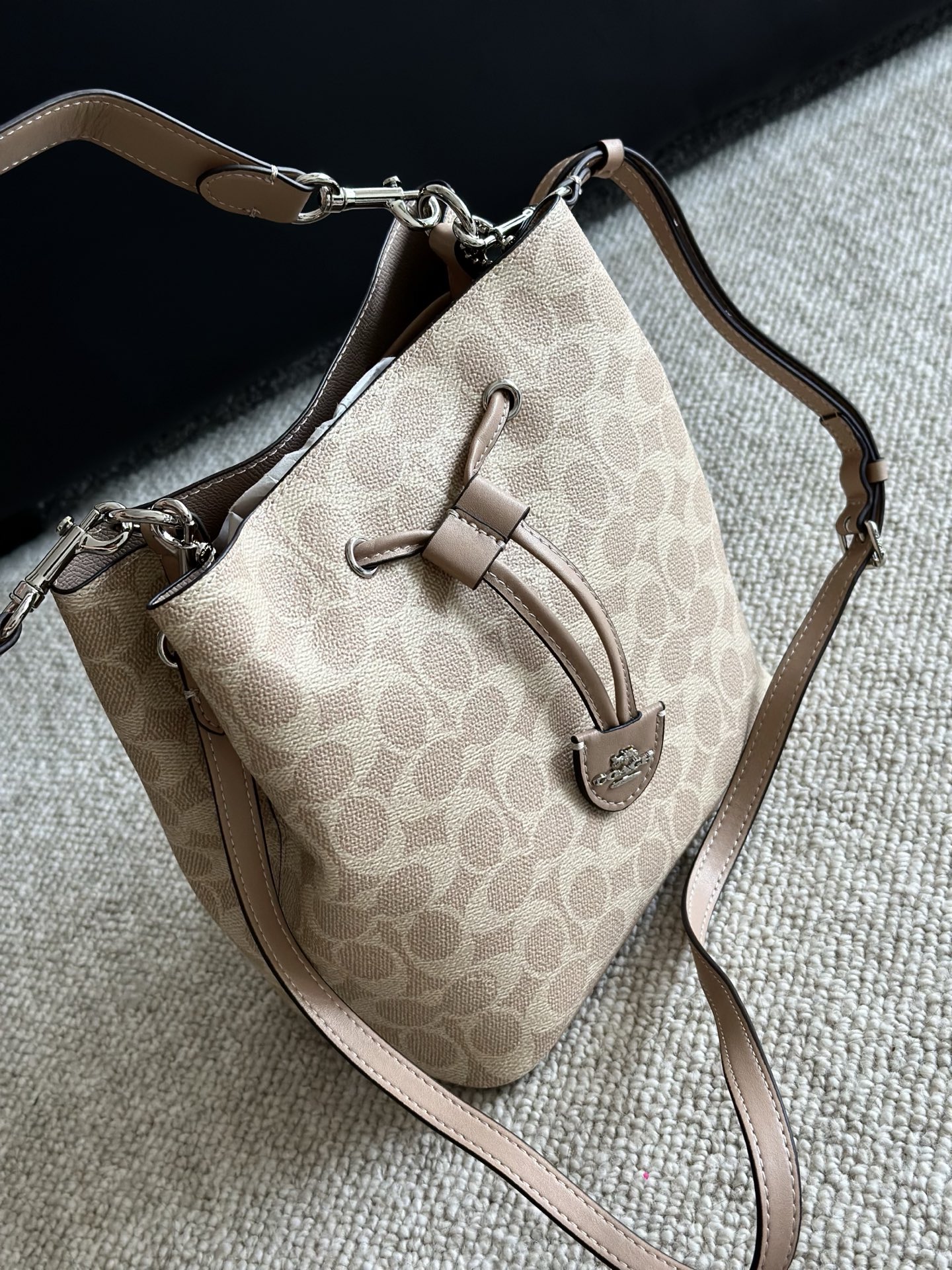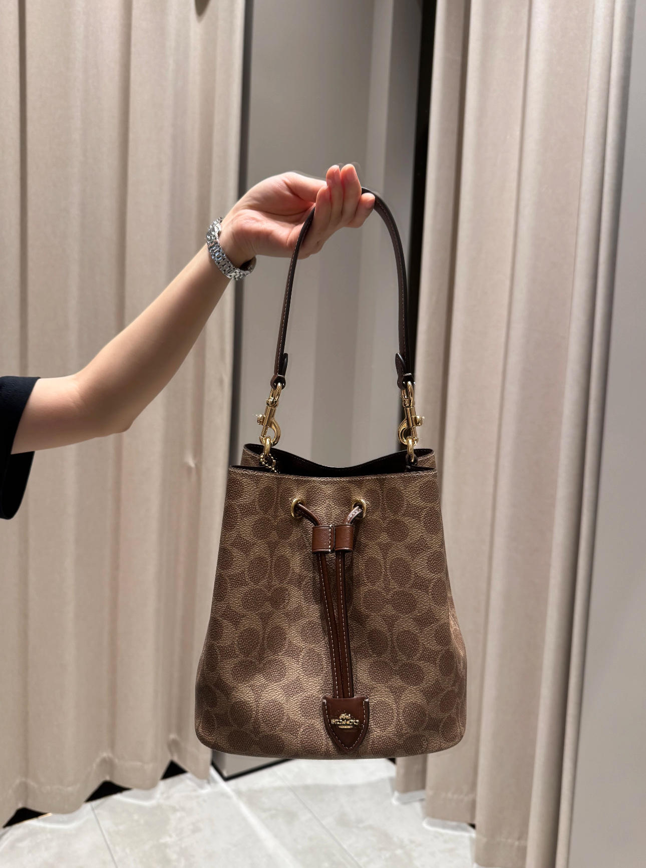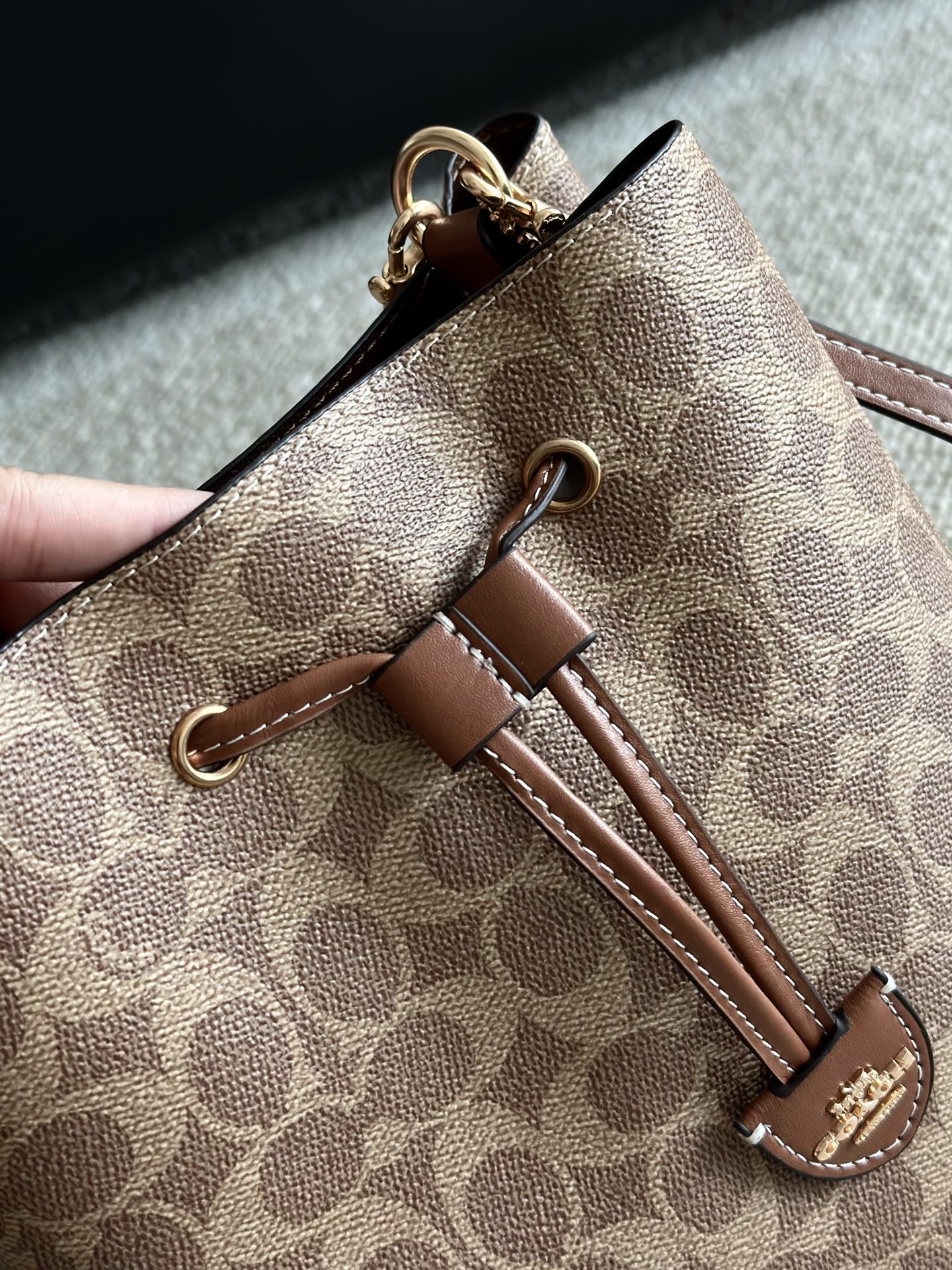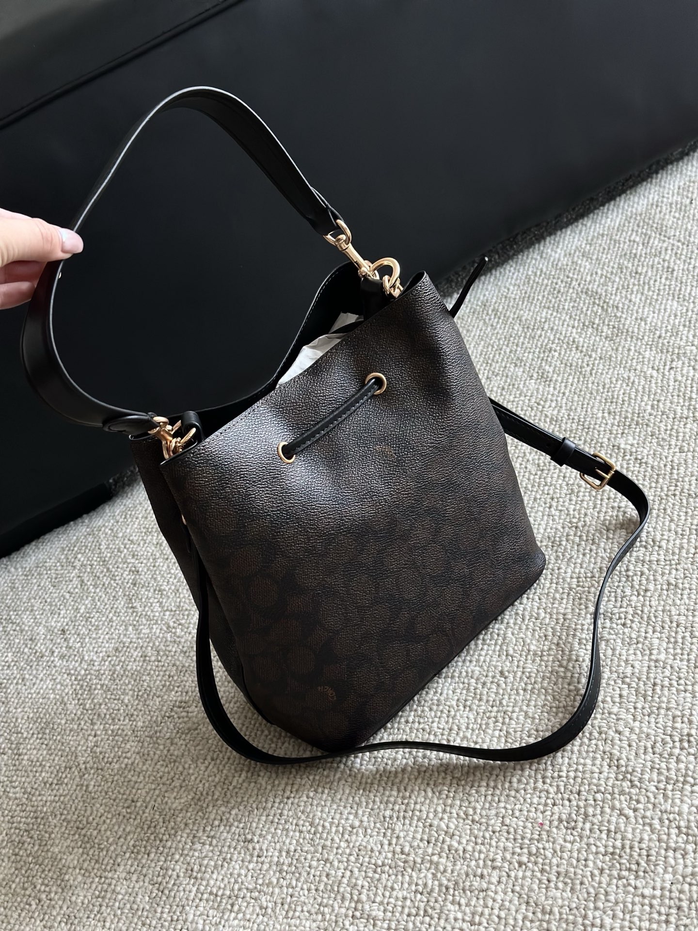 6月新品!蔻驰 CBH07 经典老花Rowan抽绳水桶包 子母包搭配可拆卸长短带,可手提腋下单肩斜挎多功能用法,可拆卸拉链手包、中央开放式隔层,抽绳设计开口 ,今天的价格买到就是赚到,摸着都是一种享受!!这种细节一看就知道大厂工艺!coa在我这就是口碑!买过的都知道品质!这款包真的是集时尚与实用于一身,老花复古又百搭,而且款式设计很别致,包身采用柔软的皮质材料,触感舒适且耐用,容量也很可观,非常适合日常出行使用! 尺寸约:长21cm x 高21cm x 宽14cm